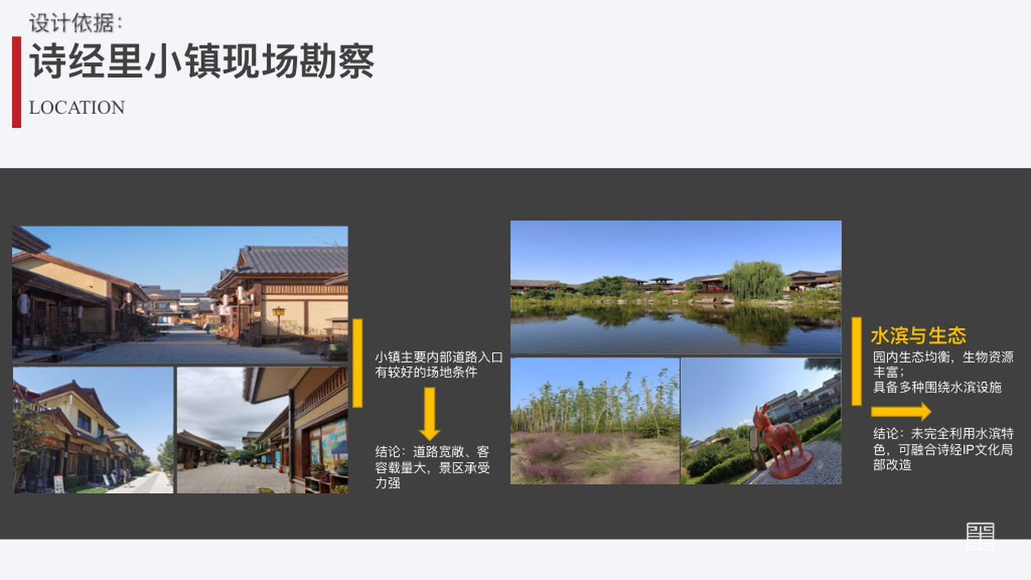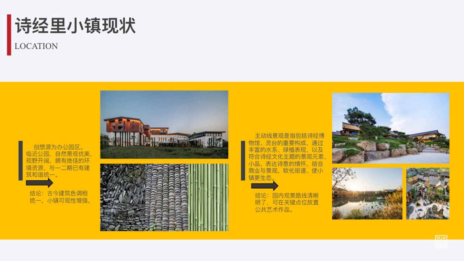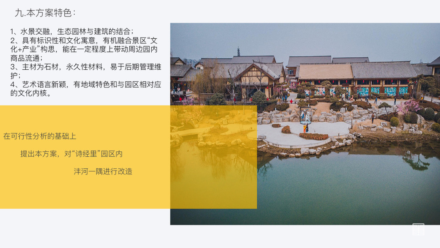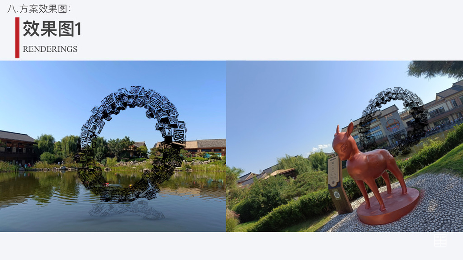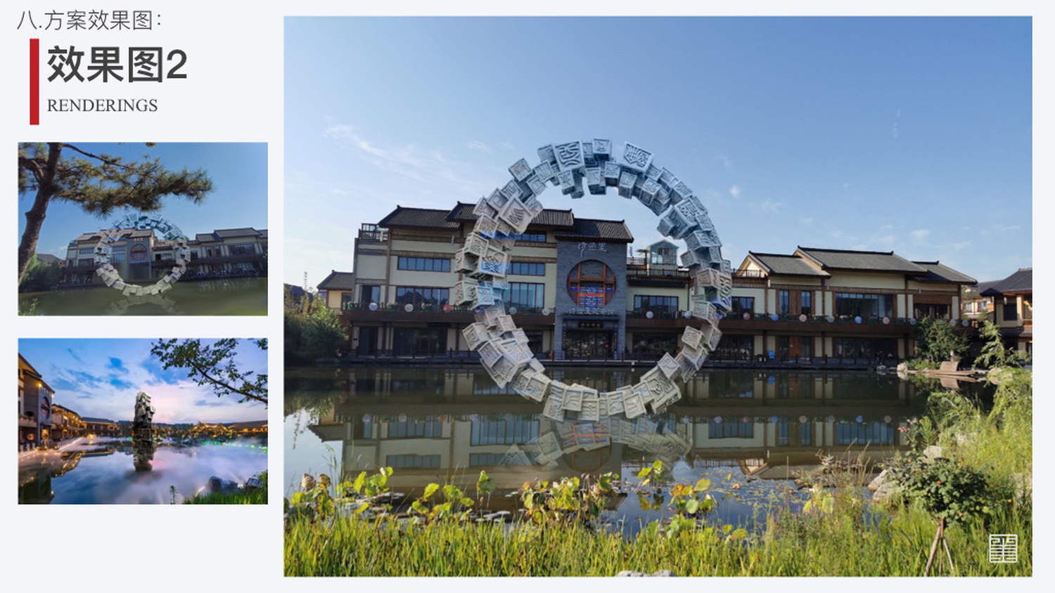 综上,本方案水景交融,体现了生态园林与建筑的结合;开发具有标识性和文化寓意,有机融合景区“文化+产业”构思,能在一定程度上带动周边园内商品流通;主材为石材,永久性材料,易于后期管理维护;艺术语言新颖,有地域特色和与园区相对应的文化内核。是《诗经》IP与主题小镇与现代艺术的碰撞。