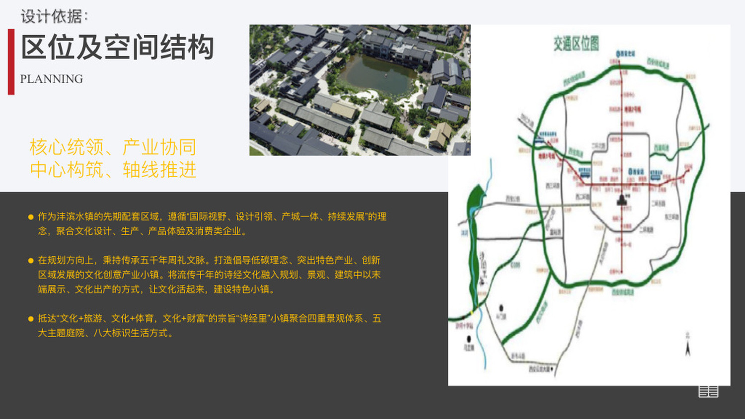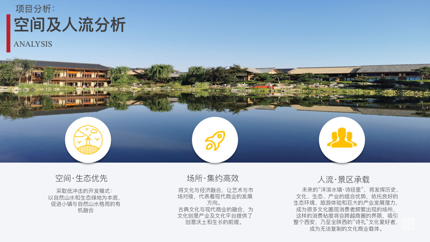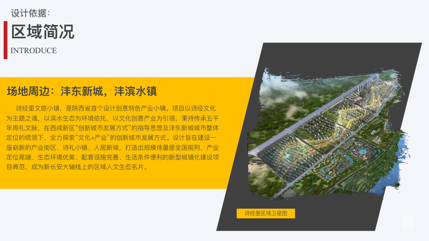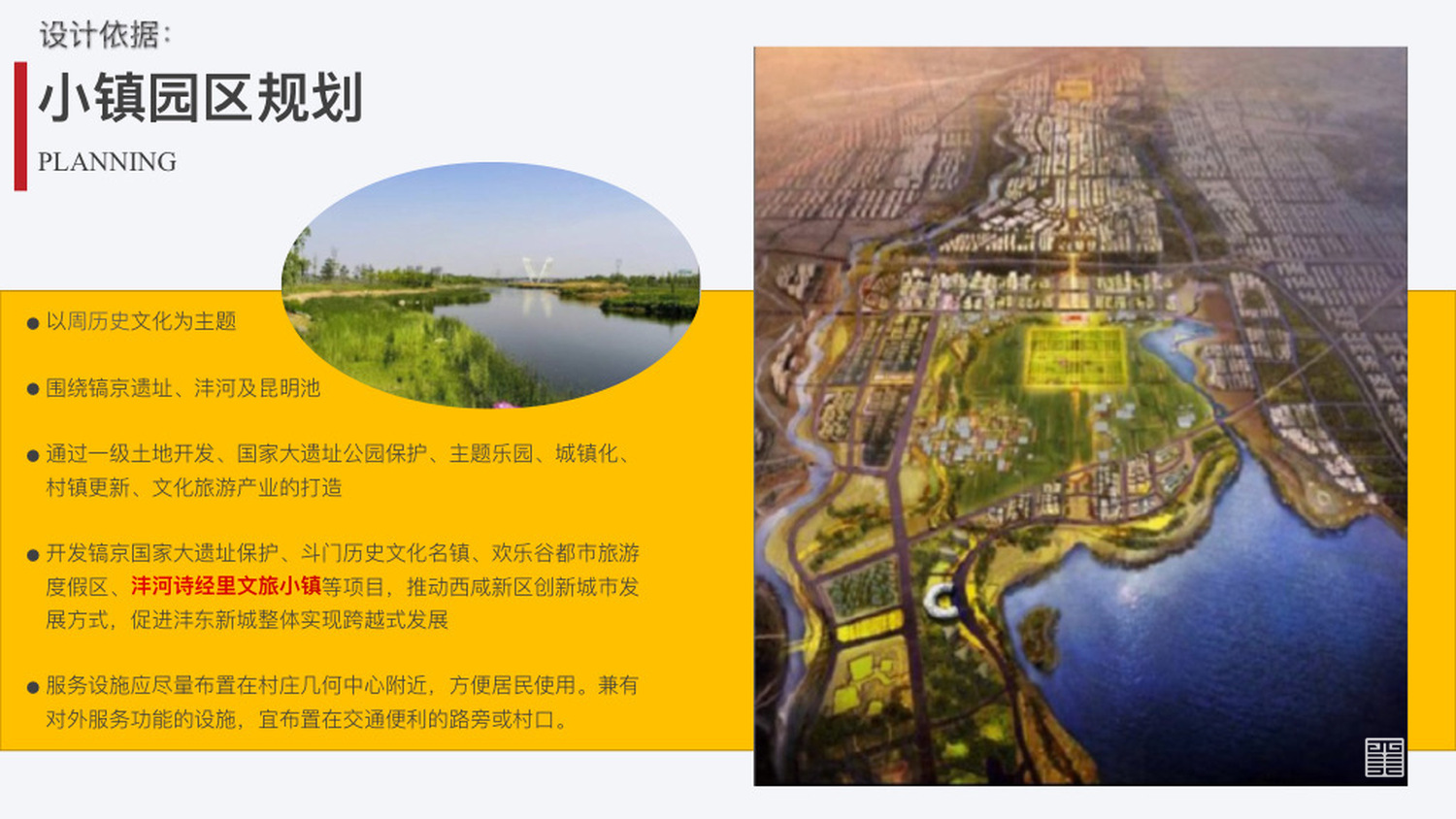 诗经里文旅小镇,是陕西省首个设计创意特色产业小镇。项目以诗经文化为主题之魂,以滨水生态为环境依托,以文化创意产业为引领,秉持传承五千年周礼文脉,在西咸新区“创新城市发展方式”的指导思想及沣东新城城市整体定位的统领下,全力探索“文化+产业”的创新城市发展方式。设计旨在建设一座崭新的产业街区、诗礼小镇、人居新城,打造出规模体量居全国前列,产业定位高端、生态环境优美、配套设施完善、生活条件便利的新型城镇化建设项目典范,成为新长安大轴线上的区域人文生态名片。