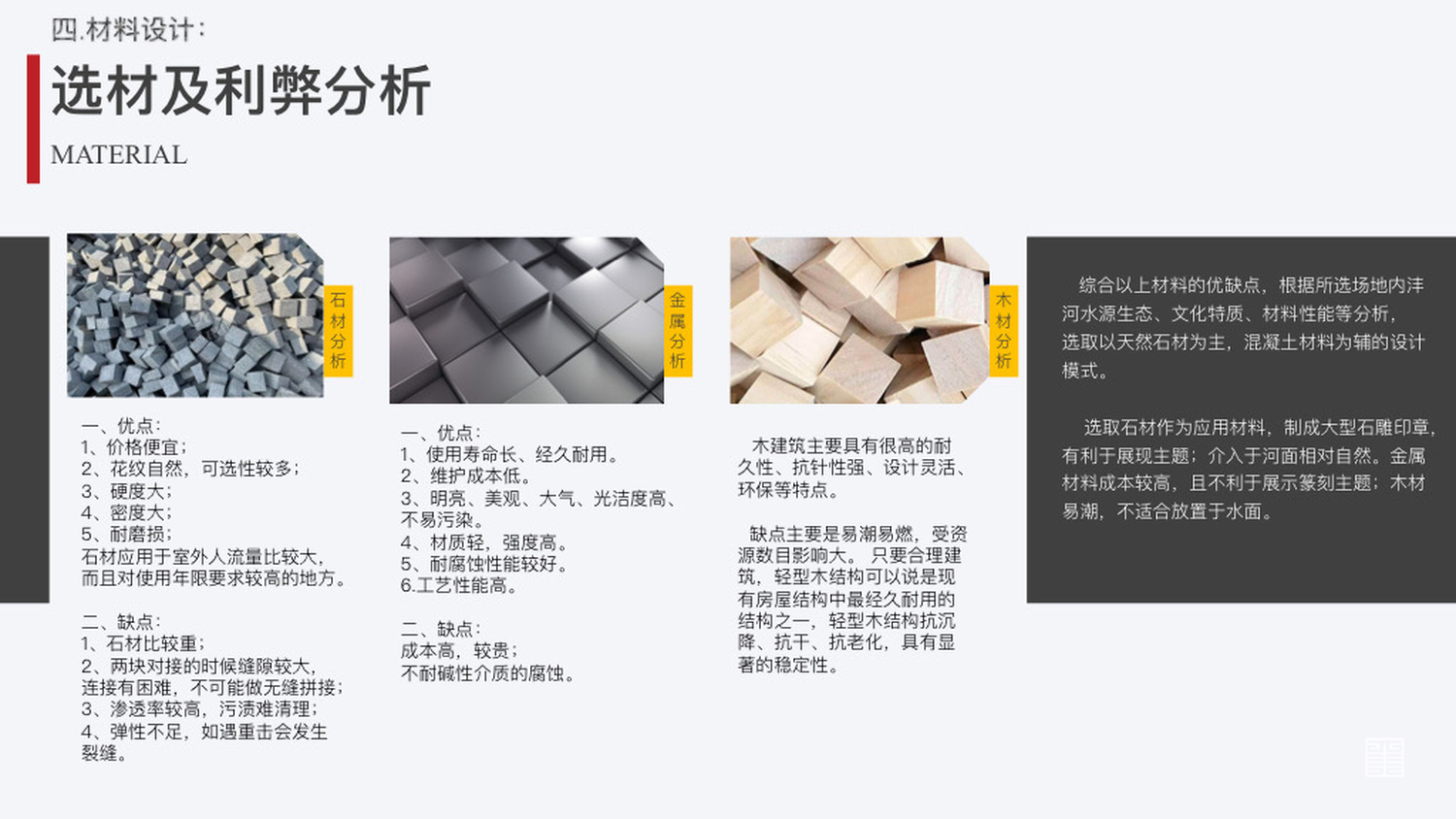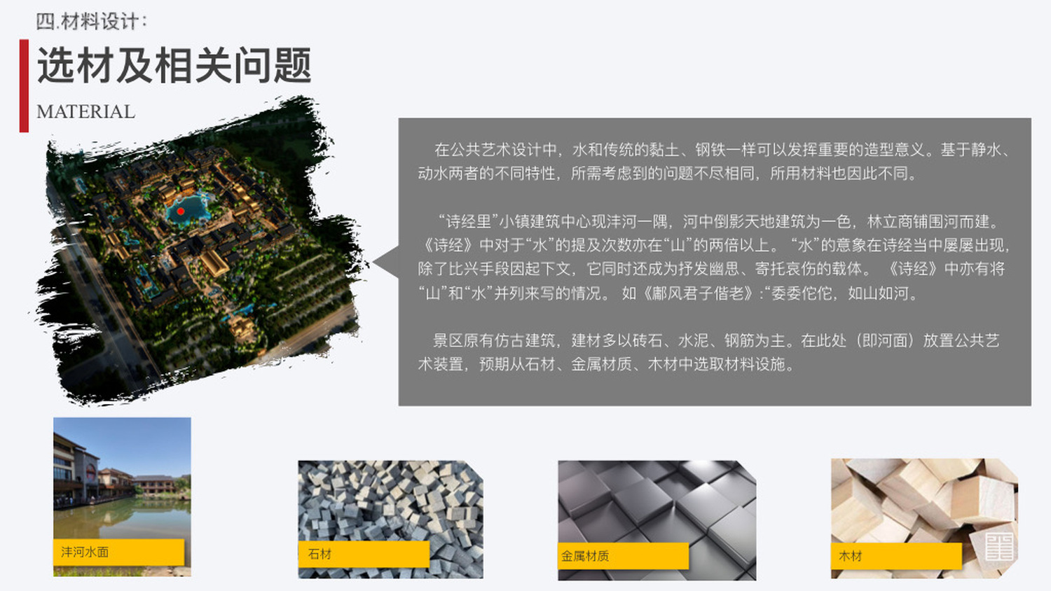 在公共艺术设计的选材中,水和传统的黏土、钢铁一样可以发挥重要的造型意义。基于静水、动水两者的不同特性,所需考虑到的问题不尽相同,所用材料也因此不同。“诗经里”小镇建筑中心现沣河一隅,河中倒影天地建筑为一色,林立商铺围河而建。《诗经》中对于“水”的提及次数亦在“山”的两倍以上。 “水”的意象在诗经当中屡屡出现,除了比兴手段因起下文,它同时还成为抒发幽思、寄托哀伤的载体。 《诗经》中亦有将“山”和“水”并列来写的情况。 如《鄘风君子偕老》:“委委佗佗,如山如河。在此处(即河面)放置公共艺术装置,预期从石材、金属材质、木材中选取材料设施。权衡利弊,选取石材作为应用材料,制成大型石雕印章,有利于展现主题;介入于河面相对自然。金属材料成本较高,且不利于展示篆刻主题;木材易潮,不适合放置于水面。