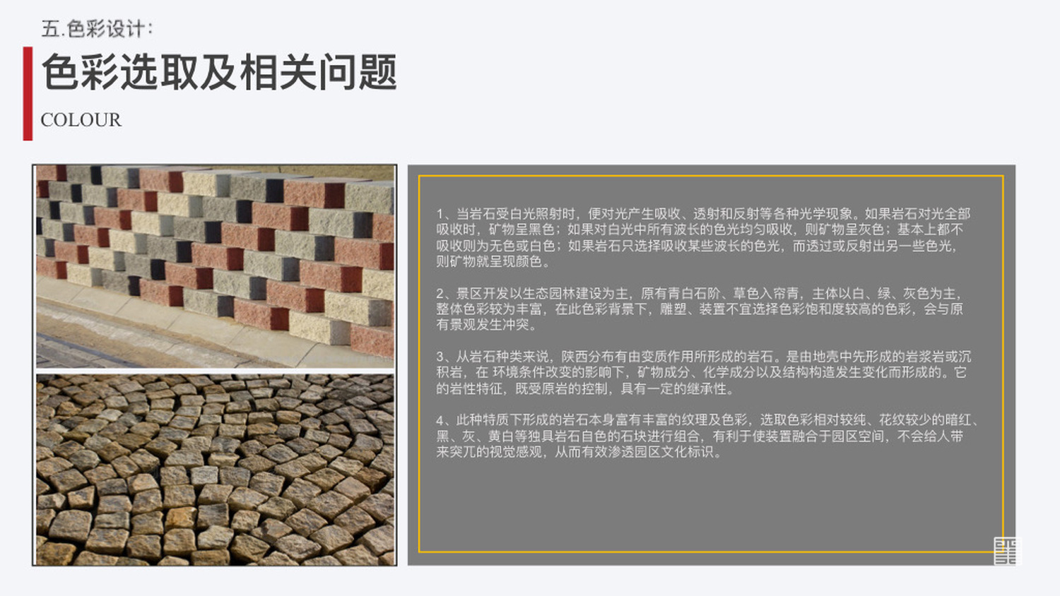 在色彩选择方面。当岩石受白光照射时,便对光产生吸收、透射和反射等各种光学现象。如果岩石对光全部吸收时,矿物呈黑色;如果对白光中所有波长的色光均匀吸收,则矿物呈灰色;基本上都不吸收则为无色或白色;如果岩石只选择吸收某些波长的色光,而透过或反射出另一些色光,则矿物就呈现颜色。景区开发以生态园林建设为主,青白石阶、草色入帘青,主体以白、绿、灰色为主,整体色彩较为丰富,在此色彩背景下,雕塑、装置不宜选择色彩饱和度较高的色彩,会与原有景观发生冲突。从岩石种类来说,陕西分布有由变质作用所形成的岩石。是由地壳中先形成的岩浆岩或沉积岩,在 环境条件改变的影响下,矿物成分、化学成分以及结构构造发生变化而形成的。它的岩性特征,既受原岩的控制,具有一定的继承性。此种特质下形成的岩石本身富有丰富的纹理及色彩,选取色彩相对较纯、花纹较少的暗红、黑、灰、黄白等独具岩石自色的石块进行组合,有利于使装置融合于园区空间,不会给人带来突兀的视觉感观,从而有效渗透园区文化标识。