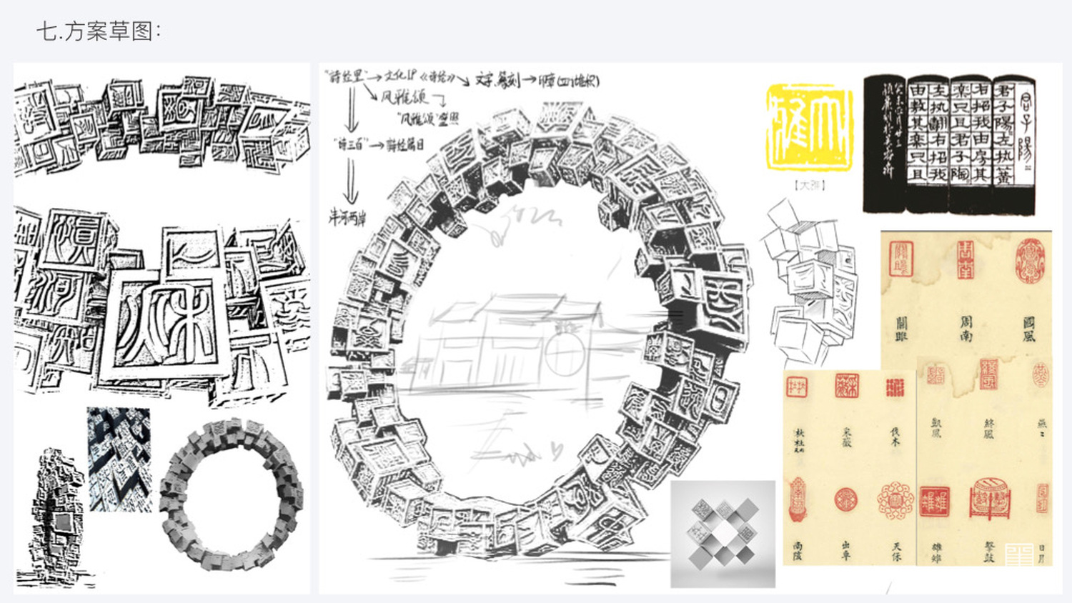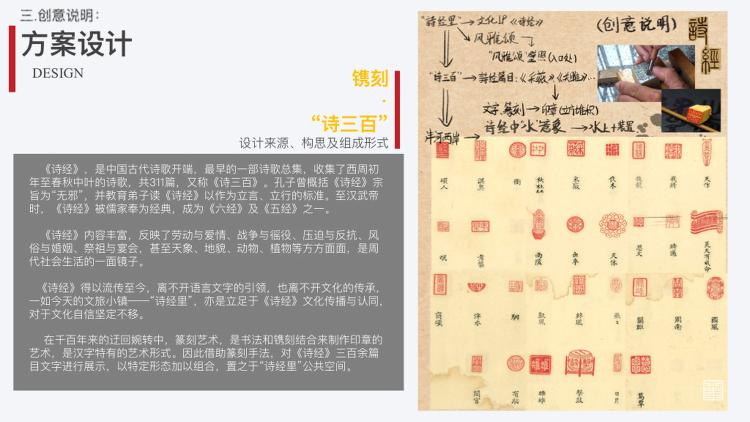 《诗经》,是中国古代诗歌开端,最早的一部诗歌总集,收集了西周初年至春秋中叶的诗歌,共311篇,又称《诗三百》。孔子曾概括《诗经》宗旨为“无邪”,并教育弟子读《诗经》以作为立言、立行的标准。至汉武帝时,《诗经》被儒家奉为经典,成为《六经》及《五经》之一。《诗经》内容丰富,反映了劳动与爱情、战争与徭役、压迫与反抗、风俗与婚姻、祭祖与宴会,甚至天象、地貌、动物、植物等方方面面,是周代社会生活的一面镜子。《诗经》得以流传至今,离不开语言文字的引领,也离不开文化的传承,一如今天的文旅小镇——“诗经里”,亦是立足于《诗经》文化传播与认同,对于文化自信坚定不移。 在千百年来的迂回婉转中,篆刻艺术,是书法和镌刻结合来制作印章的艺术,是汉字特有的艺术形式。因此借助篆刻手法,对《诗经》三百余篇目文字进行展示,以特定形态加以组合,置之于“诗经里”公共空间。