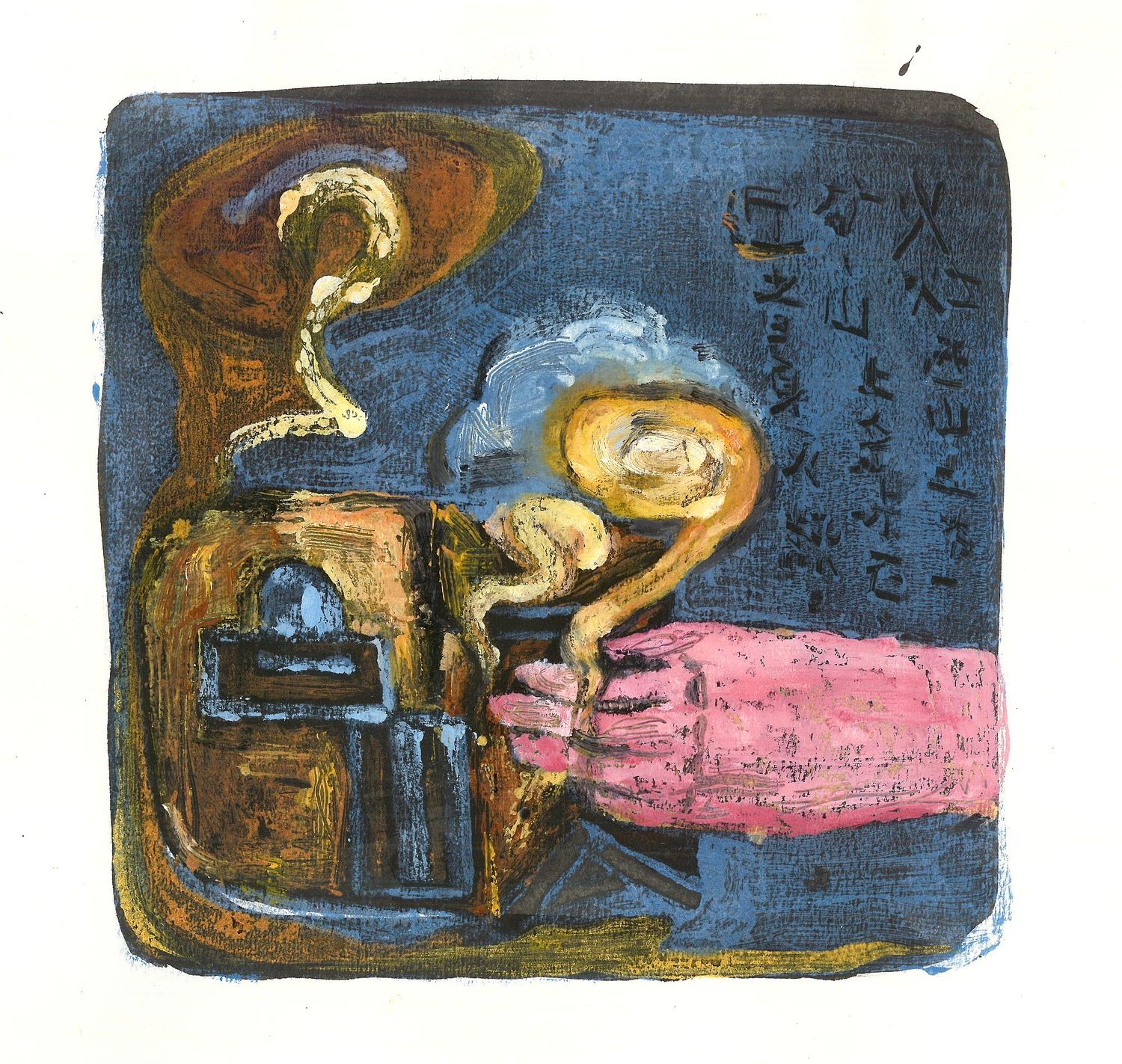 此作品运用转印技法,作品中会出现不一样的物品造出的肌理,以及不一样的配色呈现出不一样的效果。