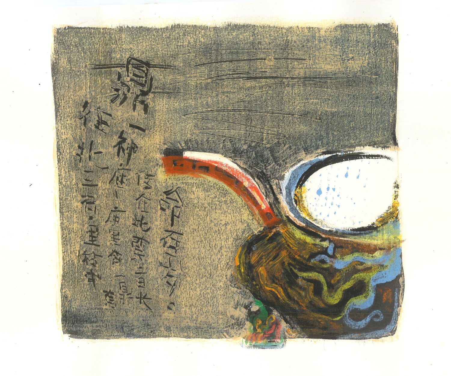 此作品运用转印技法,作品中会出现不一样的物品造出的肌理,以及不一样的配色呈现出不一样的效果。