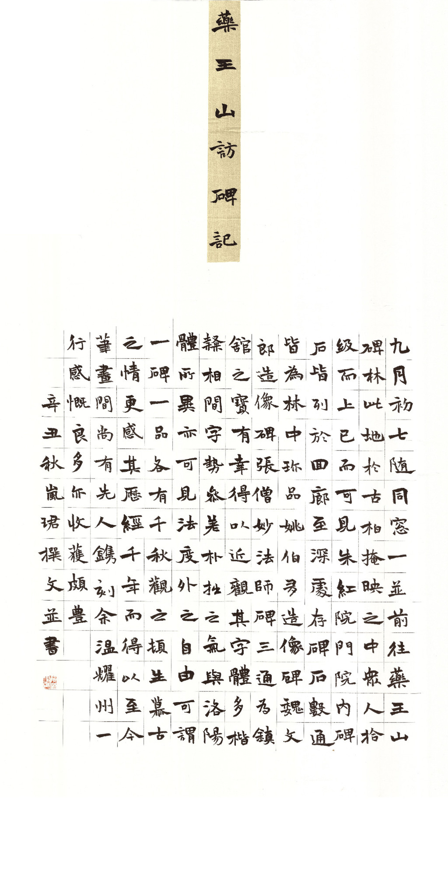 九月初七随同窗一并前往药王山碑林,此地于古柏掩映之处。众人拾级而上,已而可见朱红院门。院内碑石皆列于回廊,至深处殿内存碑石数通。皆为林中精品,姚伯多造像碑、魏文郎造像碑、张僧妙法师碑三通为镇馆之宝,有幸得以近观 。其字体多楷隶相间,朴拙之气与洛阳体所异,亦可见法度外之自由。观之,顿生慕古之情 。亦感其历经千年而得以至今,笔画间尚有先人镌刻余温。耀州一行感慨良多亦收获颇丰,辛丑秋岚珺撰文并书。