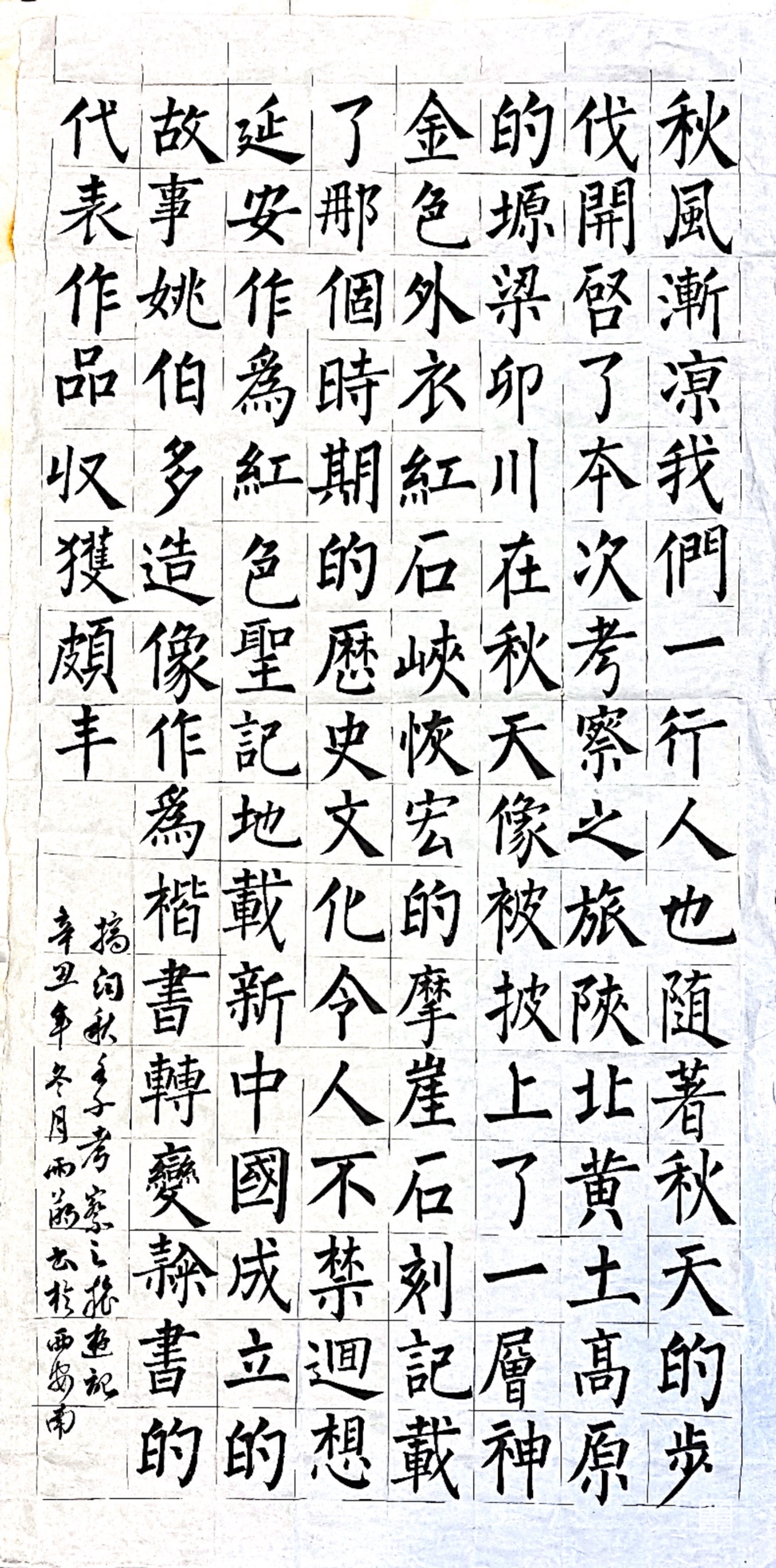 秋风渐凉,随着秋天的步伐我们2019一行人在两位老师的带领下踏上了此次考察之旅,陕北独特的地质风貌和人文文化令人期待,红石峡恢弘的大字摩崖石刻,药王山一个看起来名不见经传的地方,却有着全国第五的碑林,《姚伯多造像》作为隶书向楷书过渡的重要碑帖,有重要的历史价值。柳公权《大唐回元观钟楼铭》严谨又不失趣味性,都令我留下了深刻的印象。