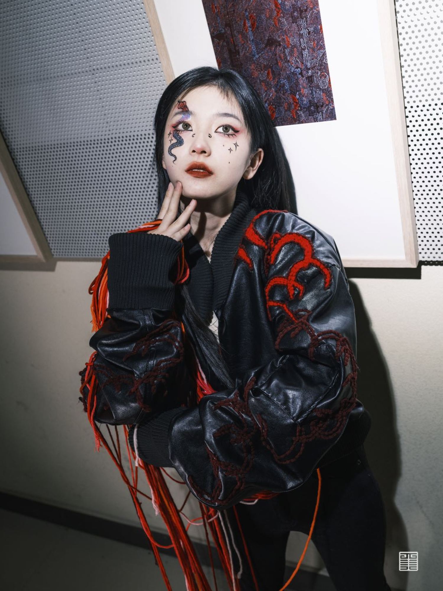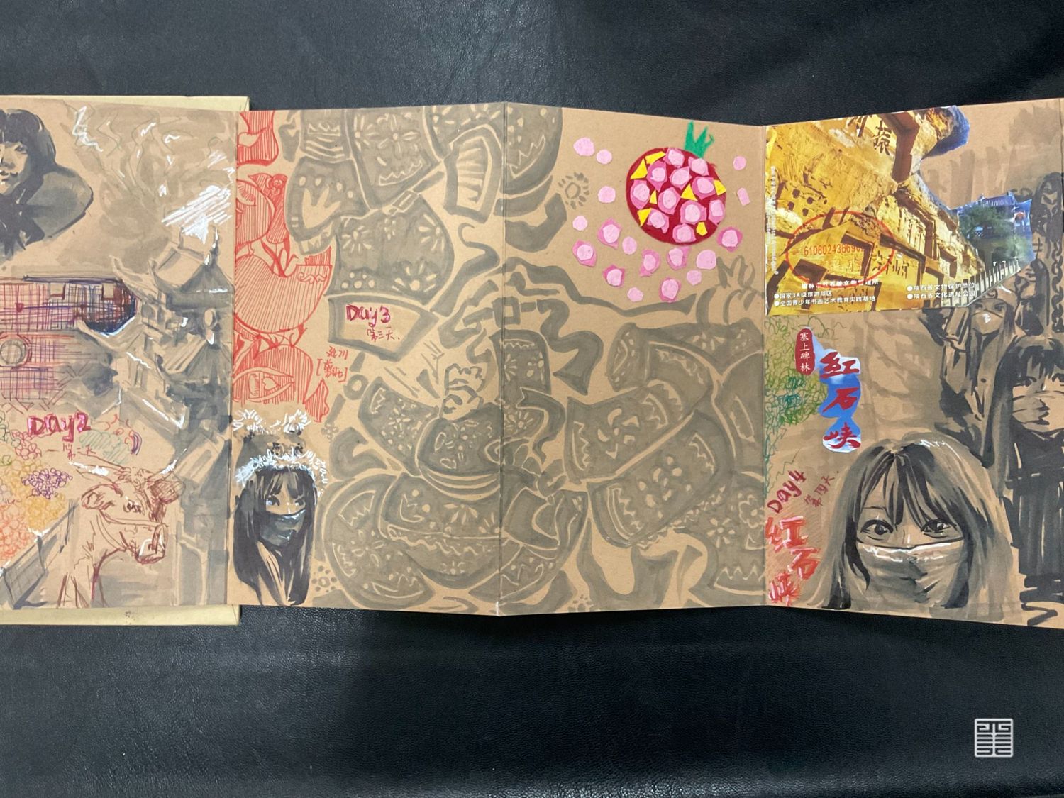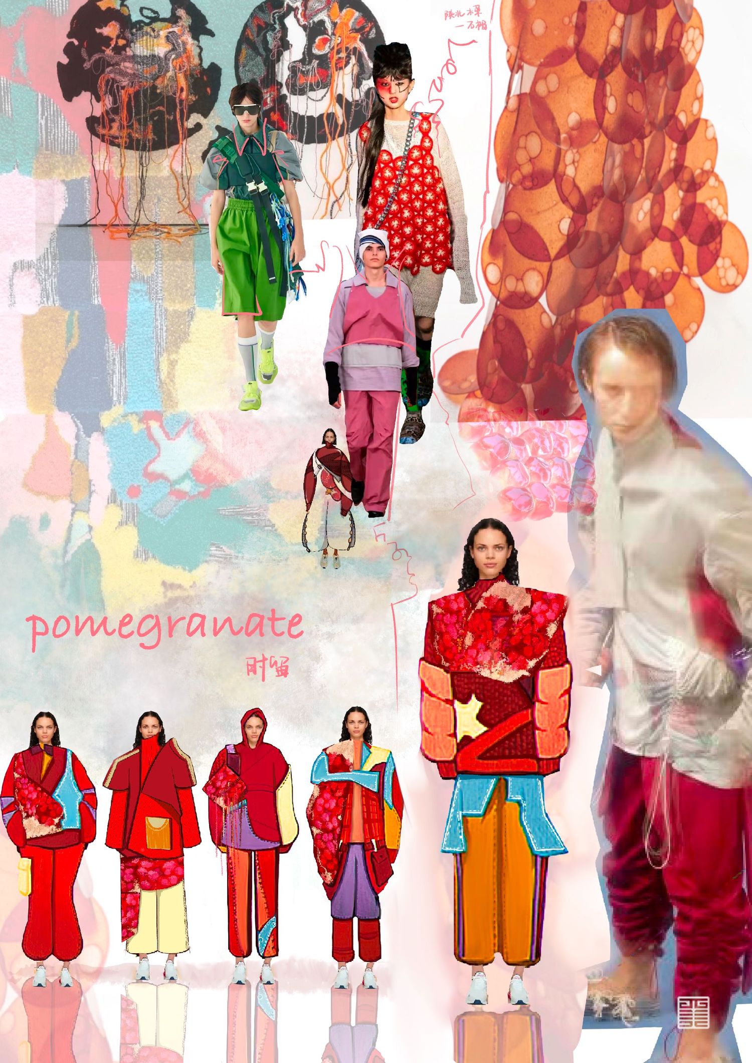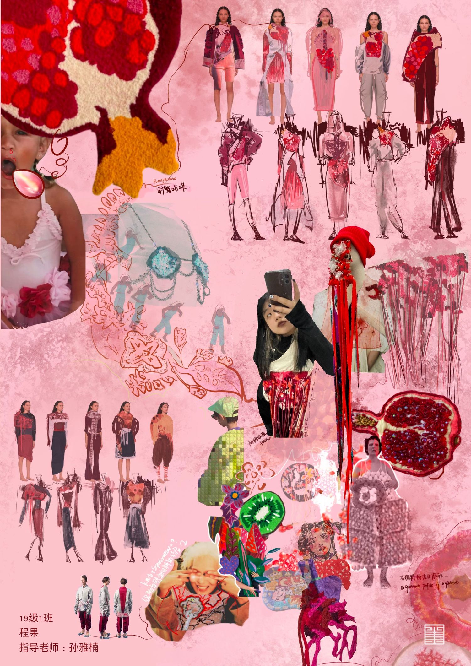 个人作业主题为陕西特色水果石榴,根据其颜色和造型特点提取廓形,结合创意运动装设计一系列石榴特色的服装,名为时留。将陕西最丰收的果实表现出来。小组成衣作品以民俗中的五毒作为灵感来源,分别是蛇、蝎、蜈蚣、壁虎、蟾蜍,谷雨以后气温升高,病虫害进入高繁衍期,为了减轻虫害对作物及人的伤害,农家一边进田灭虫,一边张贴谷雨贴,进行驱凶纳吉的祈祷。这一习俗在陕西一带十分流行。在此次写生采风过程中我们将毛线编织元素与民俗结合起来,以皮革作为编织的底布,在皮革上用毛线作画,并且使用经典的红黑配色,将民俗拉入现代视角。将蛇形态结构留其骨架,外套结合戳戳绣的手法将蛇骨缠绕在皮质布料上,内搭使用红色多色阶套色用像鲜血一样的红衬托外套。