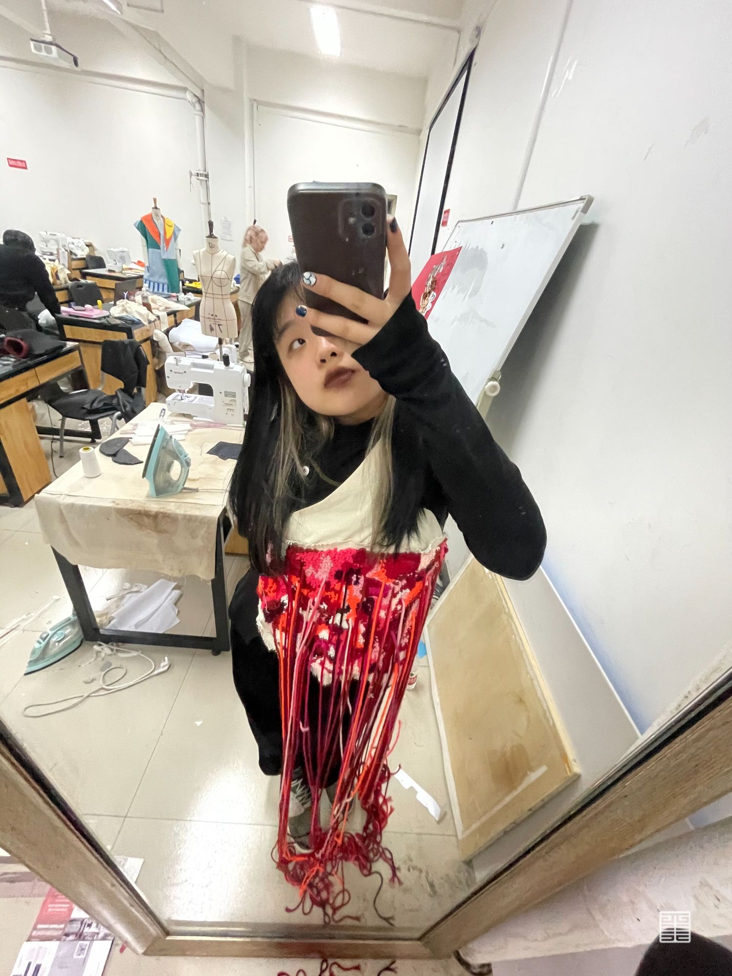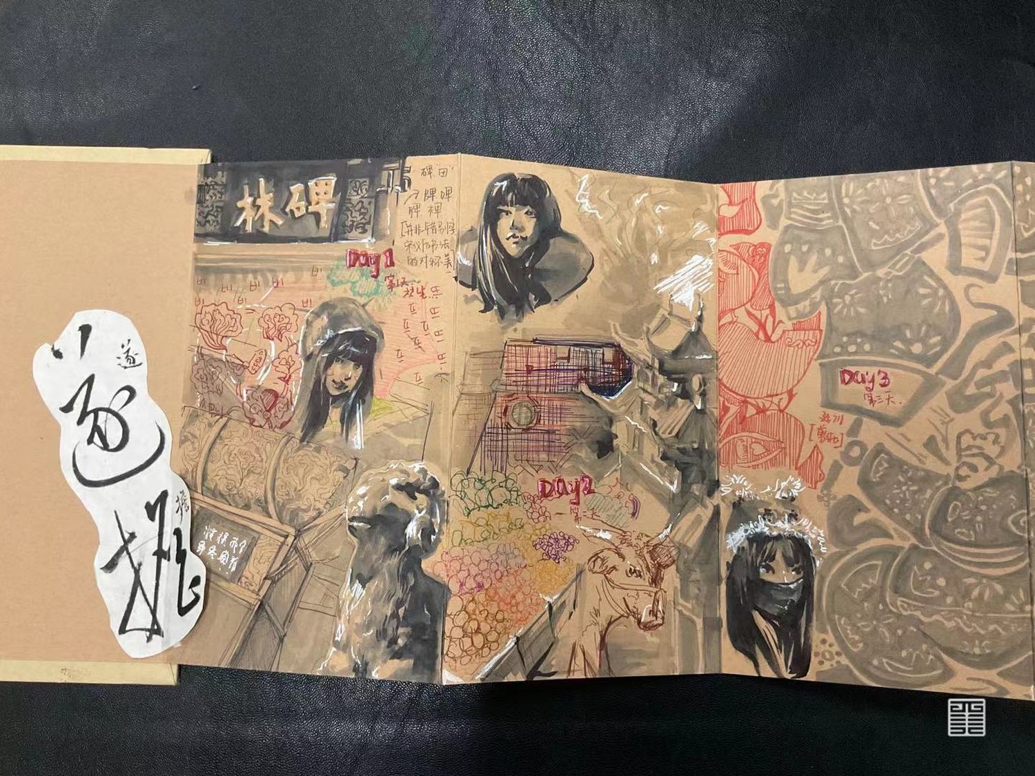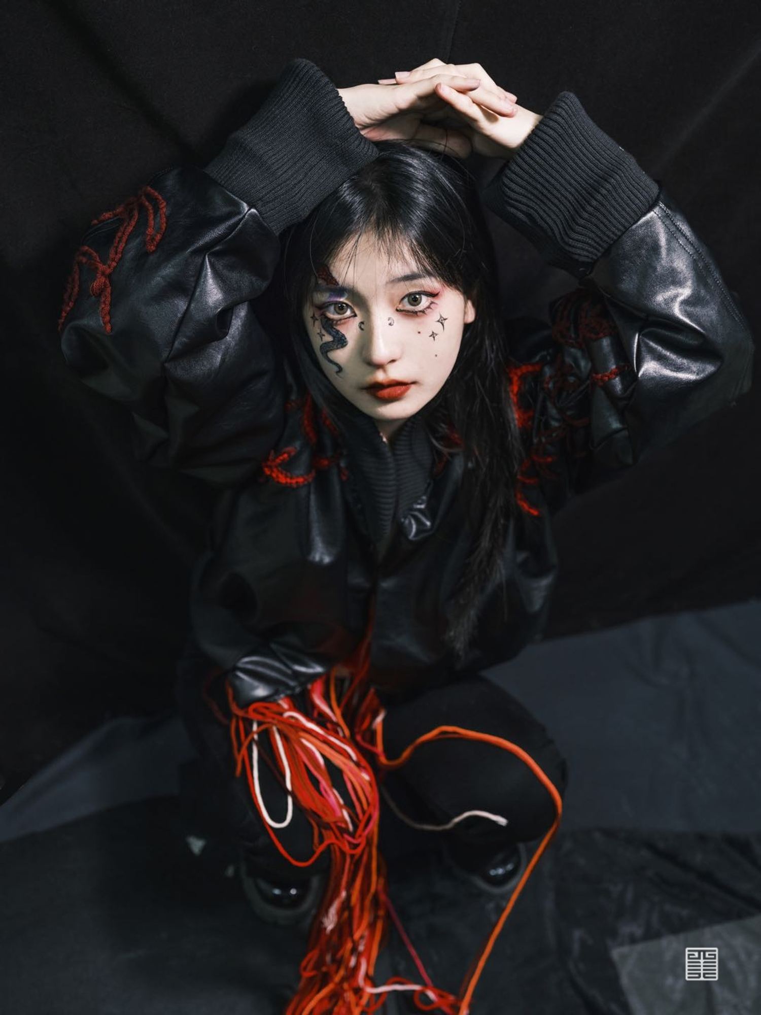 个人作业主题为陕西特色水果石榴,根据其颜色和造型特点提取廓形,结合创意运动装设计一系列石榴特色的服装,名为时留。将陕西最丰收的果实表现出来。小组成衣作品以民俗中的五毒作为灵感来源,分别是蛇、蝎、蜈蚣、壁虎、蟾蜍,谷雨以后气温升高,病虫害进入高繁衍期,为了减轻虫害对作物及人的伤害,农家一边进田灭虫,一边张贴谷雨贴,进行驱凶纳吉的祈祷。这一习俗在陕西一带十分流行。在此次写生采风过程中我们将毛线编织元素与民俗结合起来,以皮革作为编织的底布,在皮革上用毛线作画,并且使用经典的红黑配色,将民俗拉入现代视角。将蛇形态结构留其骨架,外套结合戳戳绣的手法将蛇骨缠绕在皮质布料上,内搭使用红色多色阶套色用像鲜血一样的红衬托外套。