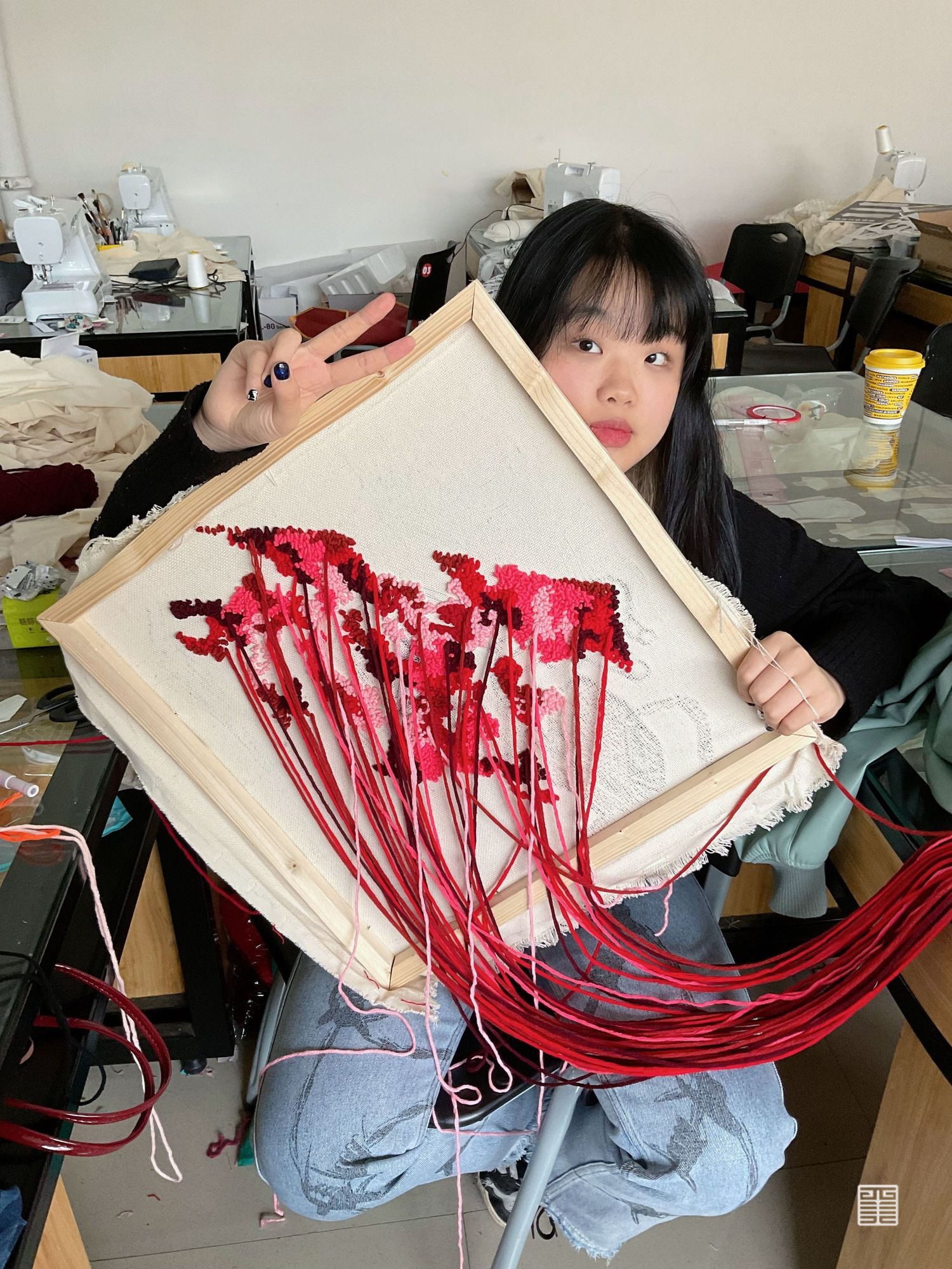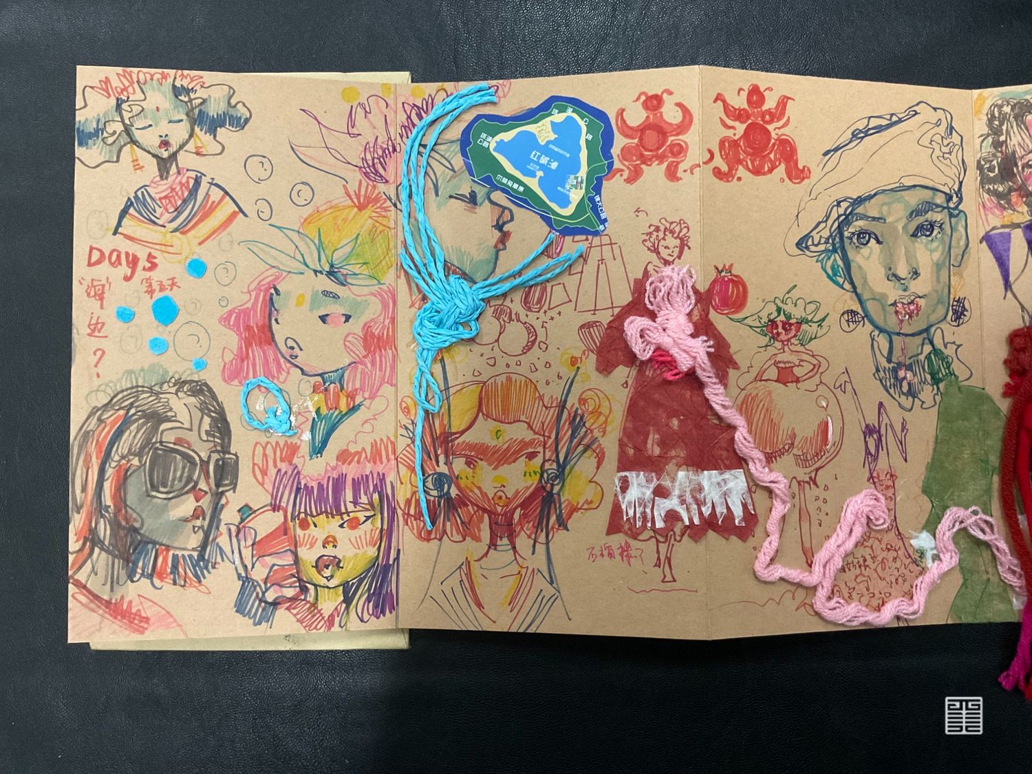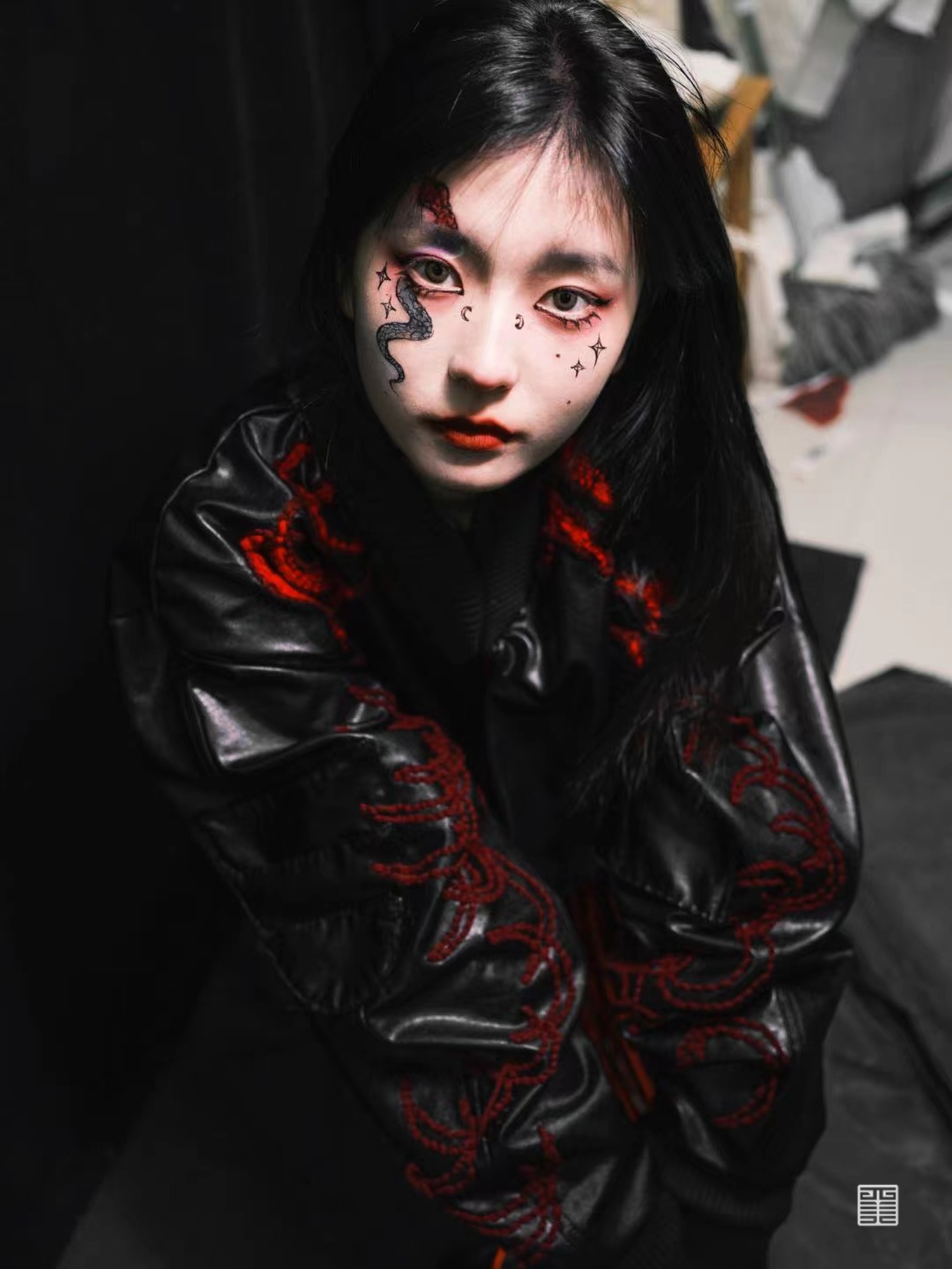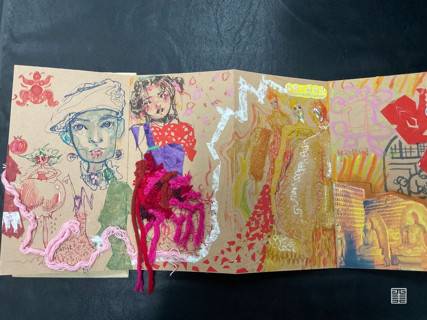 个人作业主题为陕西特色水果石榴,根据其颜色和造型特点提取廓形,结合创意运动装设计一系列石榴特色的服装,名为时留。将陕西最丰收的果实表现出来。小组成衣作品以民俗中的五毒作为灵感来源,分别是蛇、蝎、蜈蚣、壁虎、蟾蜍,谷雨以后气温升高,病虫害进入高繁衍期,为了减轻虫害对作物及人的伤害,农家一边进田灭虫,一边张贴谷雨贴,进行驱凶纳吉的祈祷。这一习俗在陕西一带十分流行。在此次写生采风过程中我们将毛线编织元素与民俗结合起来,以皮革作为编织的底布,在皮革上用毛线作画,并且使用经典的红黑配色,将民俗拉入现代视角。将蛇形态结构留其骨架,外套结合戳戳绣的手法将蛇骨缠绕在皮质布料上,内搭使用红色多色阶套色用像鲜血一样的红衬托外套。