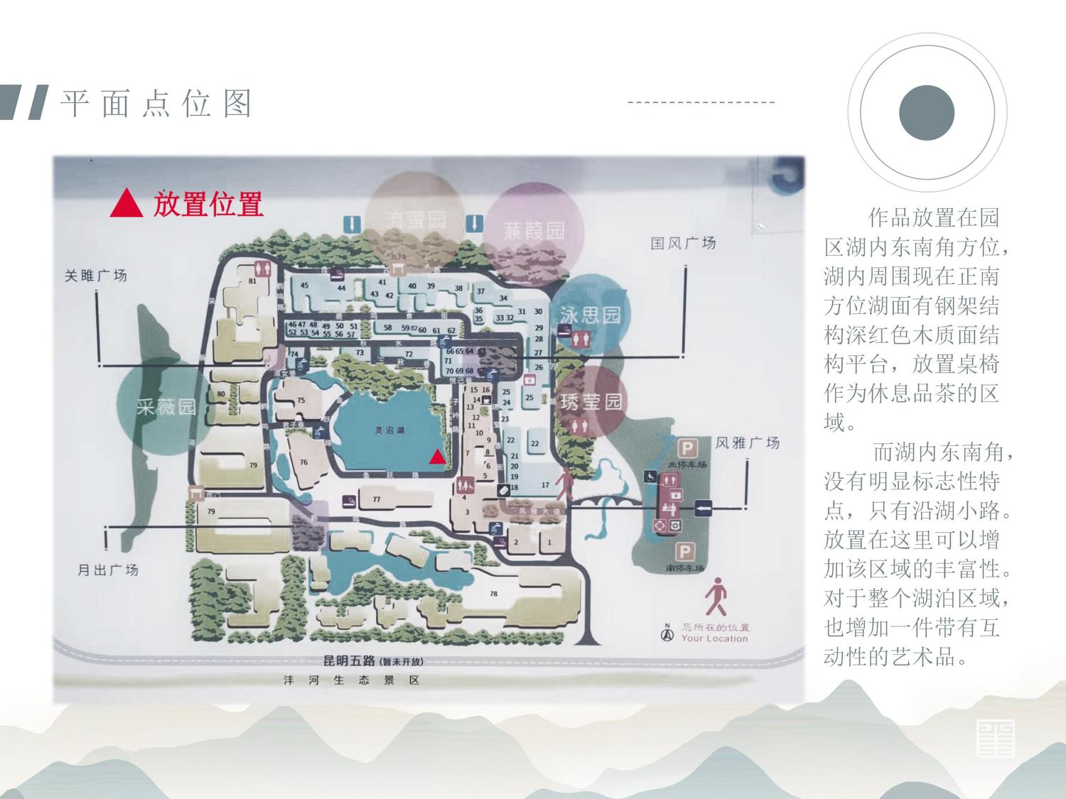 作品放置在园区湖内东南角方位,湖内周围现在正南方位湖面有钢架结构深红色木质面结构平台,放置桌椅作为休息品茶的区域。 而湖内东南角,没有明显标志性特点,只有沿湖小路。放置在这里可以增加该区域的丰富性。对于整个湖泊区域,也增加一件带有互动性的艺术品。