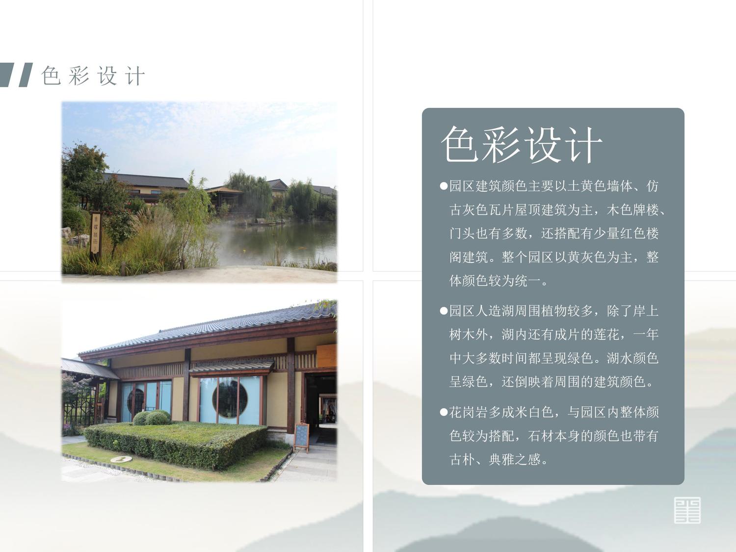 园区建筑颜色主要以土黄色墙体、仿古灰色瓦片屋顶建筑为主,木色牌楼、门头也有多数,还搭配有少量红色楼阁建筑。整个园区以黄灰色为主,整体颜色较为统一。园区人造湖周围植物较多,除了岸上树木外,湖内还有成片的莲花,一年中大多数时间都呈现绿色。湖水颜色呈绿色,还倒映着周围的建筑颜色。花岗岩多成米白色,与园区内整体颜色较为搭配,石材本身的颜色也带有古朴、典雅之感。
