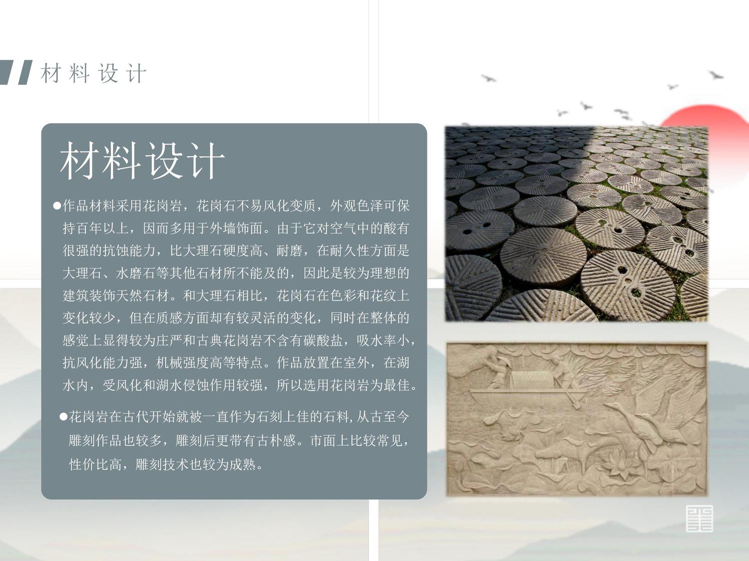 作品材料采用花岗岩,花岗石不易风化变质,外观色泽可保持百年以上,因而多用于外墙饰面。由于它对空气中的酸有很强的抗蚀能力,比大理石硬度高、耐磨,在耐久性方面是大理石、水磨石等其他石材所不能及的,因此是较为理想的建筑装饰天然石材。和大理石相比,花岗石在色彩和花纹上变化较少,但在质感方面却有较灵活的变化,同时在整体的感觉上显得较为庄严和古典花岗岩不含有碳酸盐,吸水率小,抗风化能力强,机械强度高等特点。作品放置在室外,在湖水内,受风化和湖水侵蚀作用较强,所以选用花岗岩为最佳。另一方面,花岗岩在古代开始就被一直作为石刻上佳的石料,从古至今雕刻作品也较多,雕刻后更带有古朴感。市面上比较常见,性价比高,雕刻技术也较为成熟。