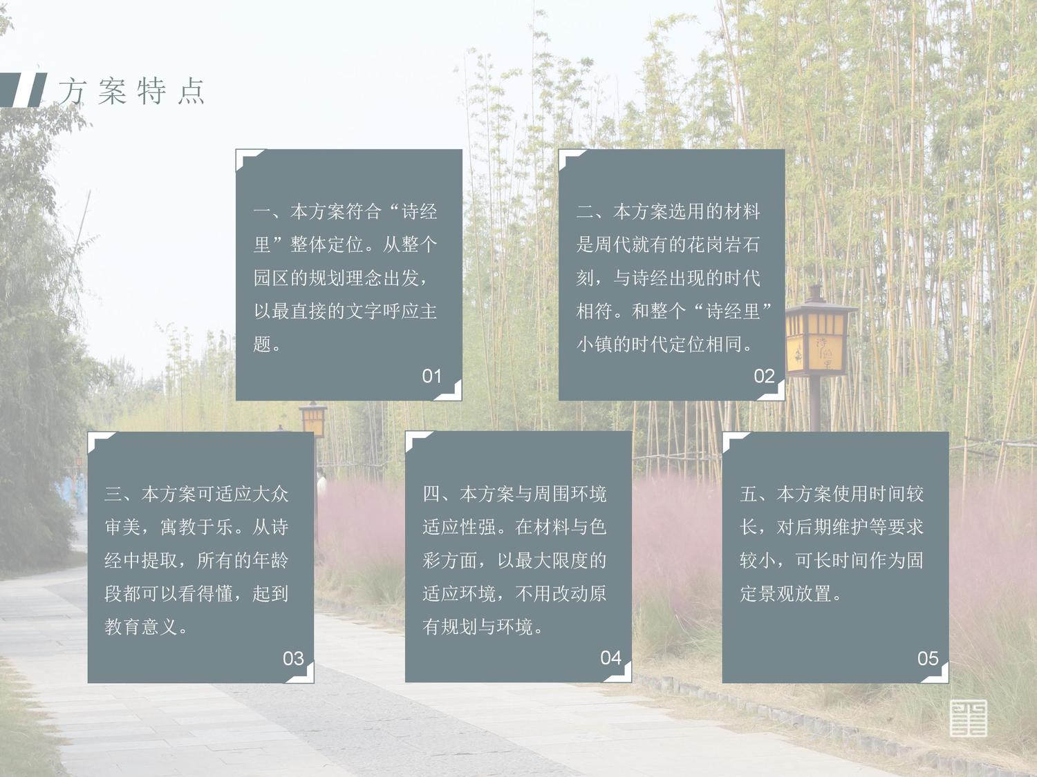 二、本方案选用的材料是周代就有的花岗岩石刻,与诗经出现的时代相符。和整个“诗经里”小镇的时代定位相同。