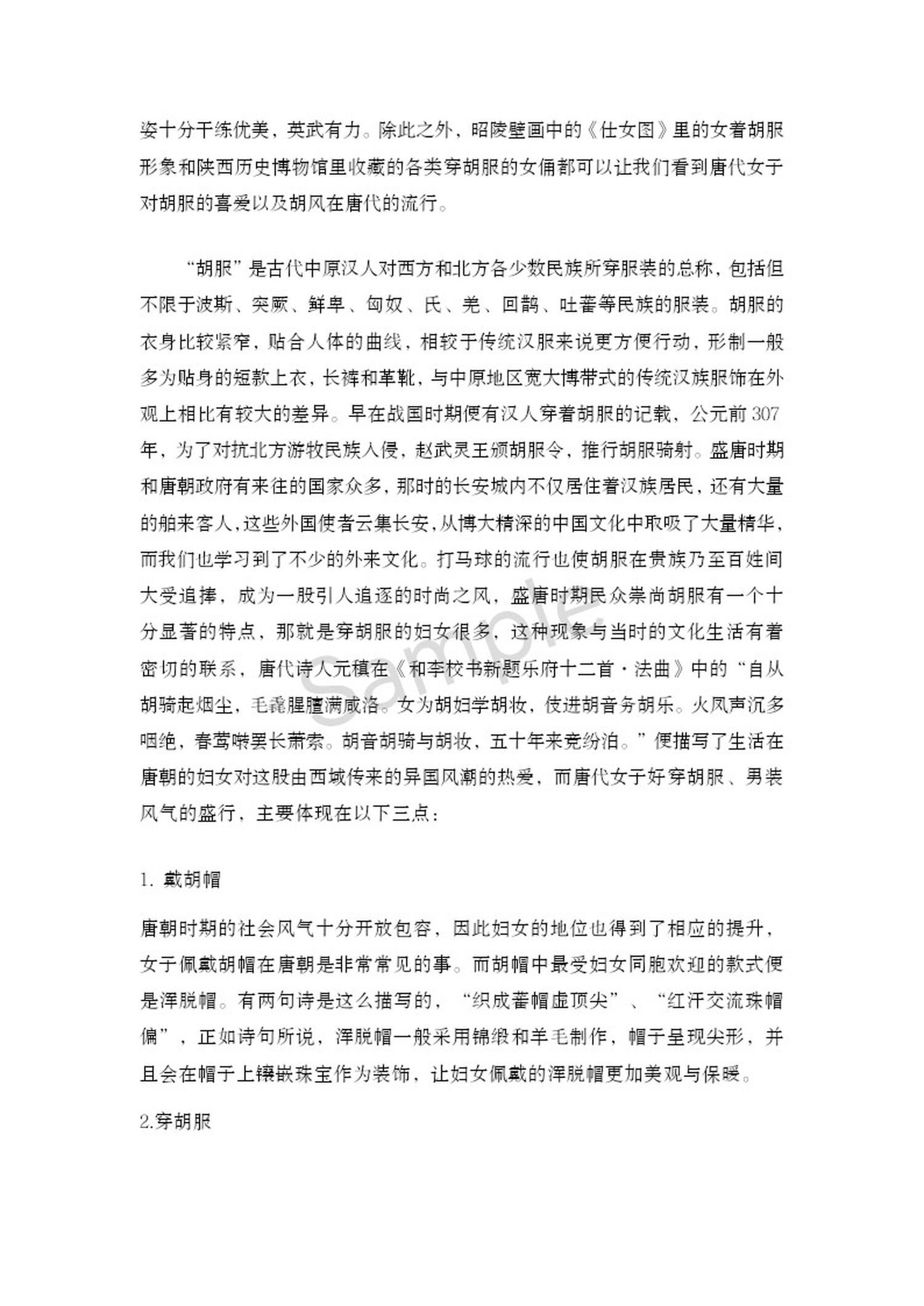 “胡服”是古代中原汉人对西方和北方各少数民族所穿服装的总称,包括但不限于波斯、突厥、鲜卑、匈奴、氏、羌、回鹊、吐蕃等民族的服装。胡服的衣身比较紧窄,贴合人体的曲线,相较于传统汉服来说更方便行动,形制一般多为贴身的短款上衣,长裤和革靴,与中原地区宽大博带式的传统汉族服饰在外观上相比有较大的差异。早在战国时期便有汉人穿着胡服的记载,公元前307年,为了对抗北方游牧民族入侵,赵武灵王颁胡服令,推行胡服骑射。盛唐时期和唐朝政府有来往的国家众多,那时的长安城内不仅居住着汉族居民,还有大量的舶来客人,这些外国使者云集长安,从博大精深的中国文化中取吸了大量精华,而我们也学习到了不少的外来文化。打马球的流行也使胡服在贵族乃至百姓间大受追捧,成为一股引人追逐的时尚之风,盛唐时期民众崇尚胡服有一个十分显著的特点,那就是穿胡服的妇女很多,这种现象与当时的文化生活有着密切的联系,唐代诗人元稹在《和李校书新题乐府十二首·法曲》中的“自从胡骑起烟尘,毛毳腥膻满咸洛。女为胡妇学胡妆,伎进胡音务胡乐。火凤声沉多咽绝,春莺啭罢长萧索。胡音胡骑与胡妆,五十年来竞纷泊。”便描写了生活在唐朝的妇女对这股由西域传来的异国风潮的热爱,而唐代女子好穿胡服、男装风气的盛行,主要体现在以下三点: