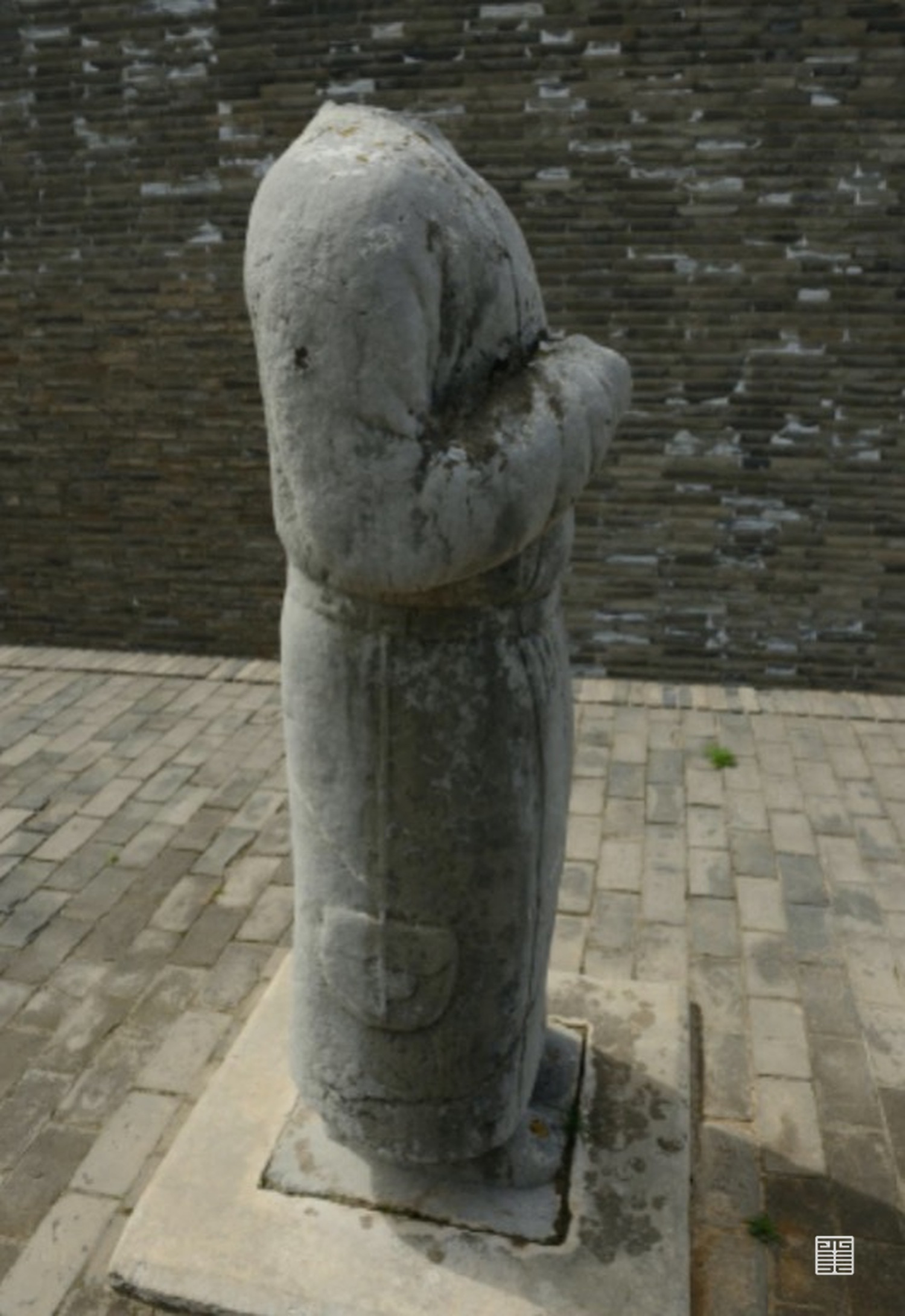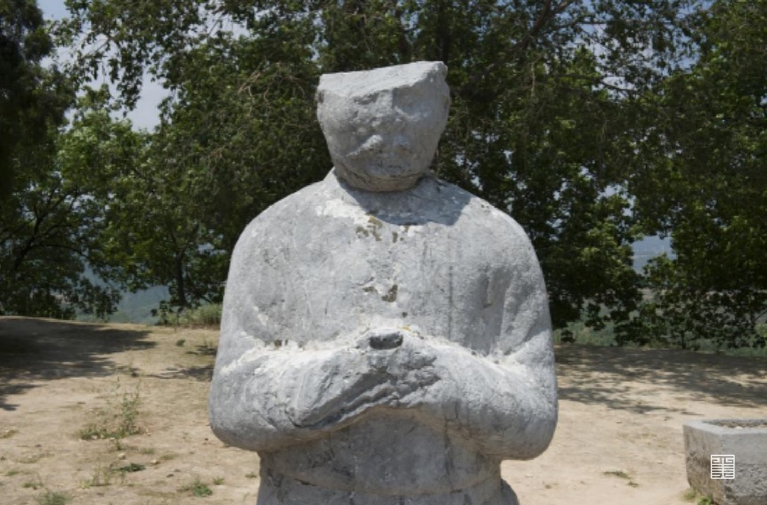其次,在蕃臣像中我们也可以看出有关于“线”的造型语言。线不仅仅是中国传统绘画的语言元素,也是中国传统雕刻造型语言中最为重要的形式特质。《美的历程》中有写:“线的艺术,是中国民族文化心理结构的表现”,而雕刻中的线,弱化了石材的厚重感,赋予轻盈之态,将锋利的转角巧妙转变为微妙的圆弧,雕刻对象的千姿百态也就被展现了出来。蕃臣像中,起伏在形体团块上的线条有始有终,一丝不苟,同时,蕃臣所着服饰及细节也是通过刻线来表示,线条处理的简洁而流畅自然,这也在乾陵其他石刻上有所体现。同时,每个蕃臣均衡对称性的造型表达出了秩序感和臣服于唐君王的思想意义。