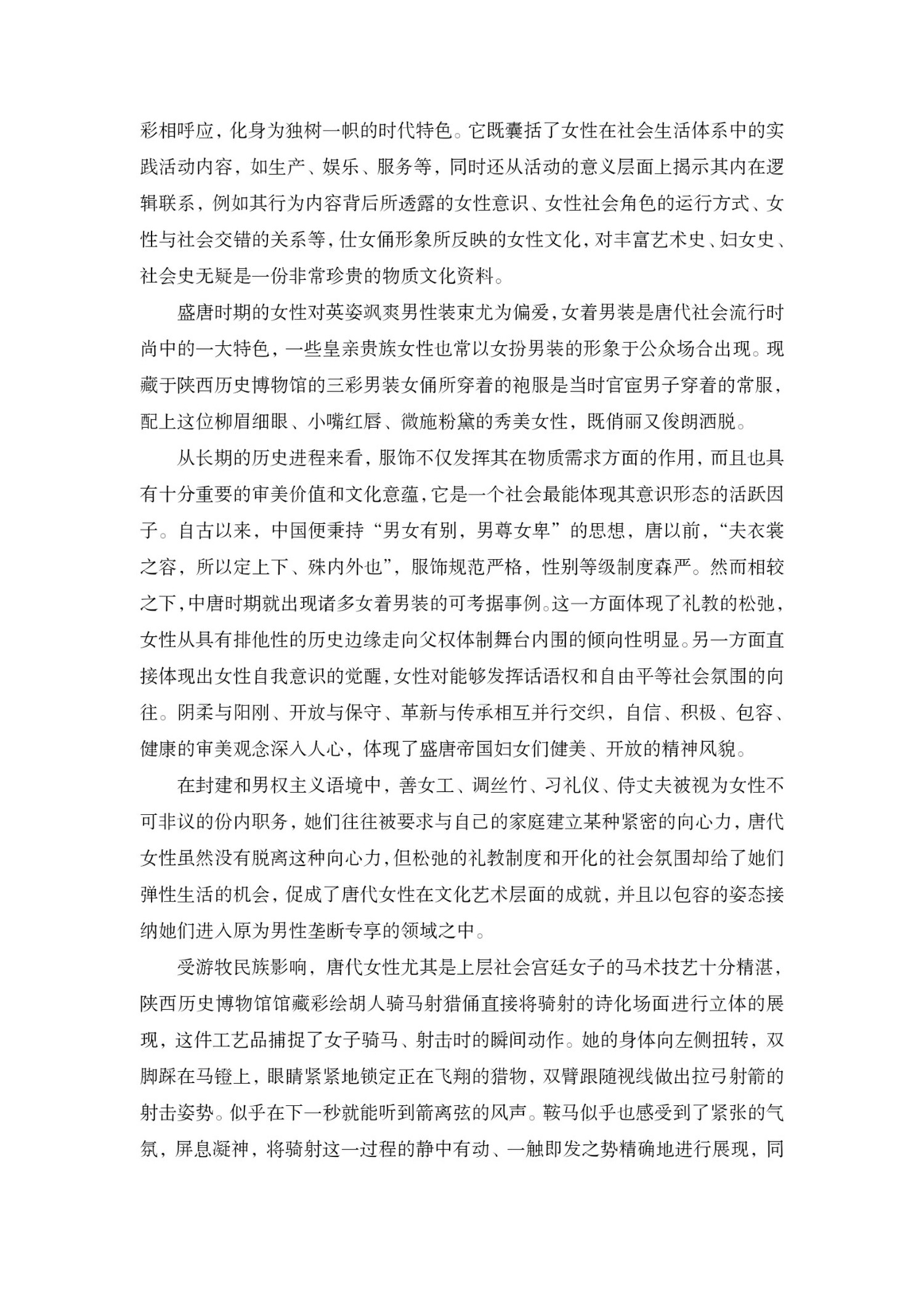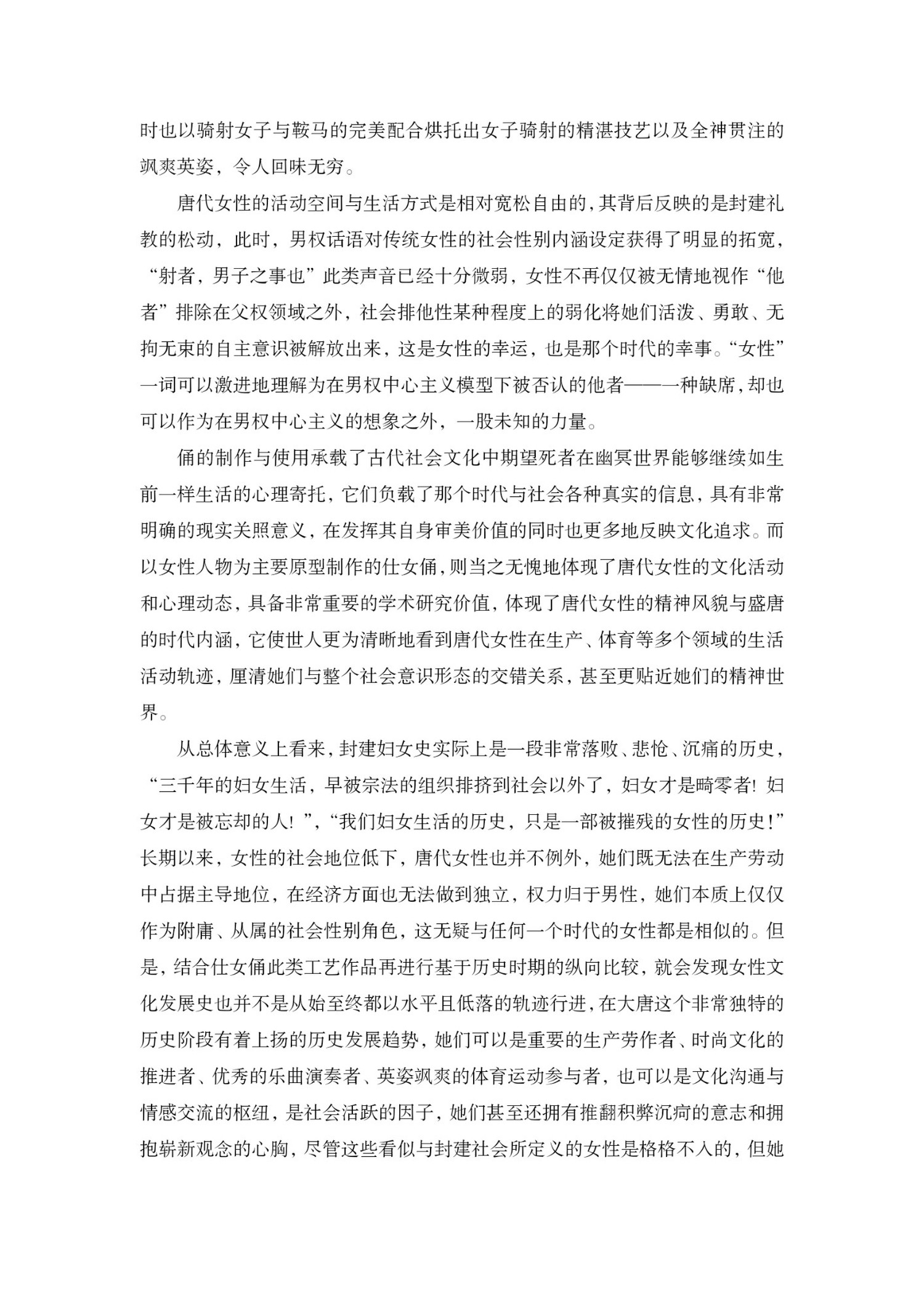 从总体意义上看来,封建妇女史实际上是一段非常落败、悲怆、沉痛的历史, “三千年的妇女生活,早被宗法的组织排挤到社会以外了,妇女才是畸零者! 妇女才是被忘却的人! ”,“我们妇女生活的历史,只是一部被摧残的女性的历史!”长期以来,女性的社会地位低下,唐代女性也并不例外,她们既无法在生产劳动中占据主导地位,在经济方面也无法做到独立,权力归于男性,她们本质上仅仅作为附庸、从属的社会性别角色,这无疑与任何一个时代的女性都是相似的。但是,结合仕女俑此类工艺作品再进行基于历史时期的纵向比较,就会发现女性文化发展史也并不是从始至终都以水平且低落的轨迹行进,在大唐这个非常独特的历史阶段有着上扬的历史发展趋势,她们可以是重要的生产劳作者、时尚文化的推进者、优秀的乐曲演奏者、英姿飒爽的体育运动参与者,也可以是文化沟通与情感交流的枢纽,是社会活跃的因子,她们甚至还拥有推翻积弊沉疴的意志和拥抱崭新观念的心胸,尽管这些看似与封建社会所定义的女性是格格不入的,但她们曾经真实生活于大唐时代。其进步的一面不能被曲解和磨灭,唐代女性脱离层层桎梏,缔造具有划时代意义的新景象,西蒙•波伏娃语: “女人既是自然,又是反自然; 像体现自然一样,她也体现了社会; 在她身上概括了一个时代的文明。”康德说观看从来不是消极的,贡布里希更强调观看是一种探索与选择。根本来说,观照社会即是观照自我,她们作为独立个体所代表的绚丽多彩的文化盛况与唐代整个辉煌大气的时代相呼应,在整个封建历史进程中奏响一段格调庄重、自由奔放的乐章。