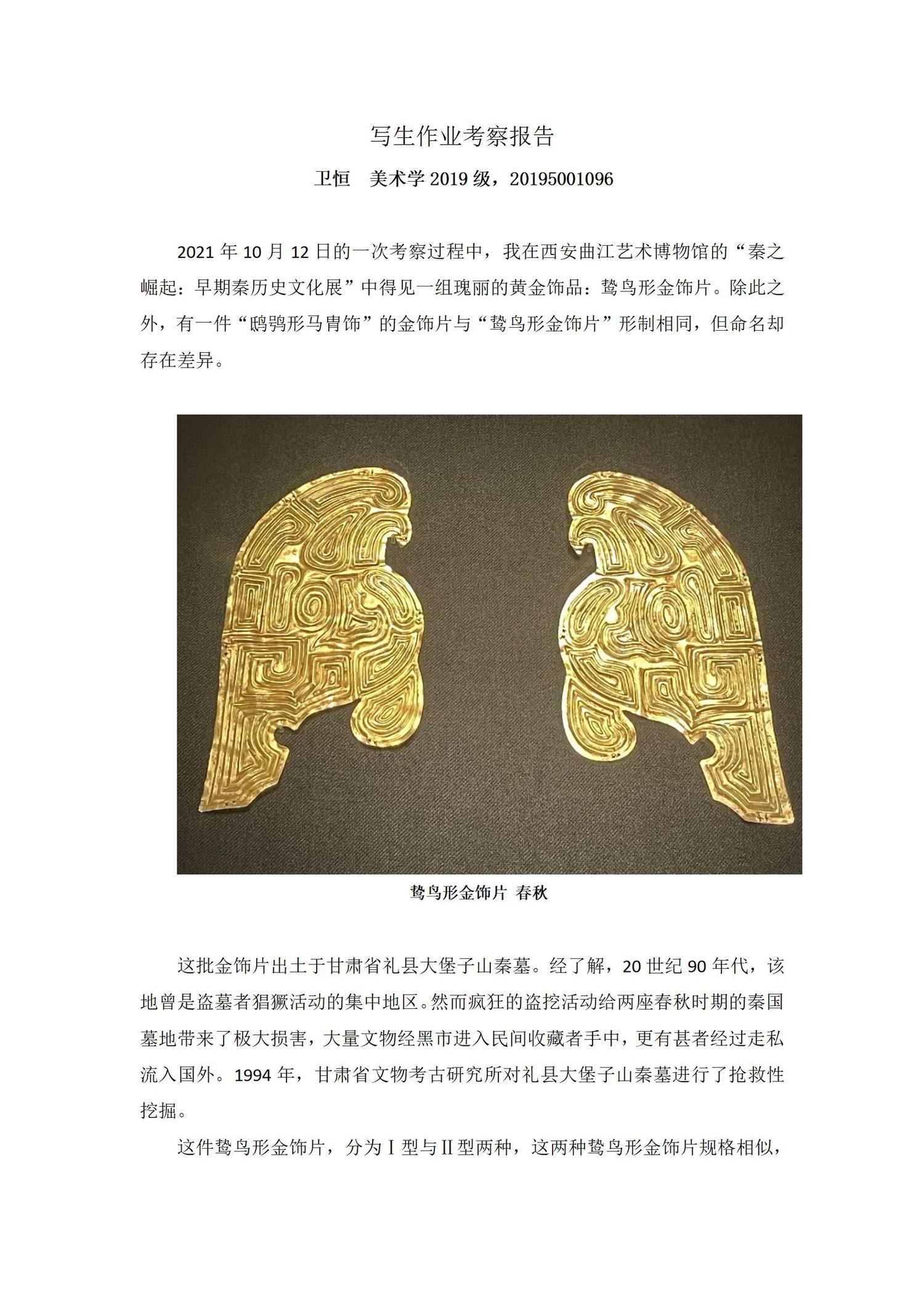 2021年10月12日的一次考察过程中,我在西安曲江艺术博物馆的“秦之崛起:早期秦历史文化展”中得见一组瑰丽的黄金饰品:鸷鸟形金饰片。除此之外,有一件“鸱鸮形马胄饰”的金饰片与“鸷鸟形金饰片”形制相同,但命名却存在差异。这批金饰片出土于甘肃省礼县大堡子山秦墓。经了解,20世纪90年代,该地曾是盗墓者猖獗活动的集中地区。然而疯狂的盗挖活动给两座春秋时期的秦国墓地带来了极大损害,大量文物经黑市进入民间收藏者手中,更有甚者经过走私流入国外。1994年,甘肃省文物考古研究所对礼县大堡子山秦墓进行了抢救性挖掘。