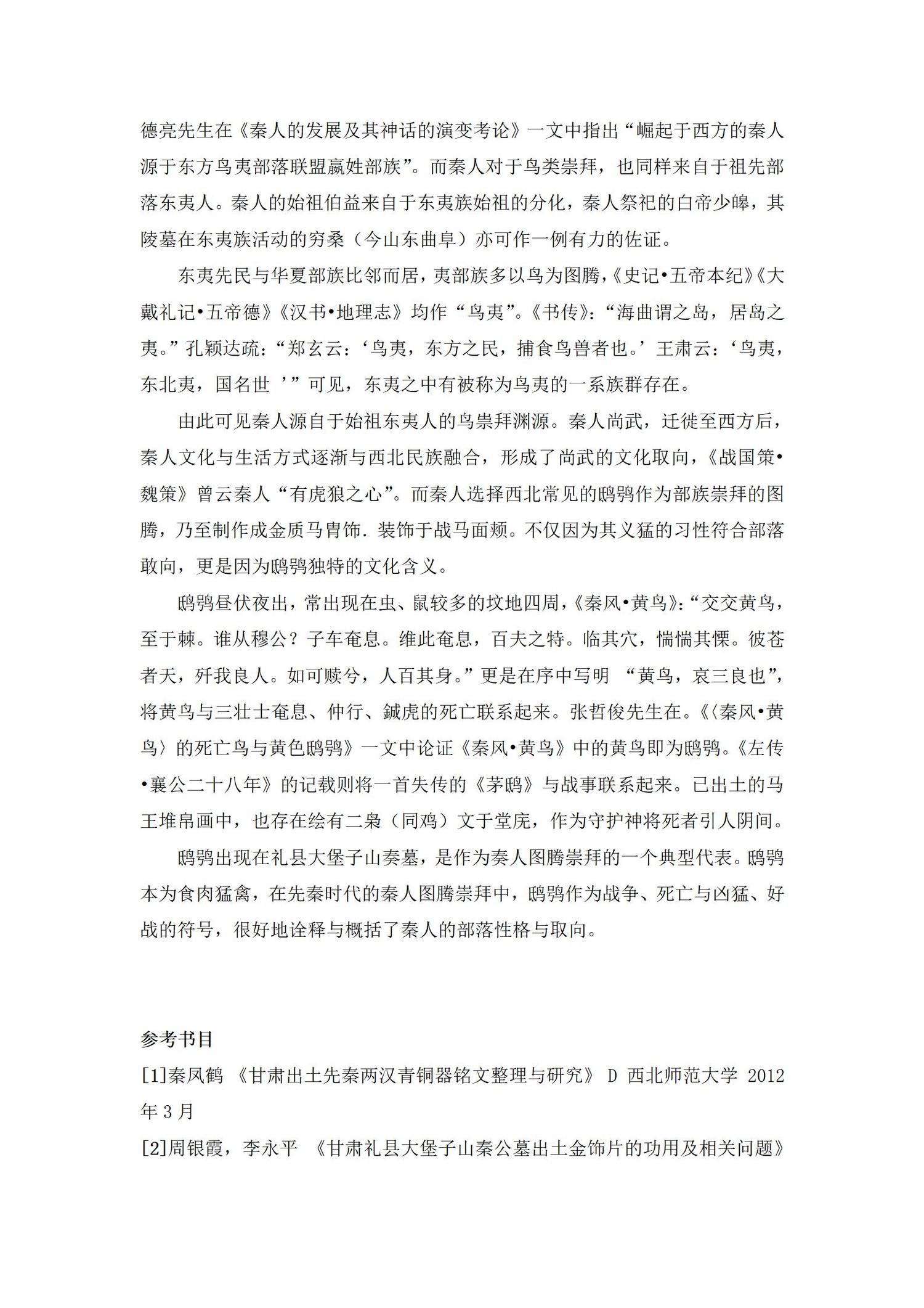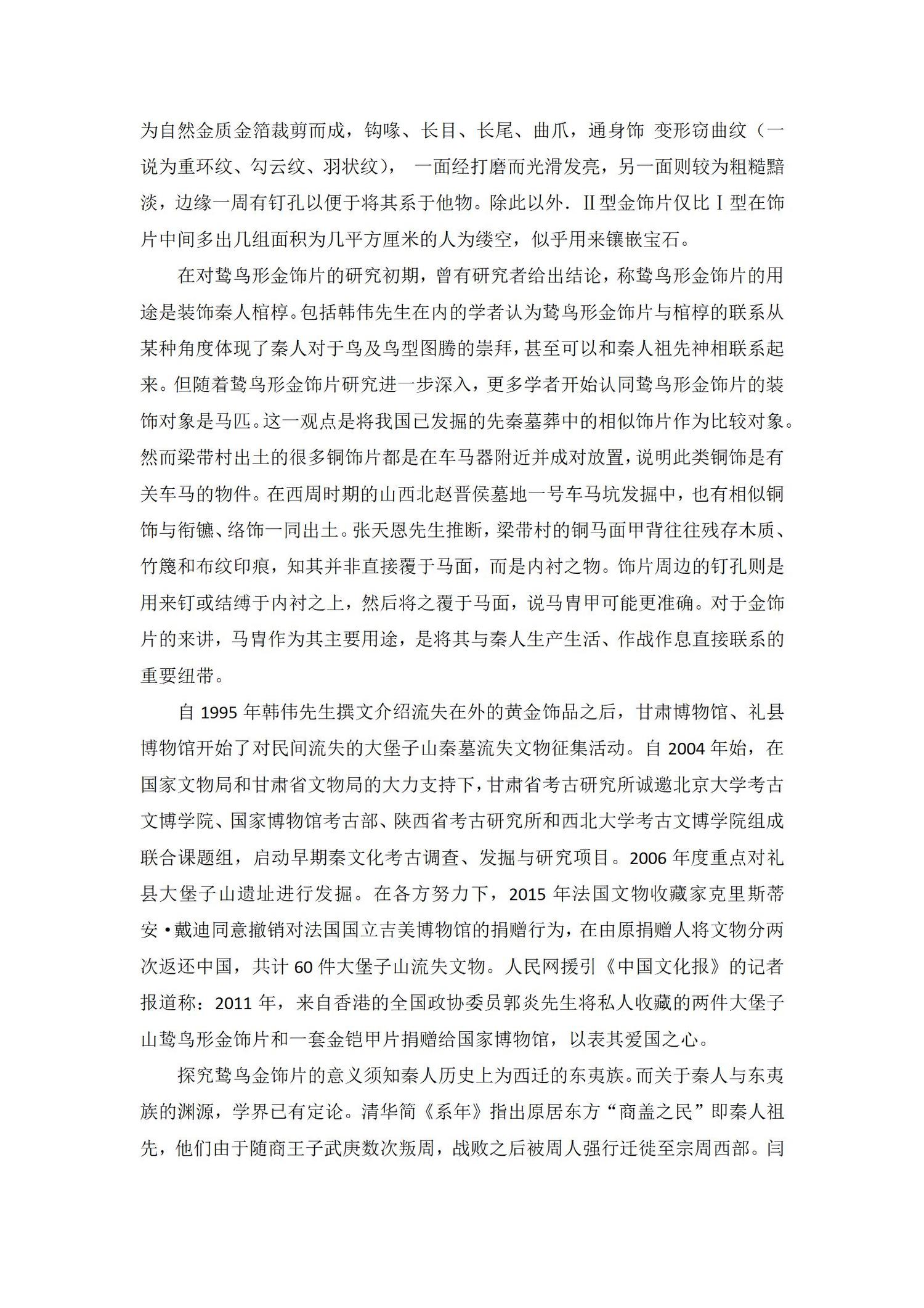 探究鸷鸟金饰片的意义须知秦人历史上为西迁的东夷族。而关于秦人与东夷族的渊源,学界已有定论。清华简《系年》指出原居东方“商盖之民”即秦人祖先,他们由于随商王子武庚数次叛周,战败之后被周人强行迁徙至宗周西部。闫德亮先生在《秦人的发展及其神话的演变考论》一文中指出“崛起于西方的秦人源于东方鸟夷部落联盟嬴姓部族”。而秦人对于鸟类崇拜,也同样来自于祖先部落东夷人。秦人的始祖伯益来自于东夷族始祖的分化,秦人祭祀的白帝少皞,其陵墓在东夷族活动的穷桑(今山东曲阜)亦可作一例有力的佐证。
