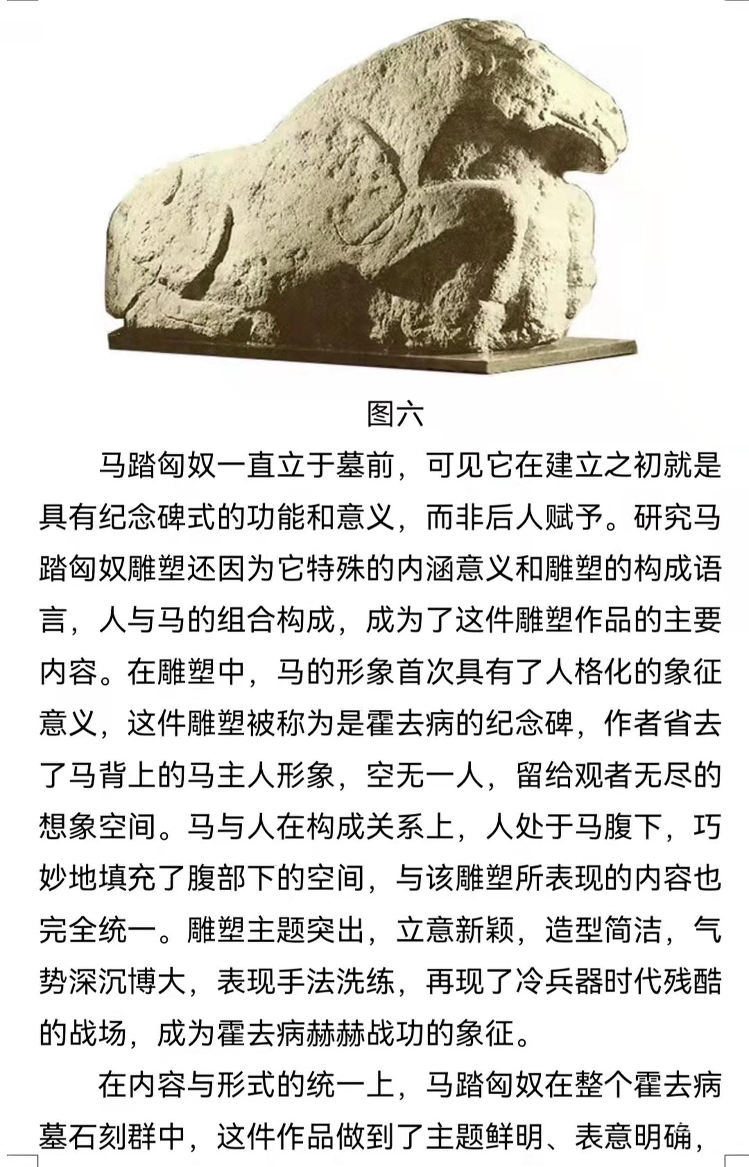 自上世纪初,霍去病墓石刻被国外学者引起关注之后,国内外的大量学者从各个方面对其进行深入细致的研究,并不断有新的观点出现。时至今日,关于霍去病墓石刻研究的文章、著作可谓硕果累累。霍去病墓石刻,是目前发现的中国早期艺术价值较高的大型石刻群。它一报道,就引起了世人的高度重视,一则因为他是汉武帝茂陵的陪葬墓,二则因为它苍劲古拙的造型,和独具民族特色的造型语言,深深的折服了观者;还有,因石刻群中令人费解的题材和怪异的造型,同殷商时期怪异的青铜装饰一样,引起人们无尽的猜想。王子云先生曾在所著的《中国雕塑艺术史》中这样称赞霍去病墓石刻:“霍墓石雕群,虽仅是一个孤例,但在中国古代雕塑艺术史上是可与秦陵兵马俑相媲美的。③《马踏匈奴》是霍去病墓石刻中的主题雕塑,它有着独特的艺术形式和造型。在构图形式、处理手法上都有着不可超越的艺术高度。雕塑注重对空间的分割和占有,利用弧线、直线、斜线对空间进行分割。雕塑整体高1.68米,长1.90米。石刻中的马骨架匀称,肌肉结实,躯体剽悍肥壮,腿筋劲健,蹄足抓地,一只前蹄把一个匈奴士兵踏倒在地。匈奴人仰卧地上,左手握弓,右手持箭,双腿蜷曲作狼狈挣扎状,须发蓬松零乱。汉代是我国封建社会中一个开拓进取的时代,这一时期国家的政治、经济、军事、文化都很发达,强大的西汉帝国诞生出了气吞山河的艺术风格,它彰显出中华民族强大的创造力和生命力。位于咸阳市兴平县的茂陵霍去病墓前的石刻,正是这一风格的代表,它开创了汉代雕塑意象风格的先河。在这批雕塑中,尤其以《马踏匈奴》为代表。.