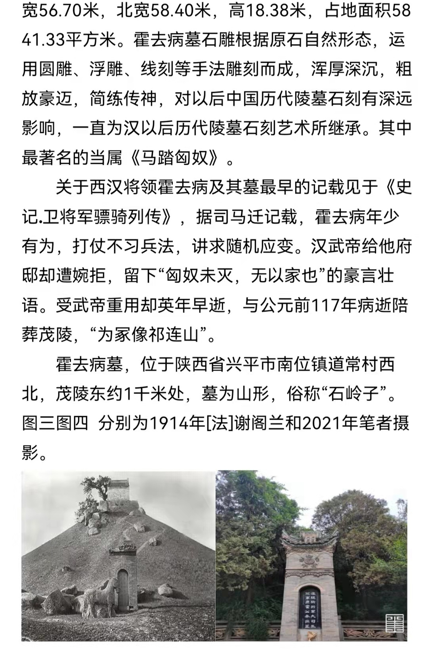 霍去病墓,位于陕西省兴平市南位镇道常村西北,茂陵东约1千米处,墓为山形,俗称“石岭子”。图三图四 分别为1914年[法]谢阁兰和2021年笔者摄影。