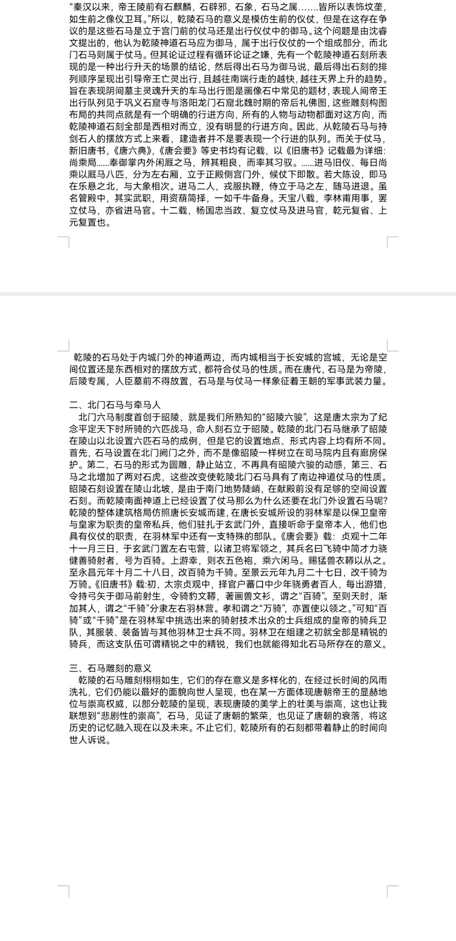 乾陵的石马雕刻栩栩如生,它们的存在意义是多样化的,在经过长时间的风雨洗礼,它们仍能以最好的面貌向世人呈现,也在某一方面体现唐朝帝王的显赫地位与崇高权威,以部分乾陵的呈现,表现唐陵的美学上的壮美与崇高,这也让我联想到“悲剧性的崇高”,石马,见证了唐朝的繁荣,也见证了唐朝的衰落,将这历史的记忆融入现在以及未来。不止它们,乾陵所有的石刻都带着静止的时间向世人诉说。