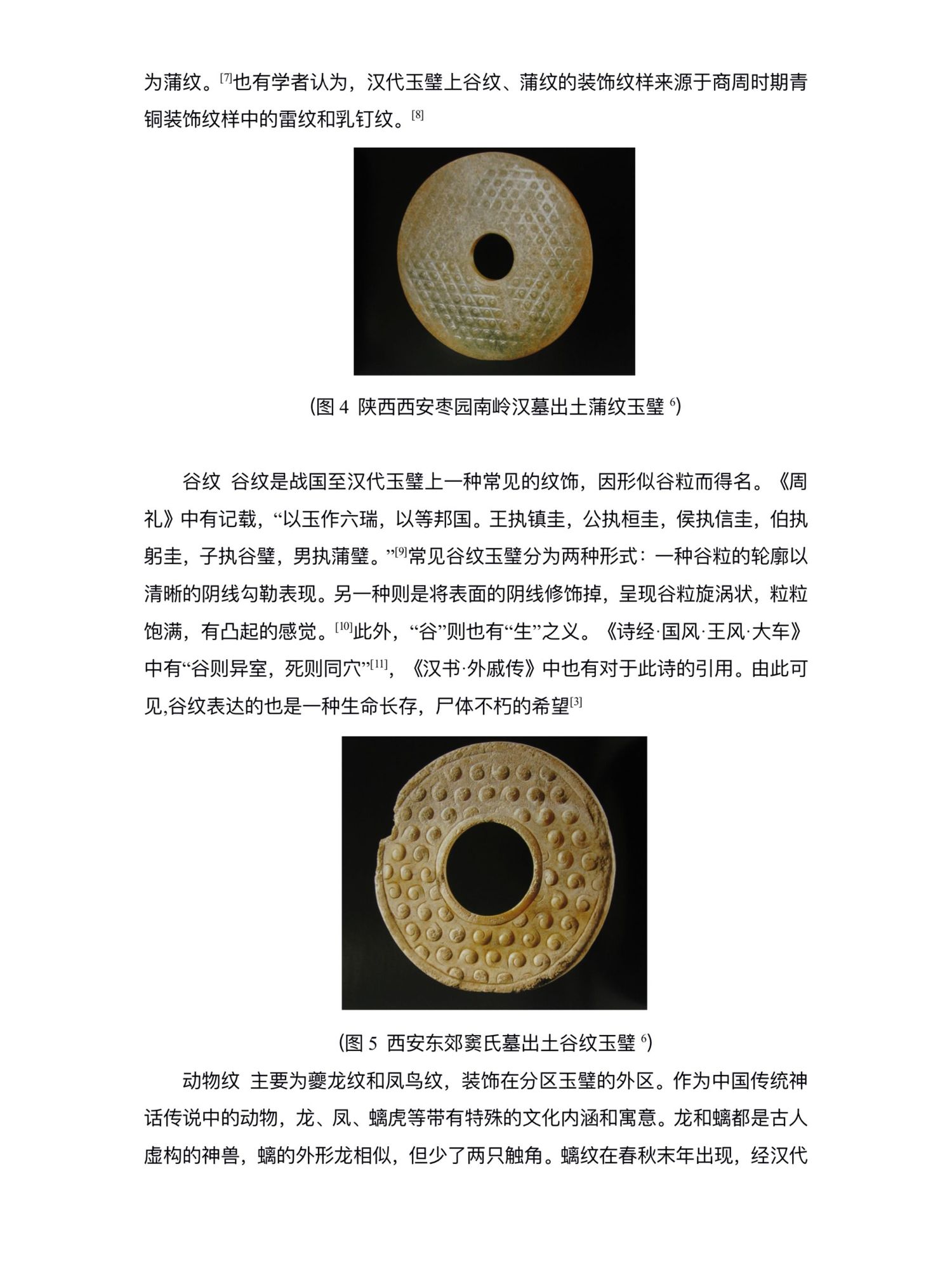 一方面,玉璧用作敛尸的器具。在对汉代墓葬的考古发掘中,多次见到了玉衣,汉代也有用玉堵住尸体七窍的习俗。东晋葛洪的《抱朴子》中也有记载:“金玉在九窍,则死人为不朽。”[]可见在那一时期汉代人认为玉具有保存尸体,使尸体不腐的功能。其次,在纹饰方面,汉代玉璧多饰有谷纹与龙凤纹,如前文所论述,这些纹样都带有长生、升天的文化寓意。