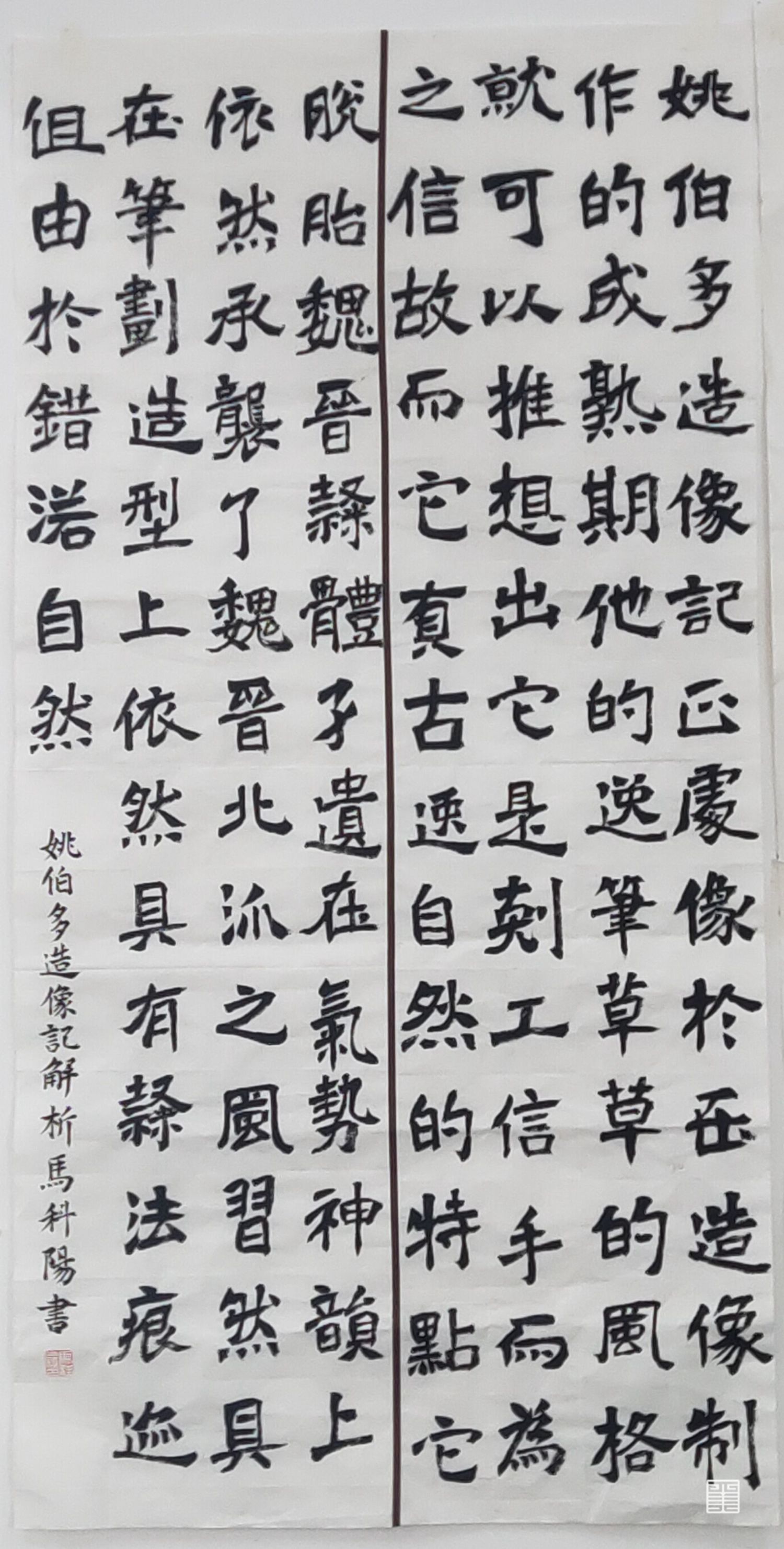 本副书法作品是魏碑中字四尺整幅,用姚伯多造像笔法结构创作而成。 用笔古朴自然,带有隶法痕迹。
