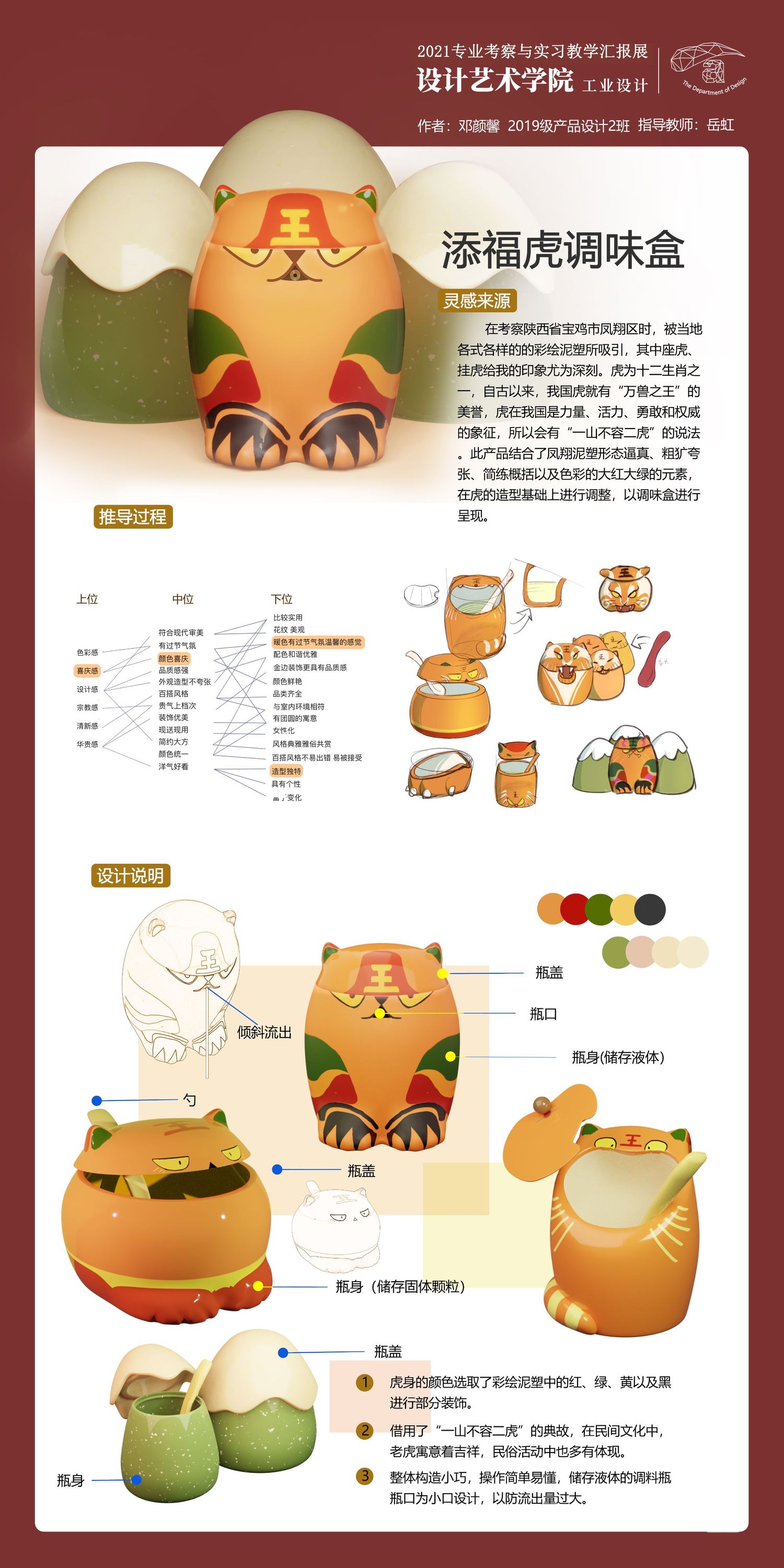 虎身的颜色选取了彩绘泥塑中的红、绿、黄以及黑进行部分装饰。借用了“一山不容二虎”的典故,在民间文化中,老虎寓意着吉祥,民俗活动中也多有体现。整体构造小巧,操作简单易懂,储存液体的调料瓶瓶口为小口设计,以防流出量过大。