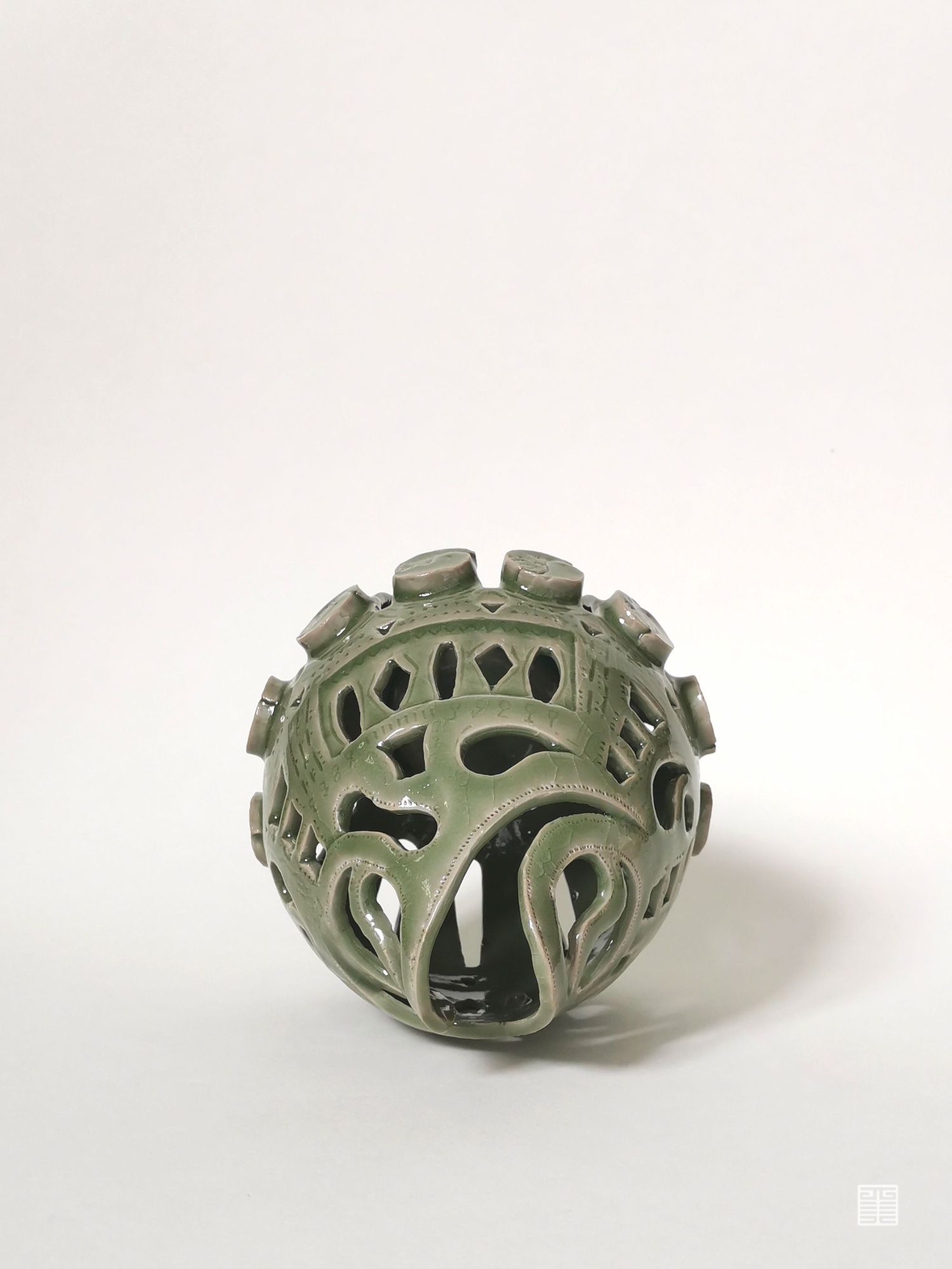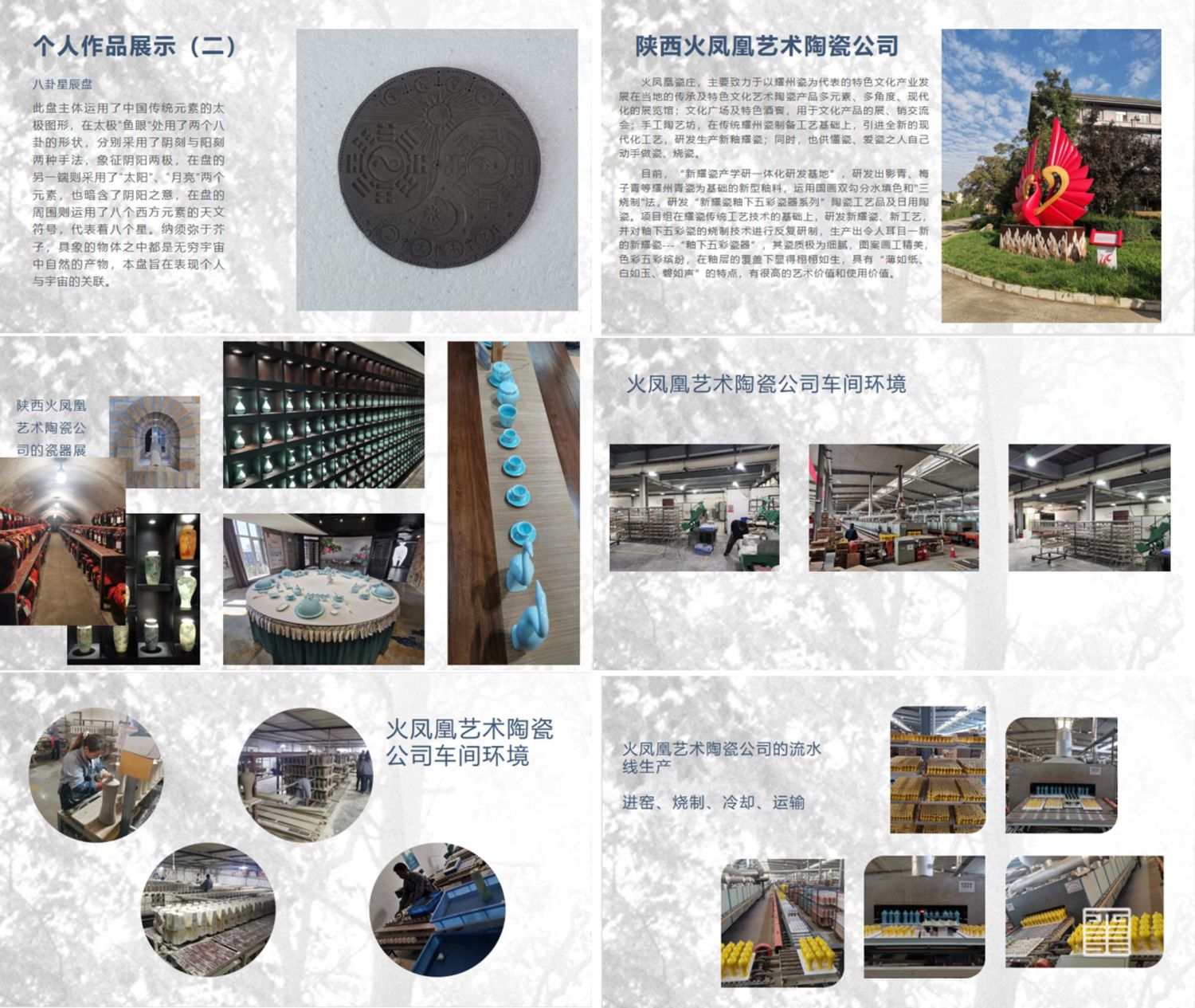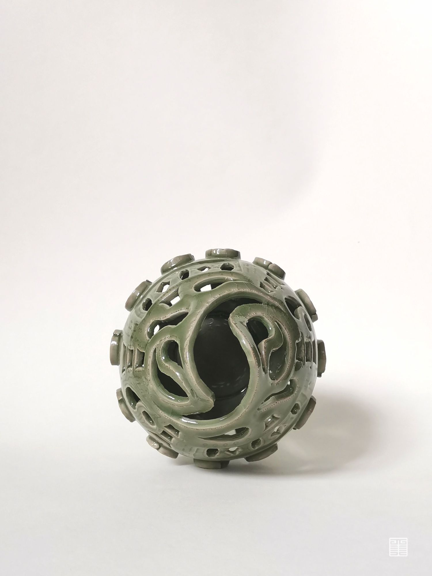本器物采用了壶的造型,但是与传统的器型稍有区别,整体的设计选择了镂空的样式,器物的顶端以太极图为元素,两个“鱼”的弧形旋转而形成壶口,器物正体采用了较为原始的几何图案,象征着远古的神秘,而下边用了十二个太极图形,数字十二为地支的象征。整个器物以传统的元素——太极为基本元素,加以人工的几何,材料为泥,象征着天、地、人三才的自然和谐。