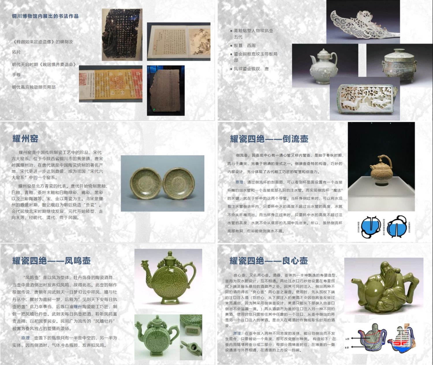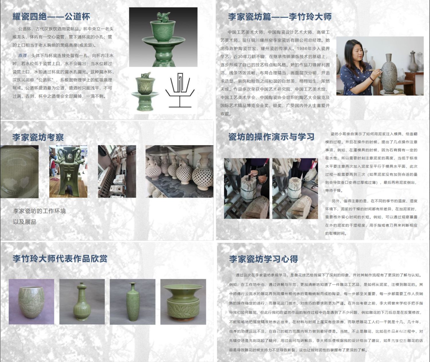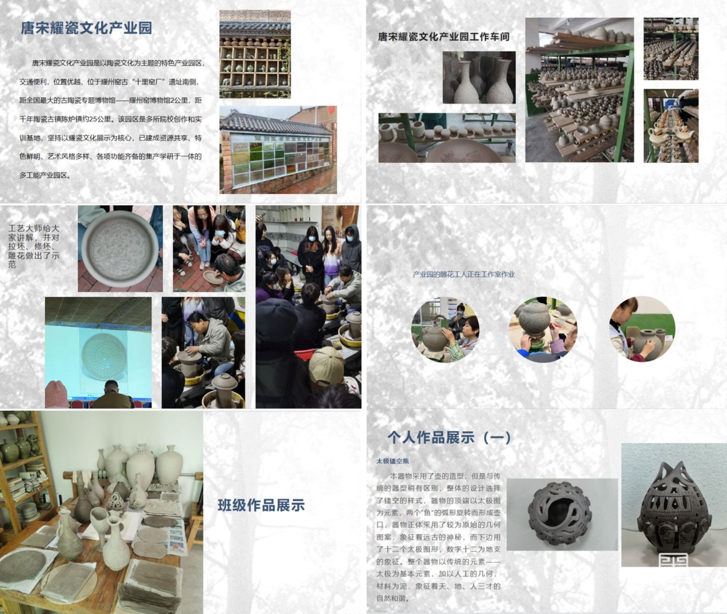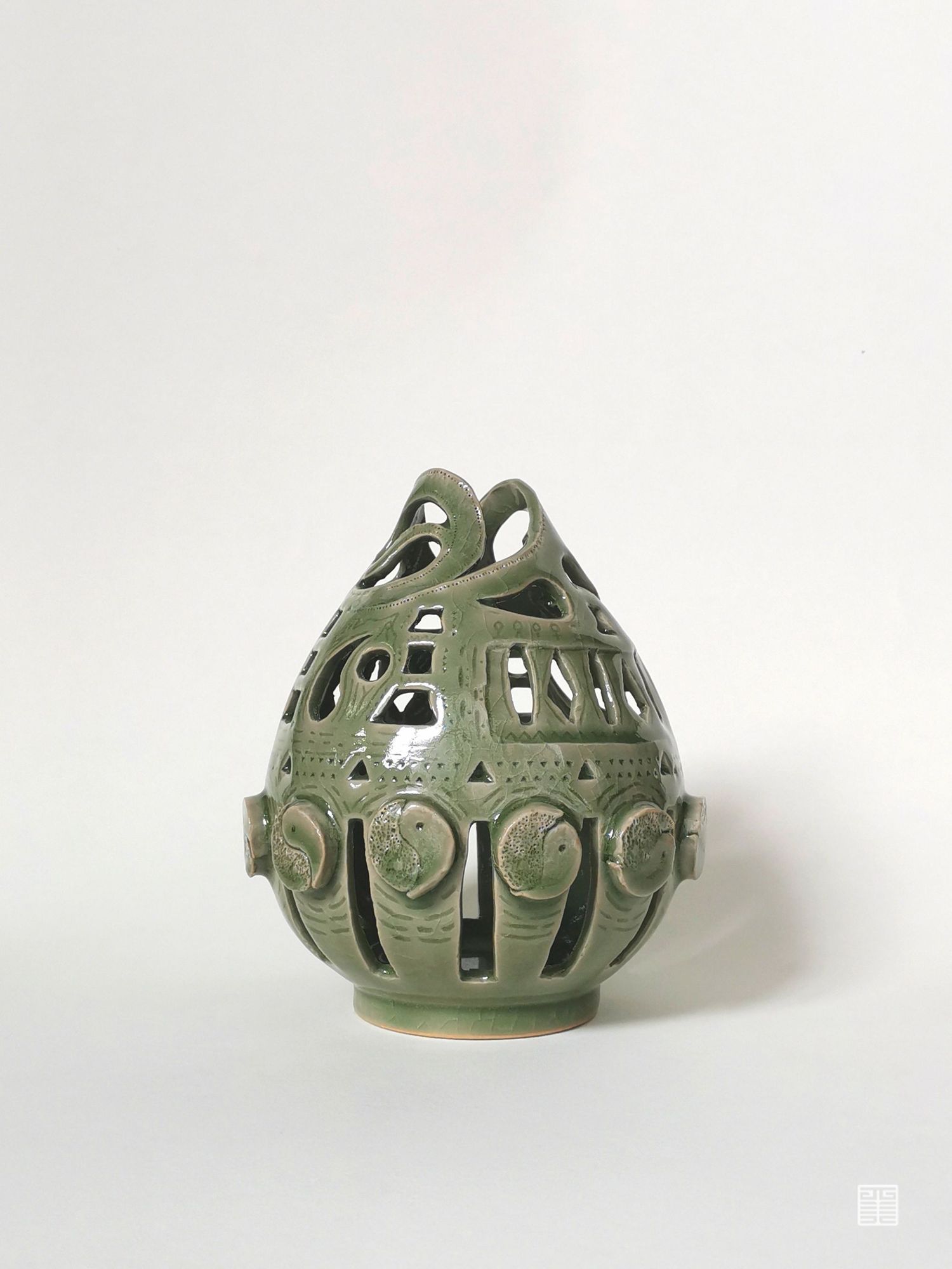 本器物采用了壶的造型,但是与传统的器型稍有区别,整体的设计选择了镂空的样式,器物的顶端以太极图为元素,两个“鱼”的弧形旋转而形成壶口,器物正体采用了较为原始的几何图案,象征着远古的神秘,而下边用了十二个太极图形,数字十二为地支的象征。整个器物以传统的元素——太极为基本元素,加以人工的几何,材料为泥,象征着天、地、人三才的自然和谐。