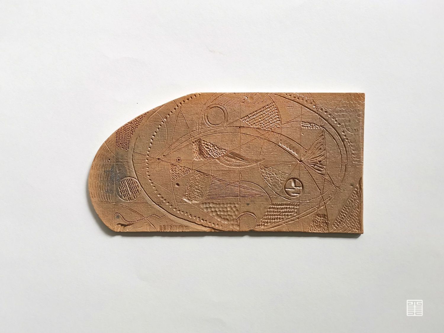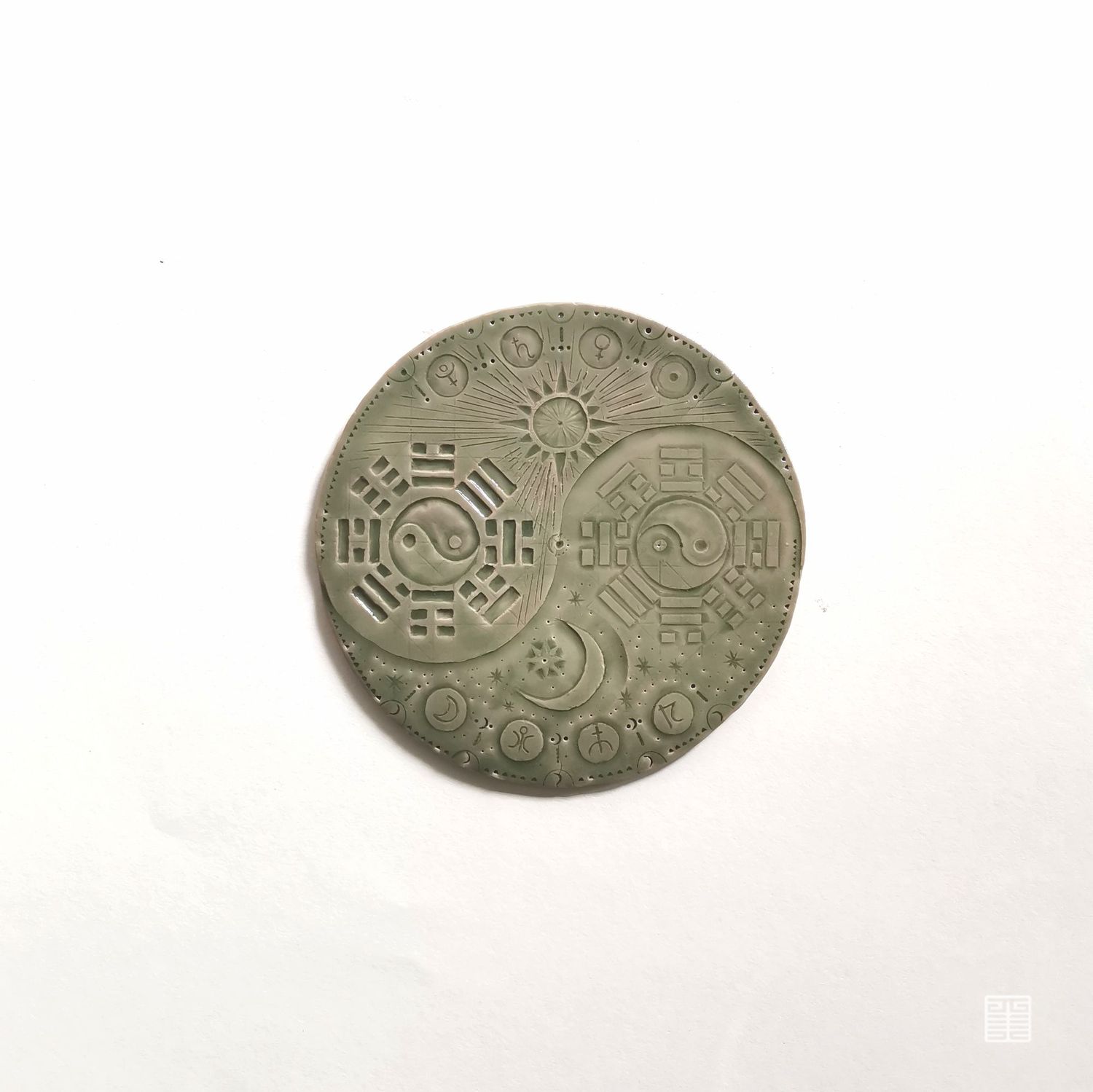 此盘主体运用了中国传统元素的太极图形,在太极“鱼眼”处用了两个八卦的形状,分别采用了阴刻与阳刻两种手法,象征阴阳两极,在盘的另一端则采用了“太阳”、“月亮”两个元素,也暗含了阴阳之意,在盘的周围则运用了八个西方元素的天文符号,代表着八个星。纳须弥于芥子,具象的物体之中都是无穷宇宙中自然的产物,本盘旨在表现个人与宇宙的关联。