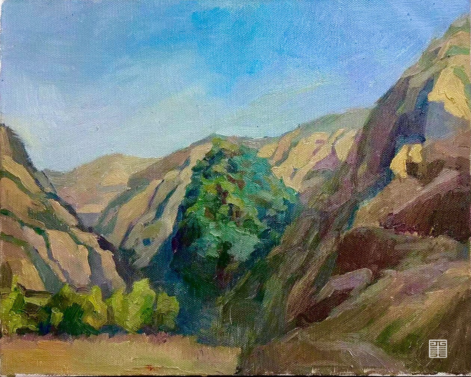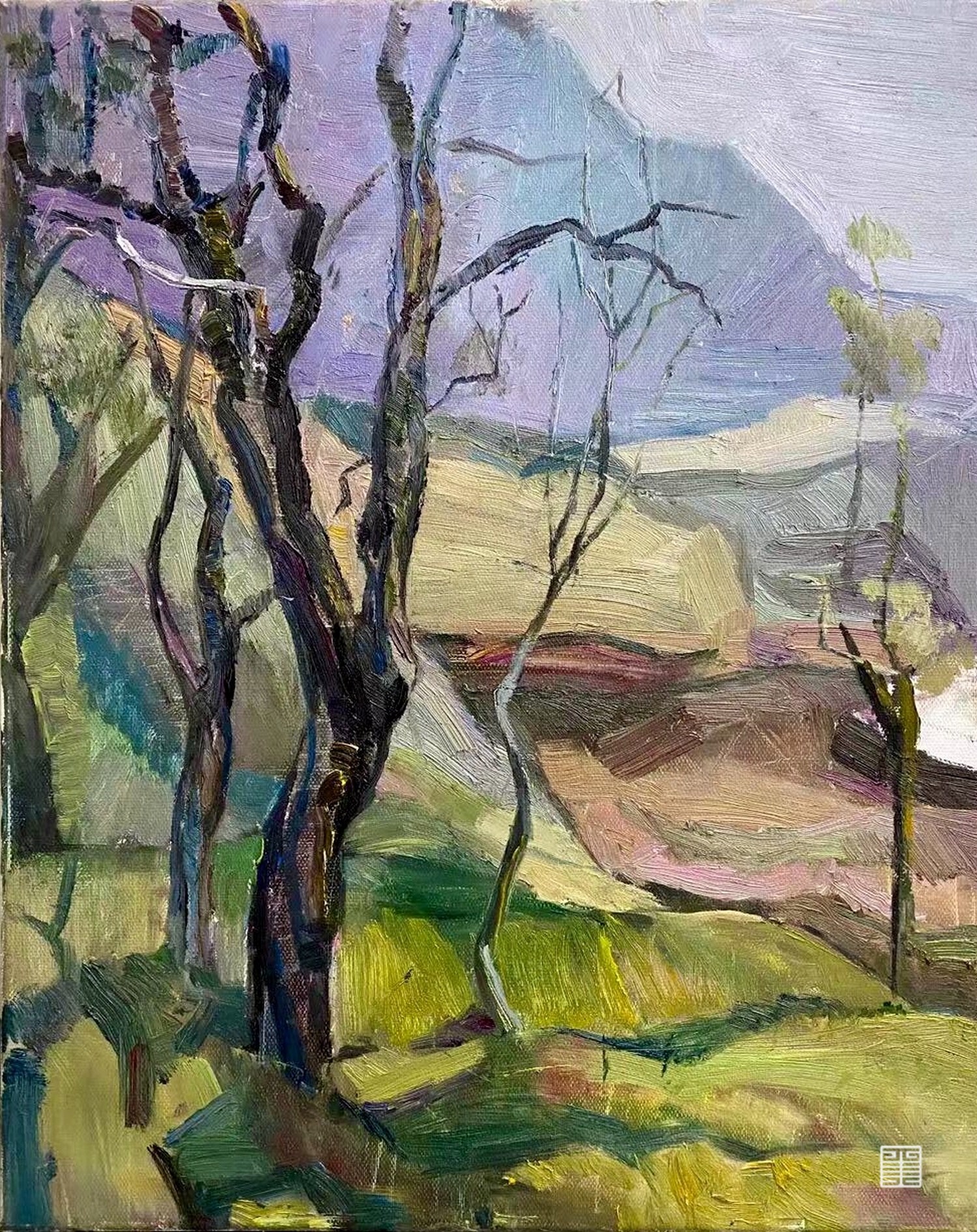 绥德写生,走进自然。偶然间看到清晨的光,强烈的明暗,延伸的构图,在场景中找到绘画的乐趣。从山坡地下走去,一层一层错乱的树枝相互交错,场景的疏密关系,强调画面中心。绘画在我眼里,就像是视觉欺骗,主观意识上的处理,组织眼前的场景,不停打破原有的客观印象,尝试,探索,纠结,最后进步。