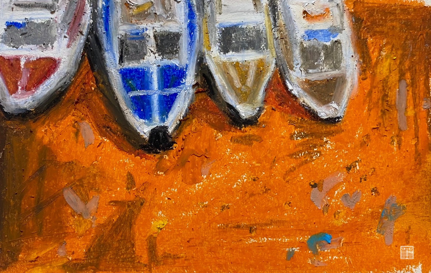 在创作中我选取了油画棒作为媒介,鲜艳的颜色和浑浊的边缘,很好的能体现船与湖水的关系,我将黑褐色的湖水处理成橙汁,让画面看起来更加有张力,或是说更具有精神污染的感觉。