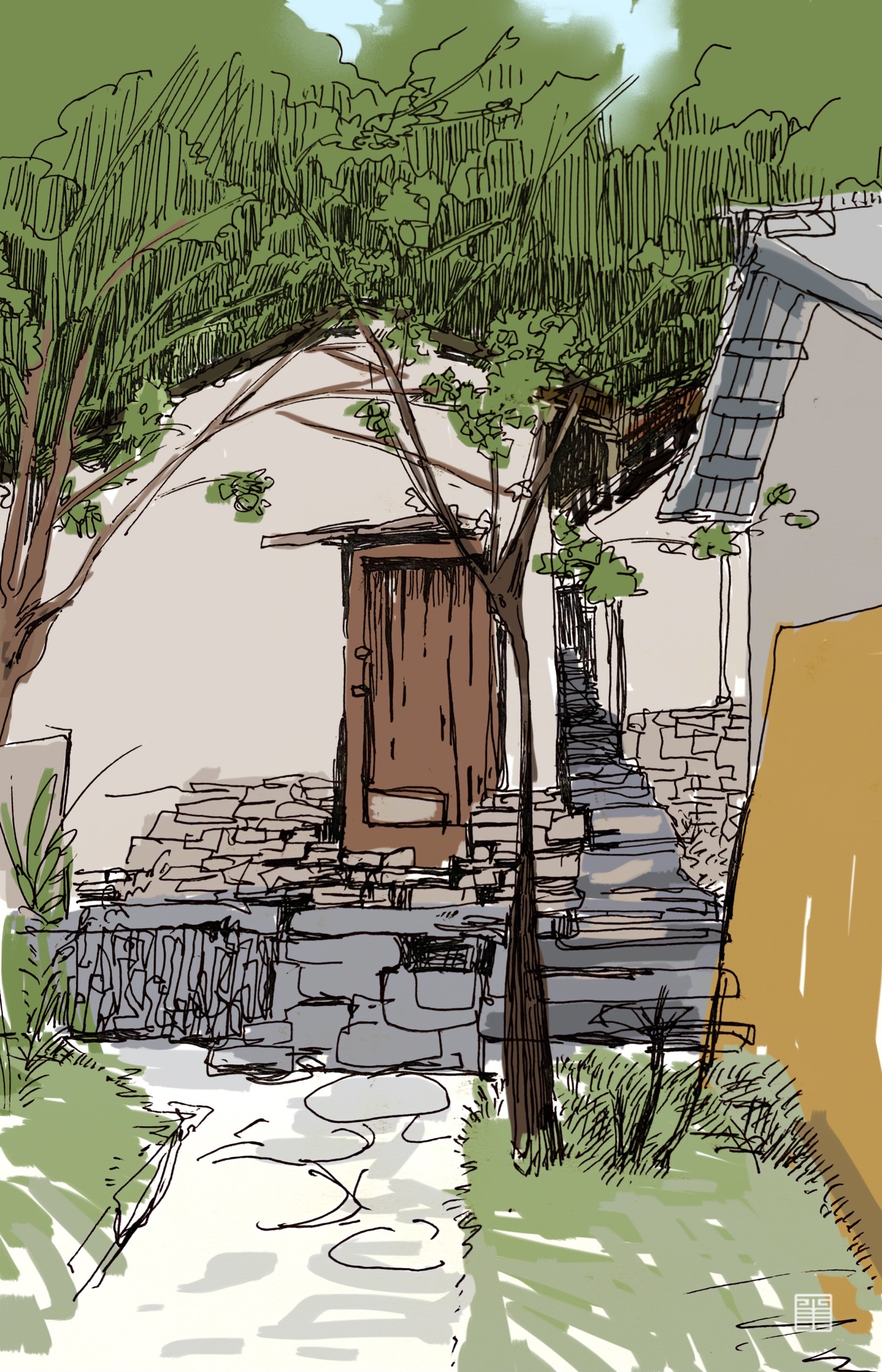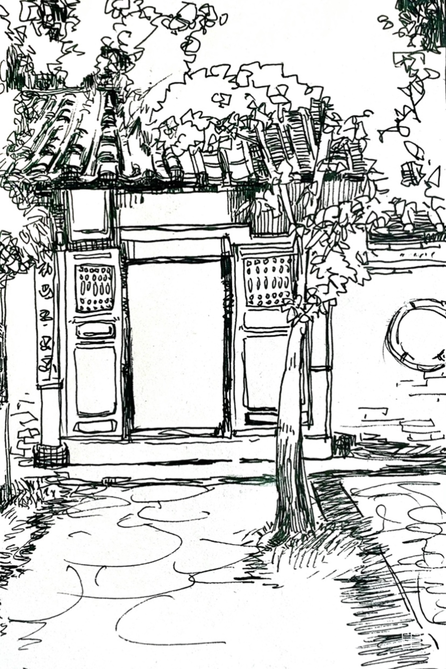这张用了速写的方式,快速捕捉了眼前的一幕,树木与房瓦相衬,这种层次很有意思,门和墙上的元素,我用一种很稚气的手法来记录充满年代的物体,这种反差莫名的有一丝趣味,或许能让严肃的建筑变得生机了罢。