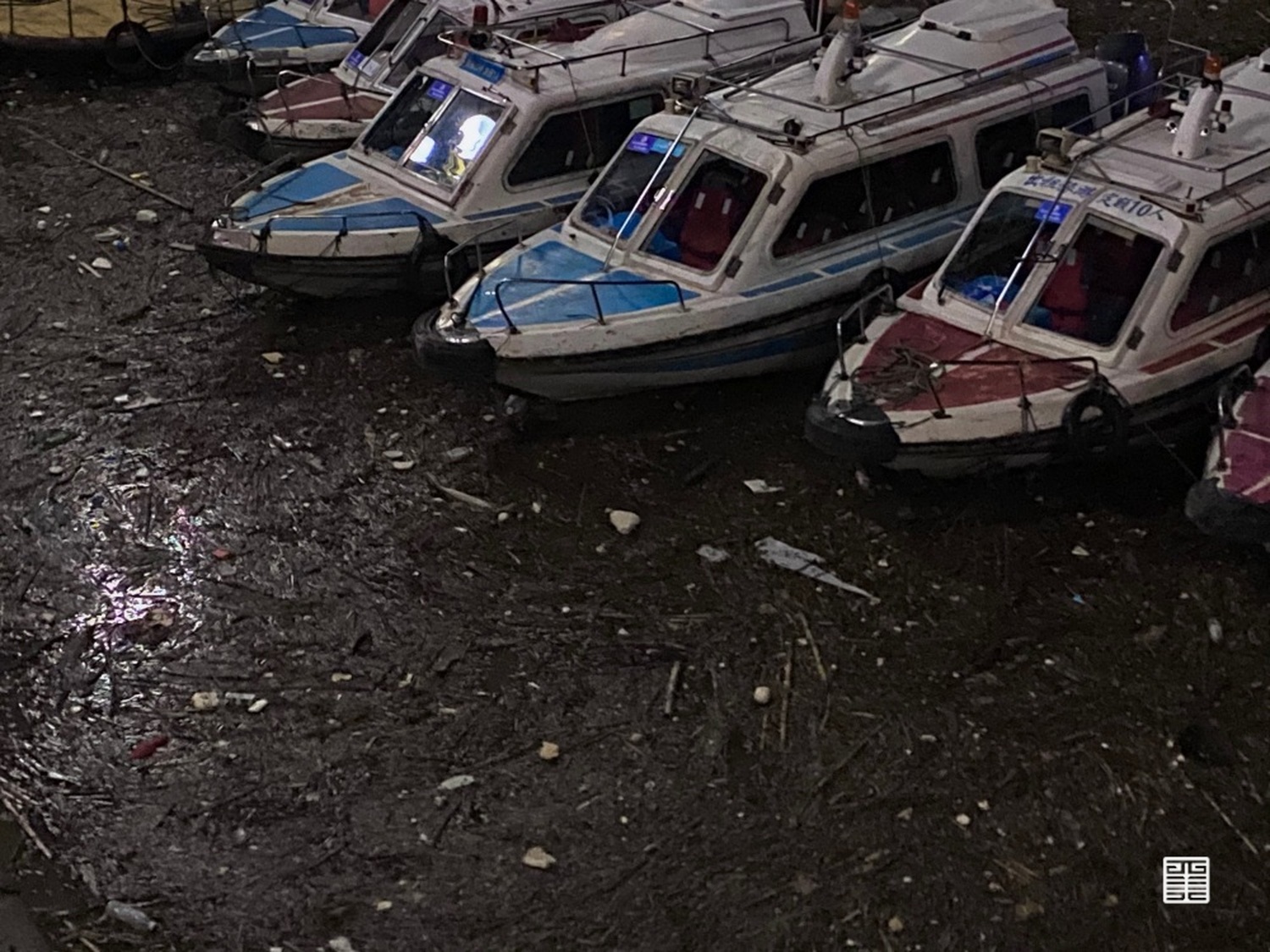 原景的湖是黑褐色的,在夜晚里如同沼泽,走进还会闻到一股恶臭,游艇停靠在岸边,它们鲜艳的颜色和这湖水形成了强烈的对比,仿佛在妥协,又似反抗。