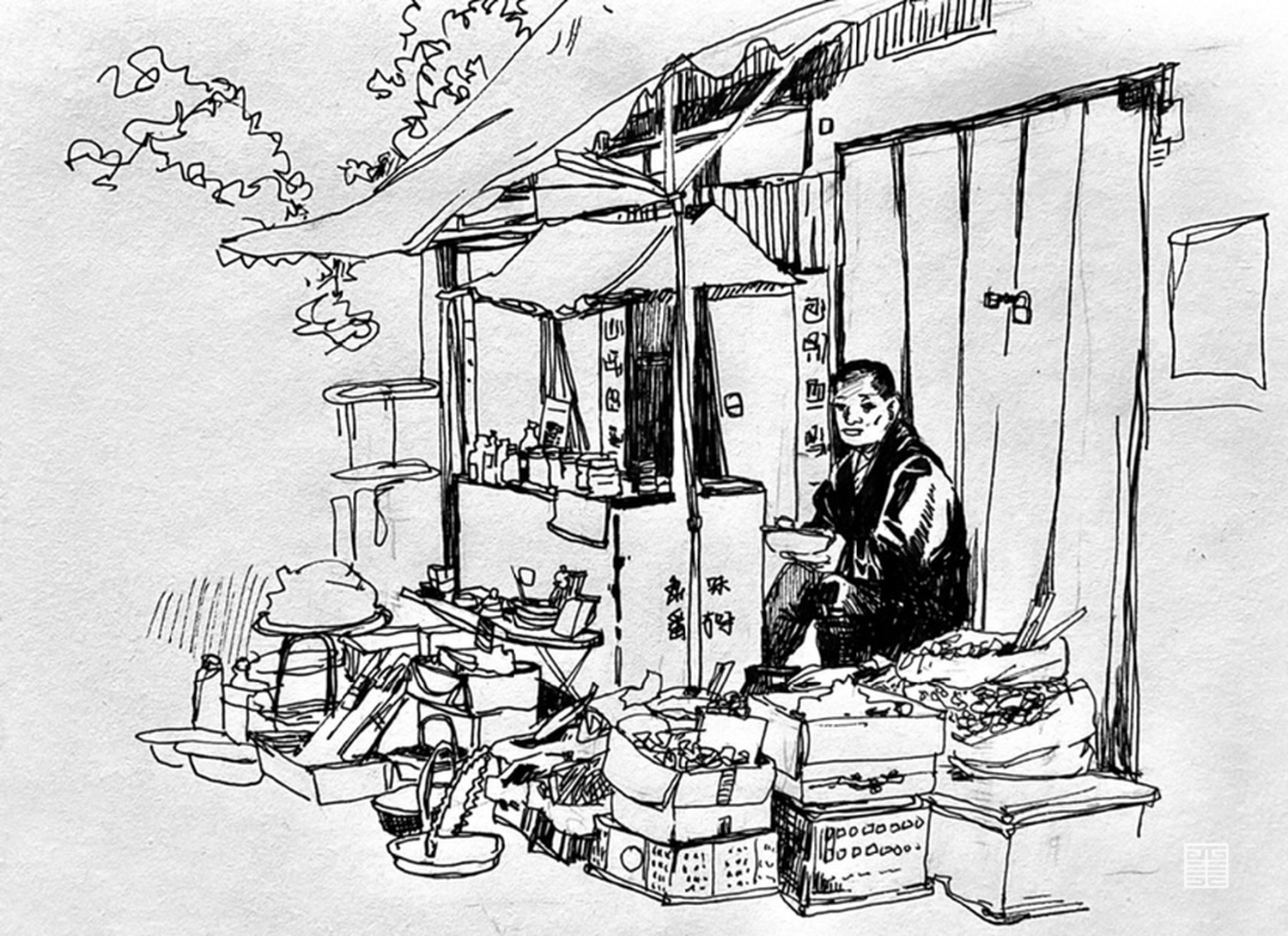 一位在摆摊的老师,它摆摊的东西和整个环境的构成吸引了我,让人想去表达。