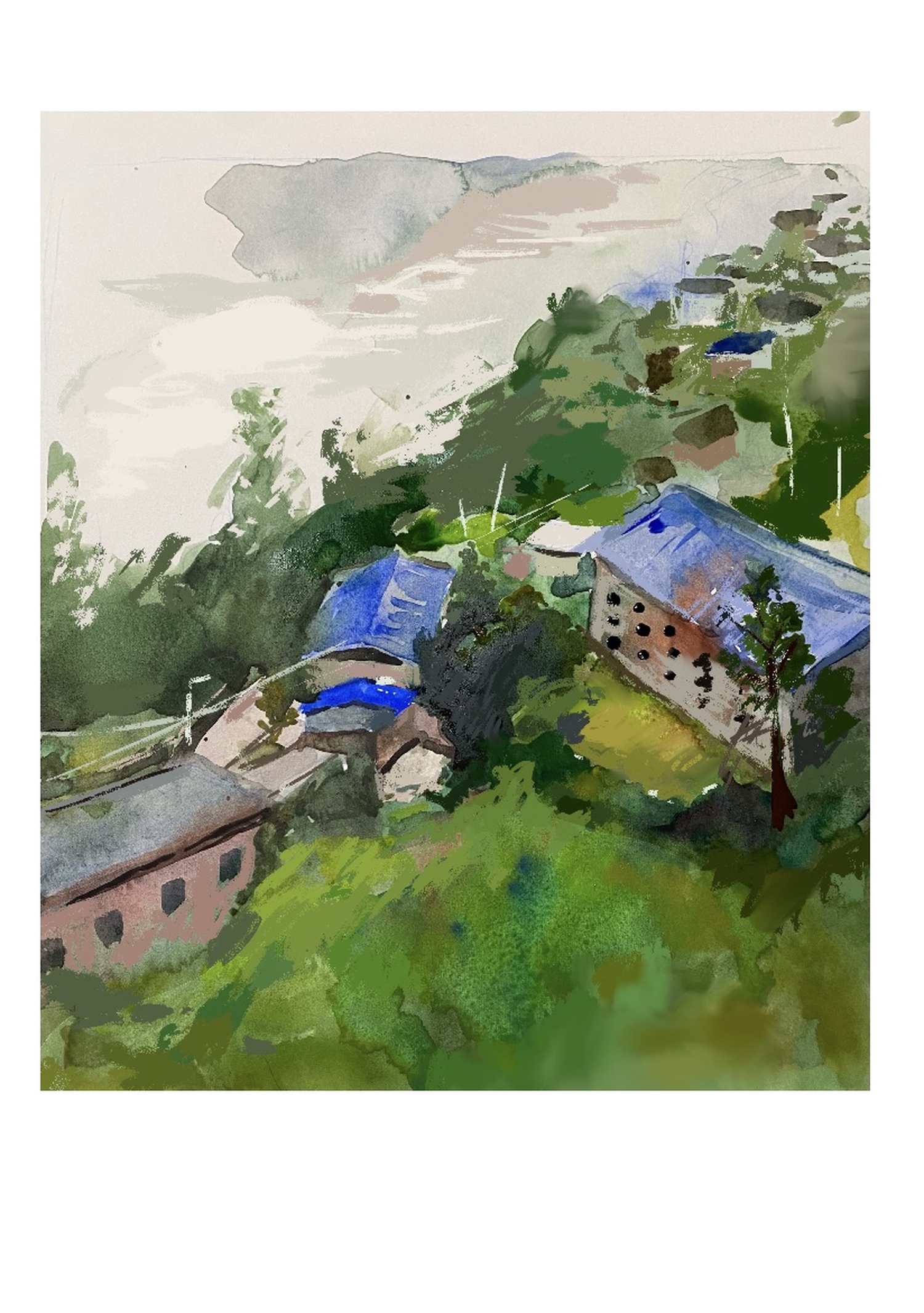 创作中我选用水彩,首先是因为水彩的笔触,比较适合表现山水风景;其次是因为颜色鲜艳,可能是因为我不太会调色,最后画面给人一种儿童画的感觉。