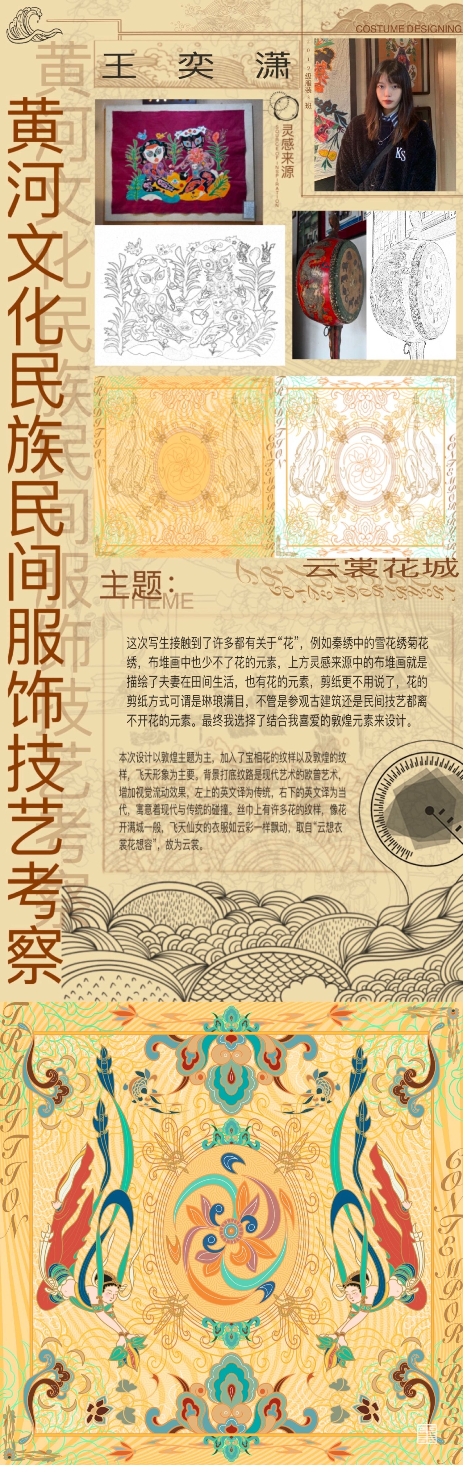 本次设计以敦煌主题为主,加入了宝相花的纹样以及敦煌的纹样,飞天形象为主要。背景打底纹路是现代艺术的欧普艺术,增加视觉流动效果,左上的英文译为传统,右下的英文译为当代,寓意着现代与传统的碰撞。丝巾上有许多花的纹样,像花开满城一般,飞天仙女的衣服如云彩一样飘动,取自"云想衣裳花想容",故为云裳。