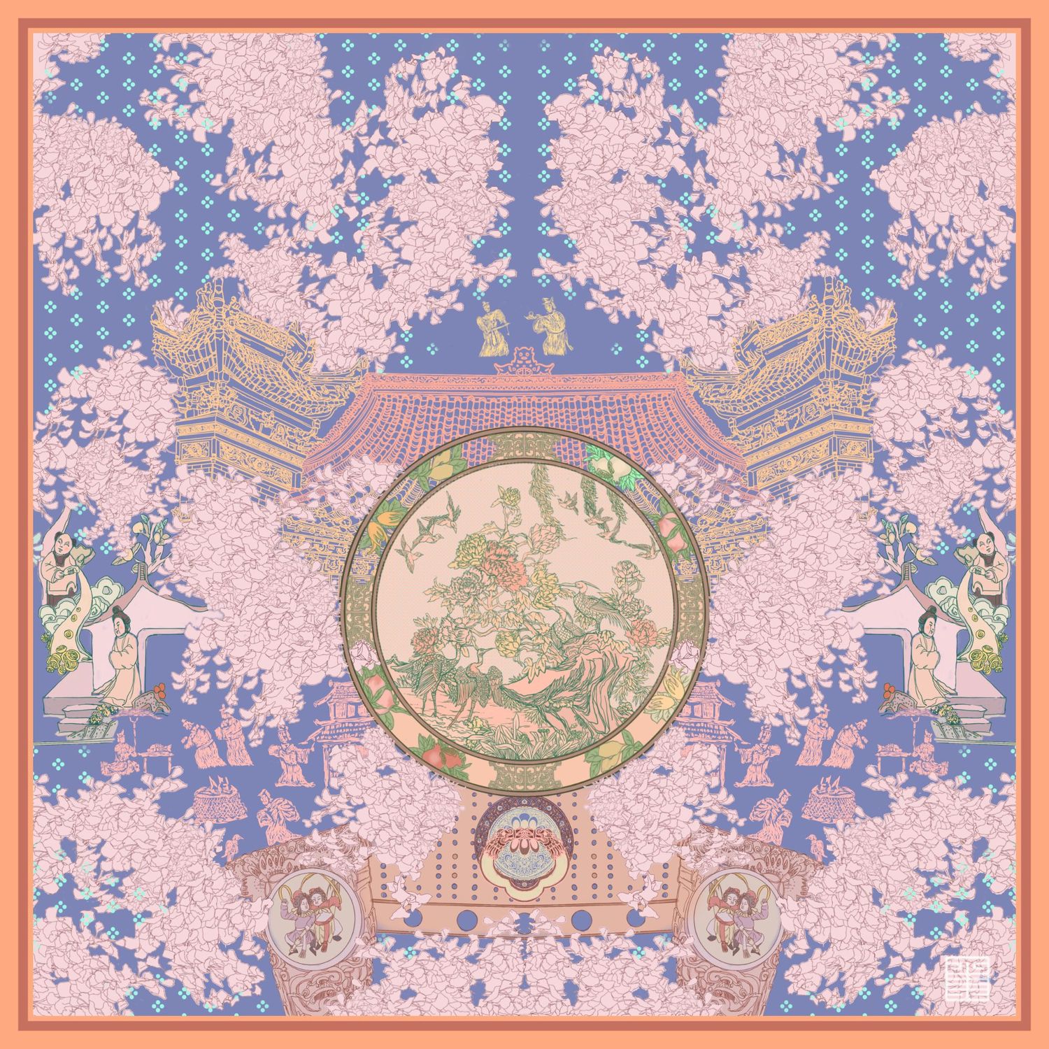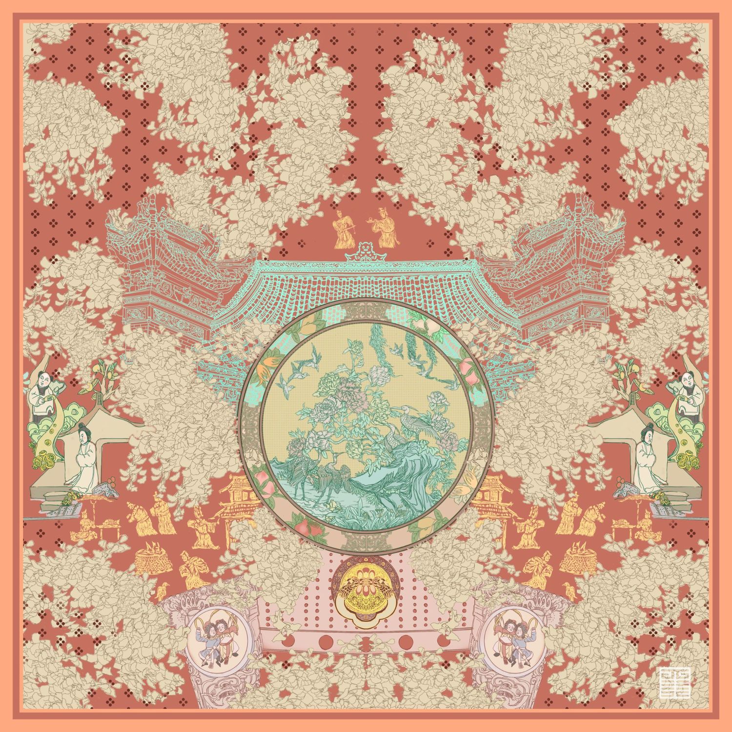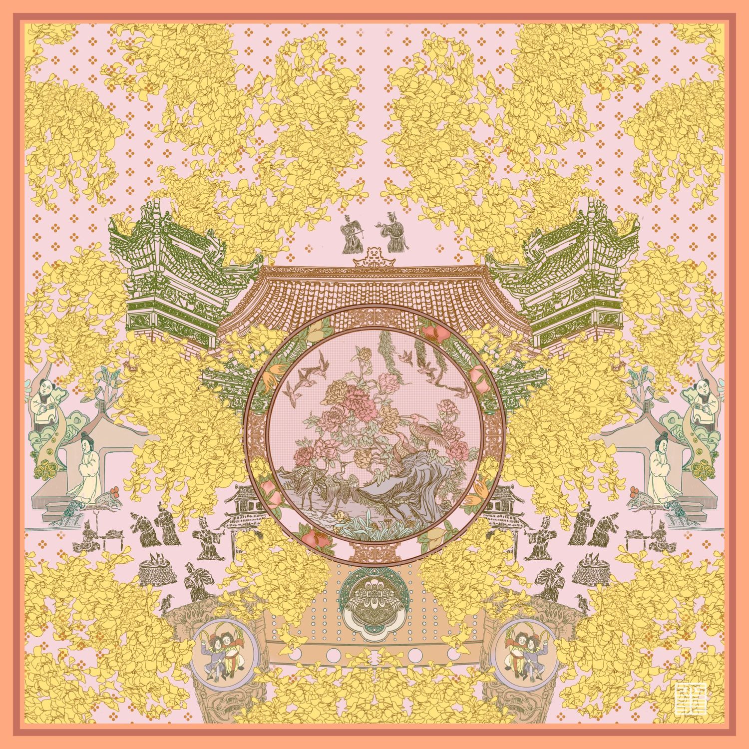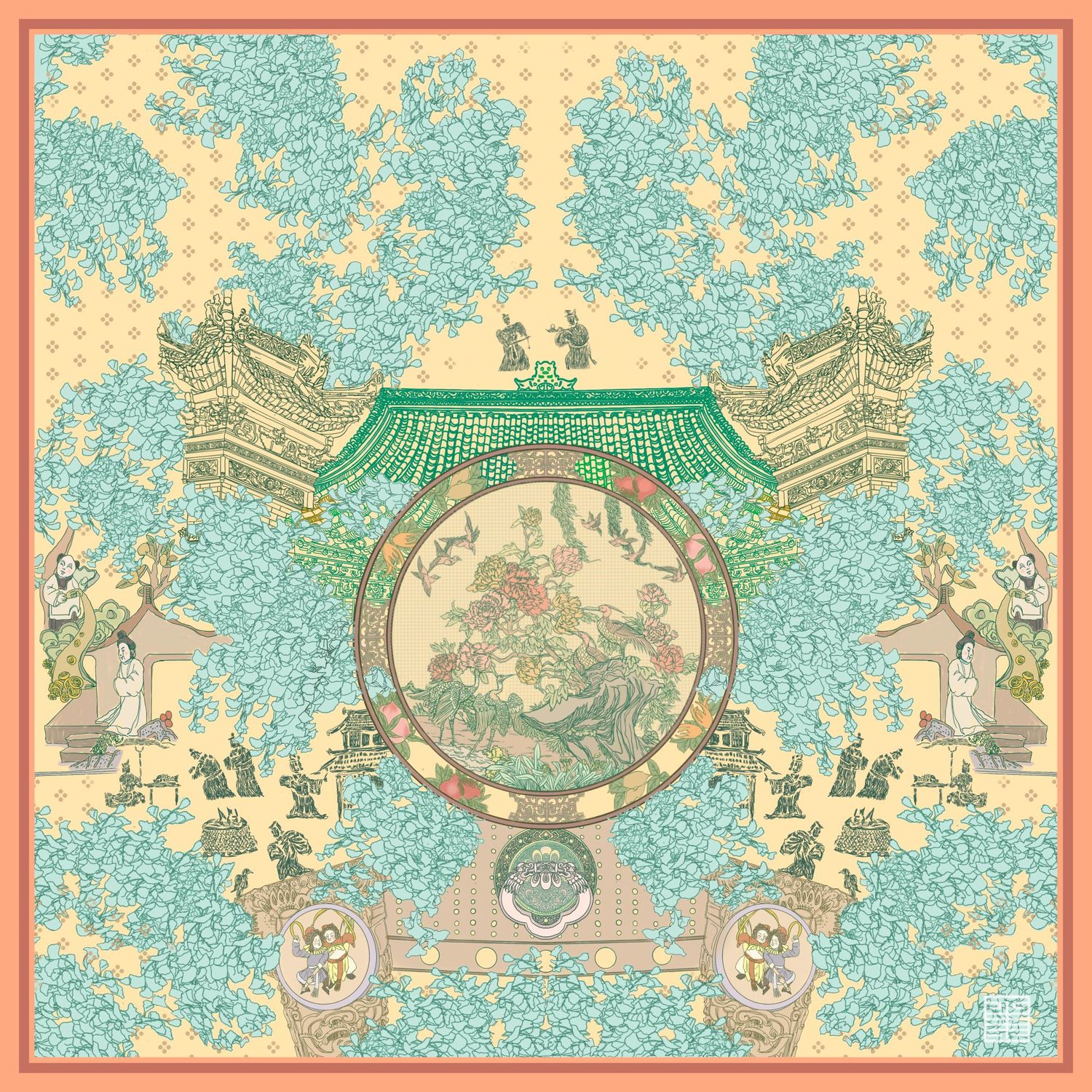 主题为关中民俗博物院的梨园建筑,用银杏叶为装饰,在间隙中加入建筑上的雕塑图案及影拓图像。中间为古代屏风,屏风中以现代圆点图样增加现代性,下边是城墙门的门环。整体以线的方式描绘关中民俗博物院的建筑图景,利用景物的不同表现去形成画面的疏密关系,对称的方式更体现中华传统之美。丝巾以传统色来填充,以对比色、邻近色、同类色等变化表现梨园四季景色的变化,展示每个人心中对中国传统诗意栖居的遐想。
