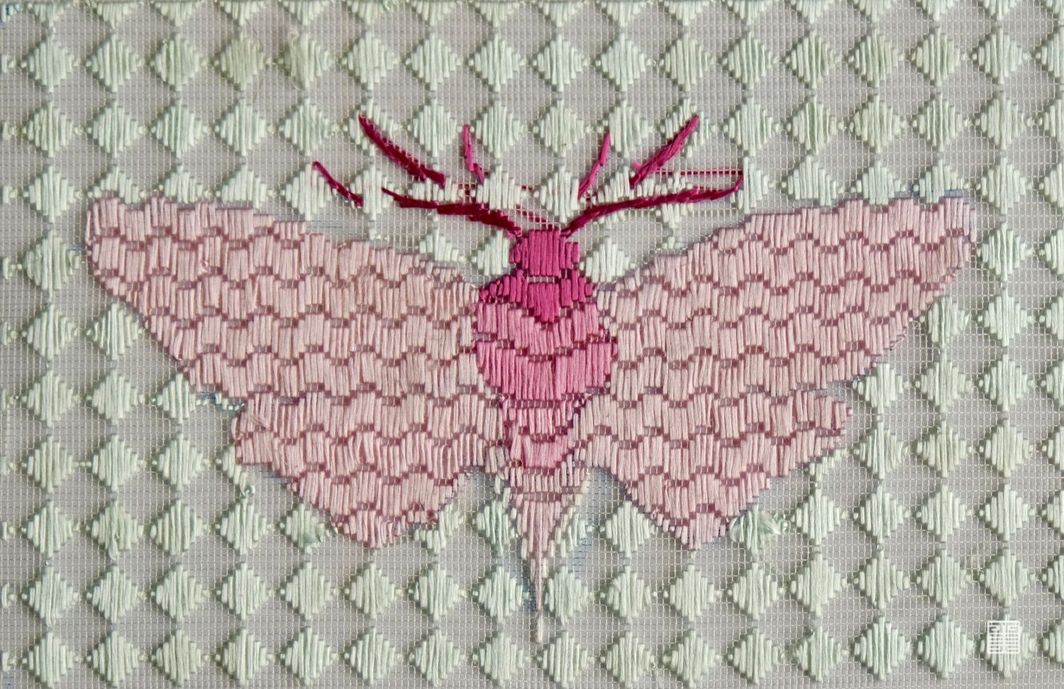通过秦绣的针法对设计图案进行制作。作品名称取自温庭筠《清异录·花贼》中的“花贼玉腰奴”,意指蝴蝶就如起舞的女子一般曼妙。