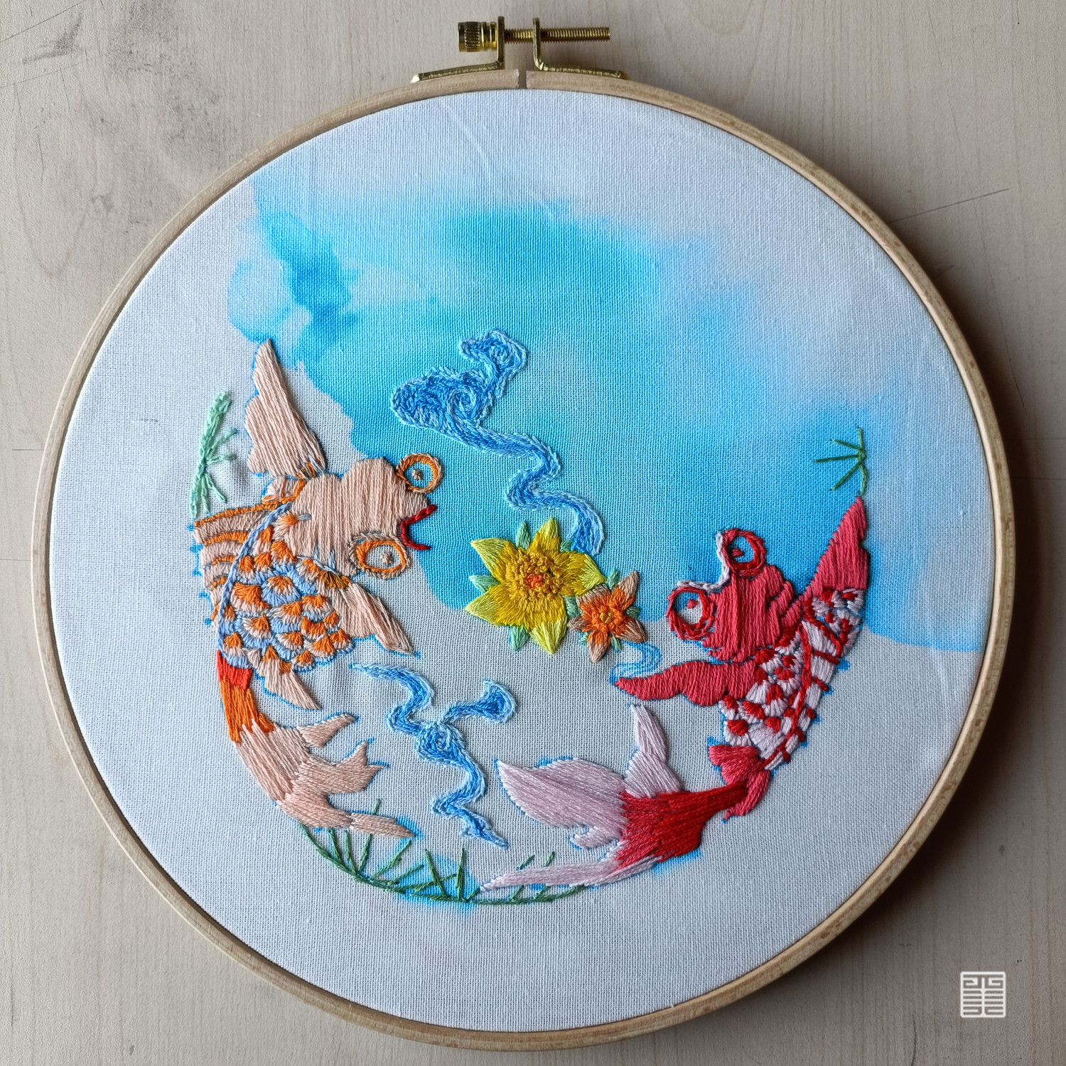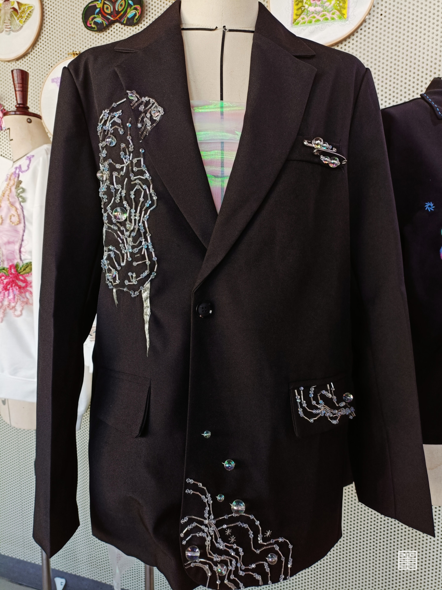 成衣图案来自关中民俗博物馆寿山图砖雕,该砖雕是突兀耸立造型奇特的山石,呈灵芝状摆放,线条明快,峰回路转,变化无穷,寓意寿比南山,长生不老,将传统的图案内涵用珠绣澄城刺绣等方式重新呈现在成衣上。