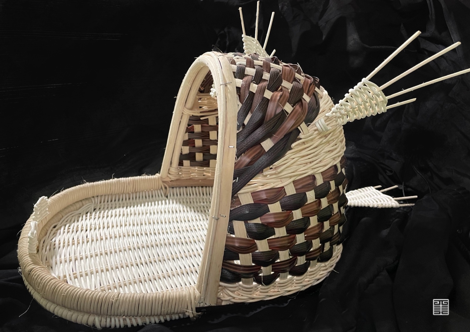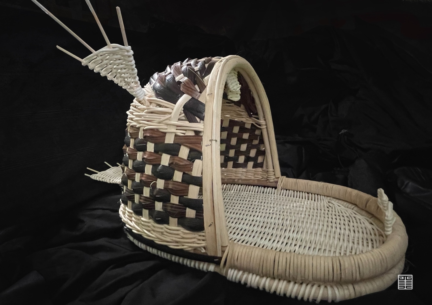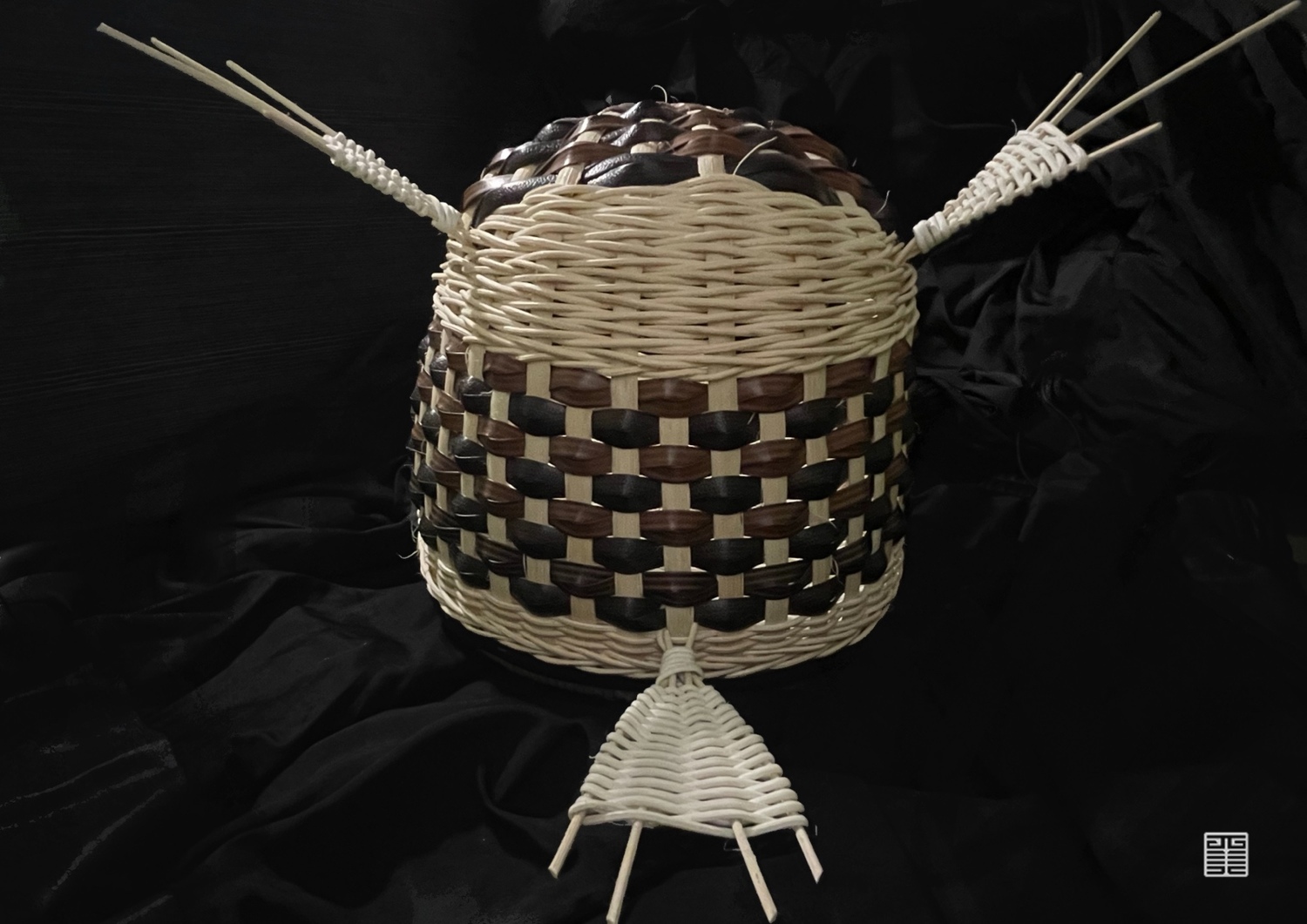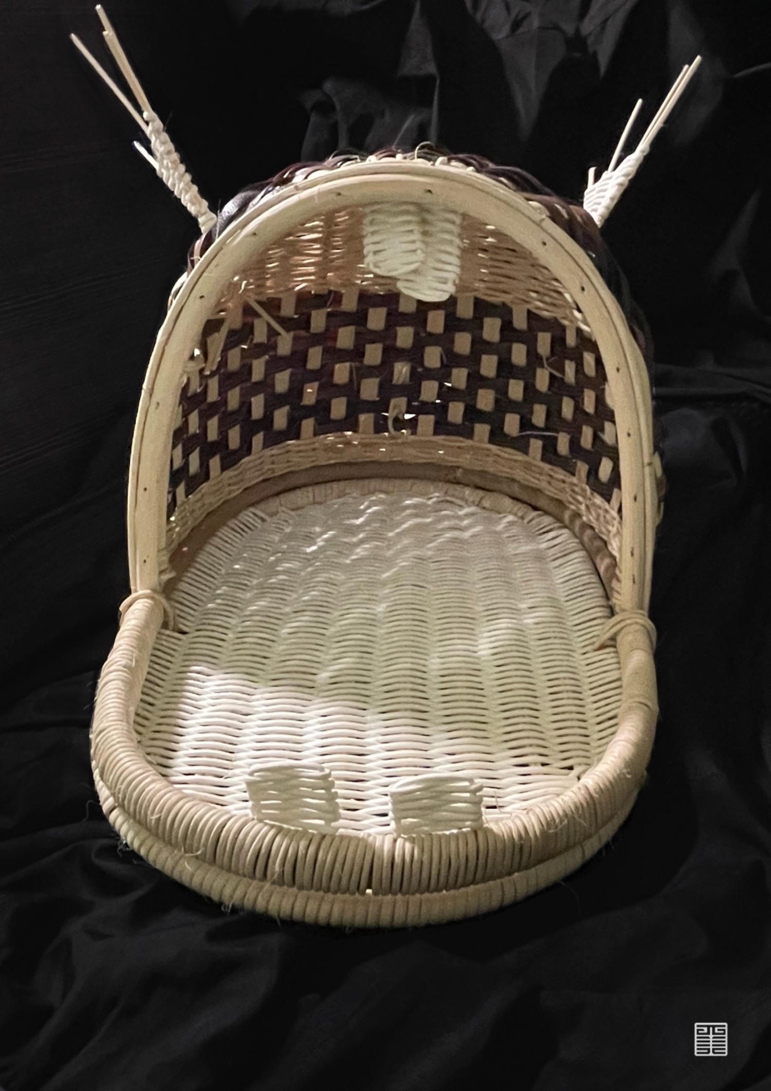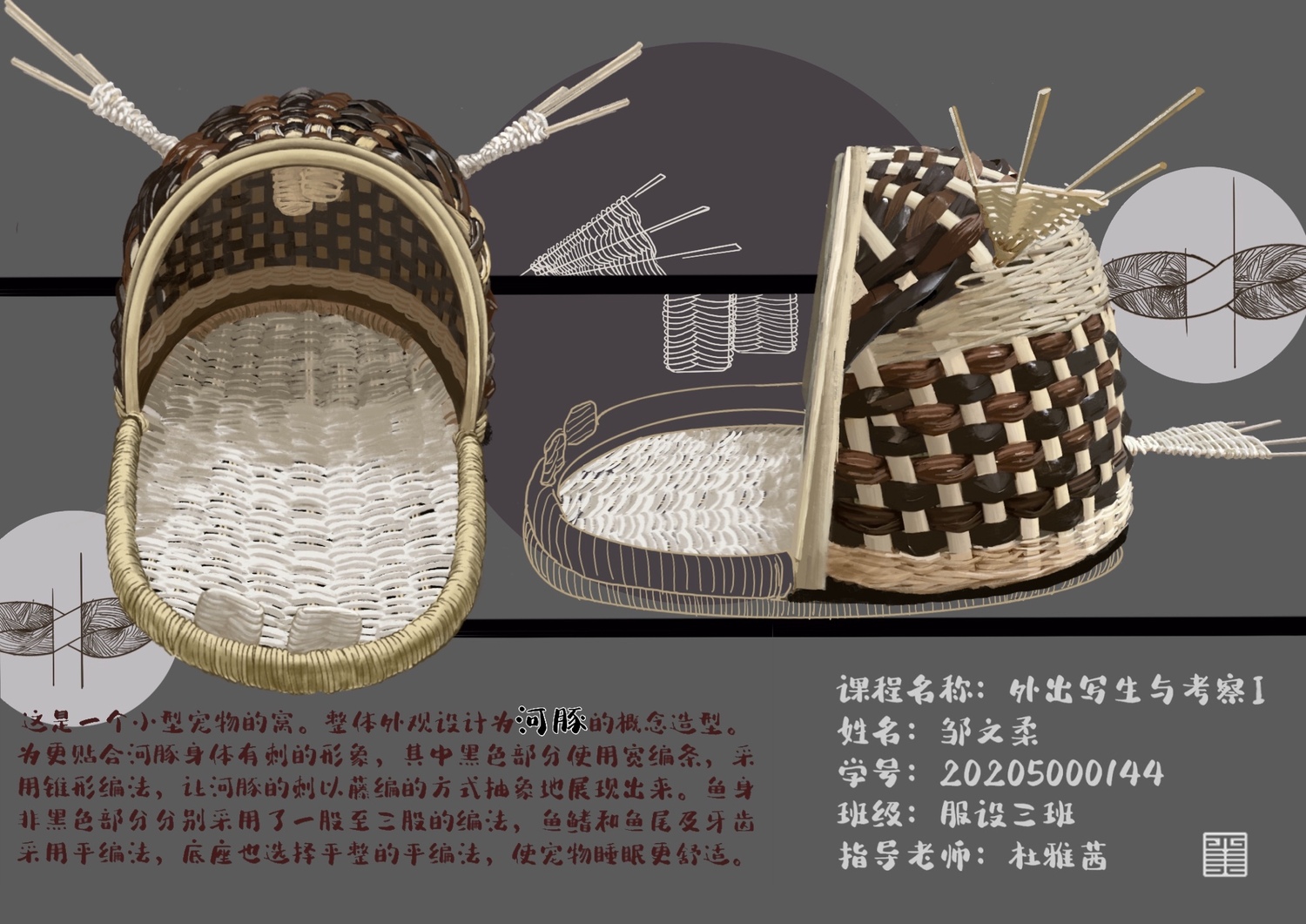 这是一个小型宠物的窝。整体外观设计为河豚的概念造型。为更贴合河豚身体有刺的形象,其中黑色部分使用宽编条,采用锥形编法,让河豚的刺以藤编的方式抽象地展现出来。鱼身非黑色部分分别采用了一股至三股的编法,鱼鳍和鱼尾及牙齿采用平编法,底座也选择平整的平编法,使宠物睡眠更加舒适。