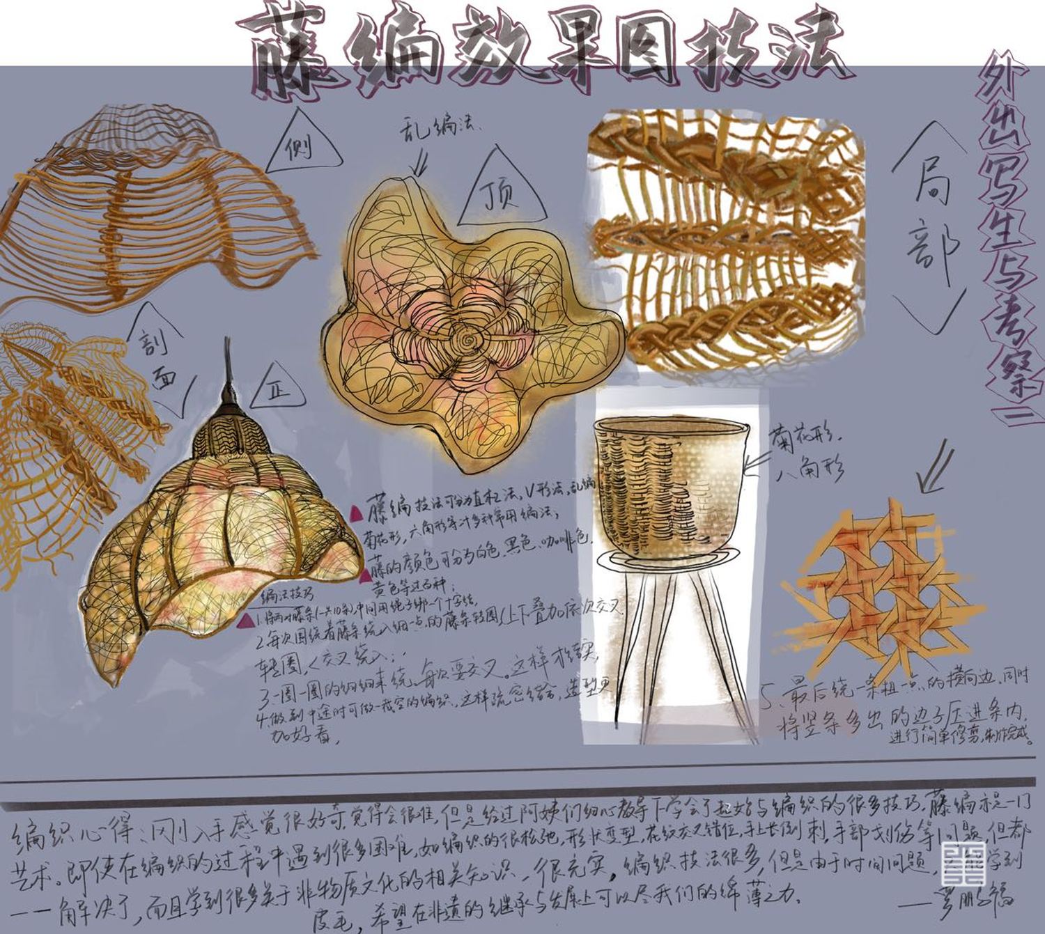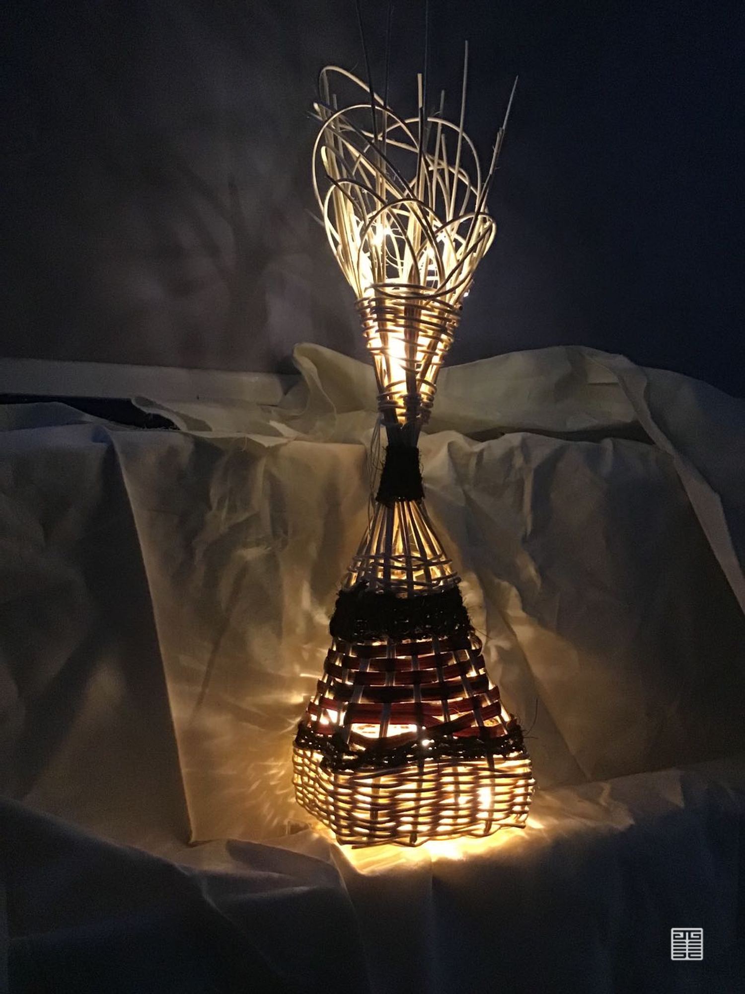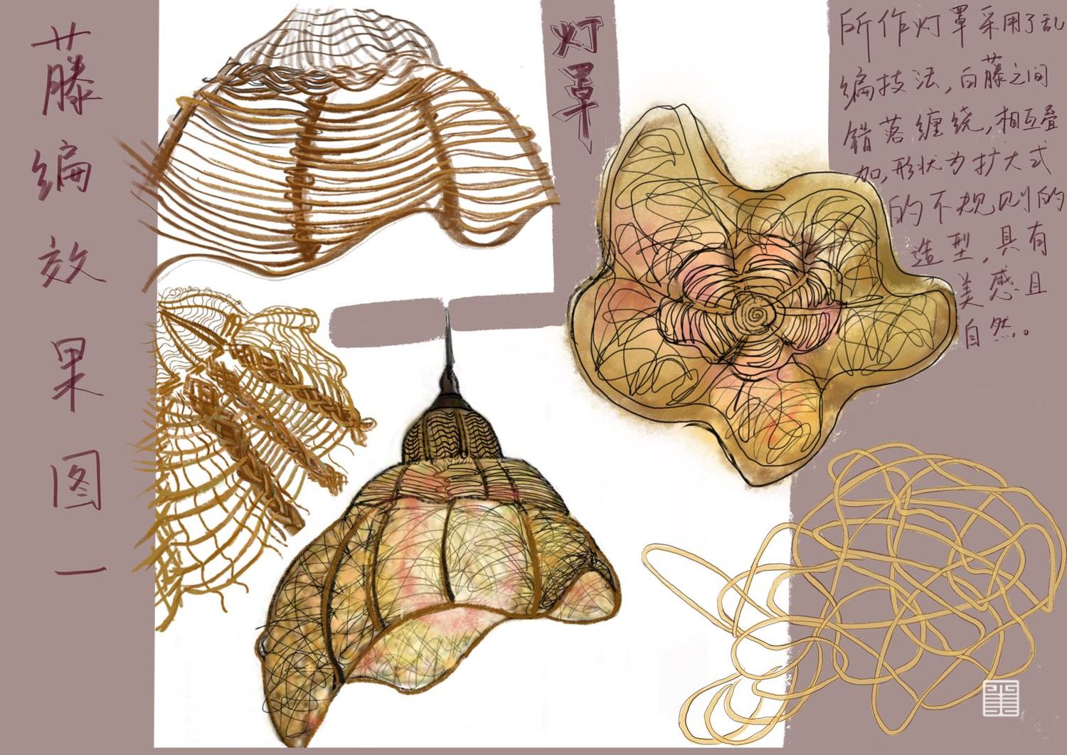 灯瓶与灯罩的制作采用传统的编织手法,其中运用了藤编的三种技法,乱编法,藤条编制打底,叠加法,藤编独一无二的纹路肌理,为日常生活增添自然与手工的温暖气息,其灯瓶作品具有独特的魅力与装饰效果,灯罩具有传统手艺的魅力,应用在现代家具产品上,不失藤编的本色,更添一份养眼。制作灯罩时以较粗的藤条为骨架,经钉架,再用藤皮、藤芯采用乱编法编织而成,最后上油漆或上色,不规则的空隙透过不规则的光,产生不规则的光影,给人一种自然与舒适的感觉。