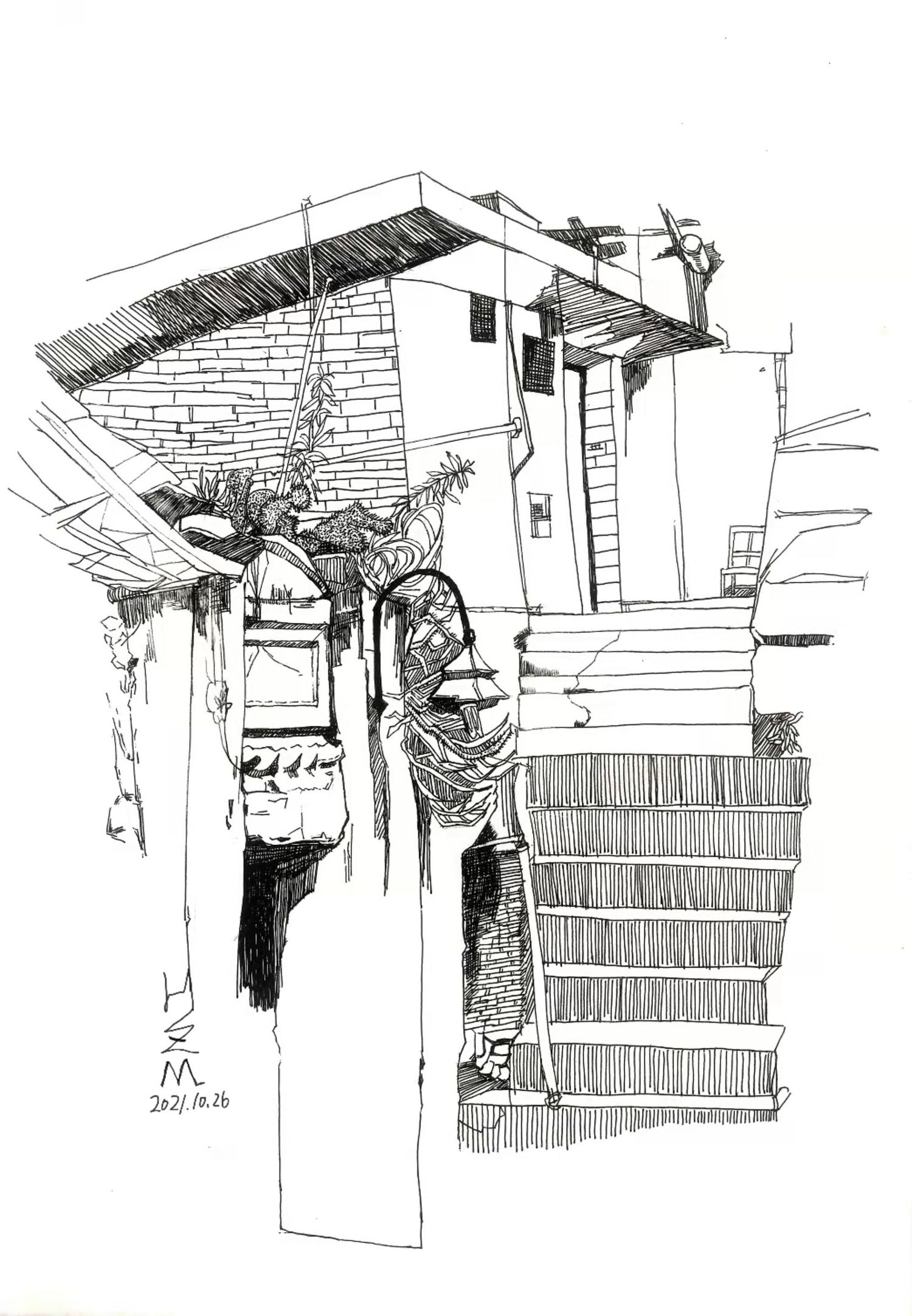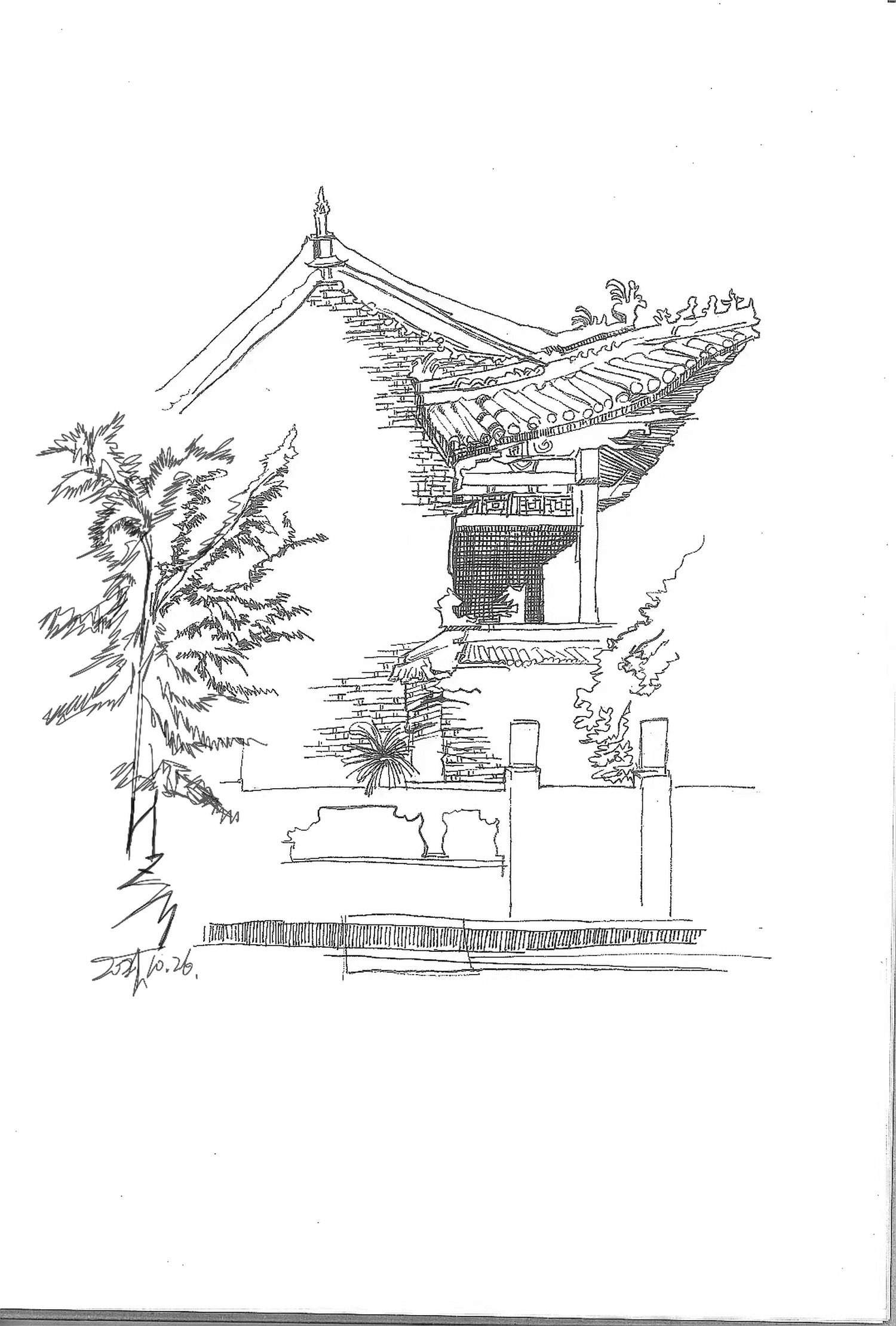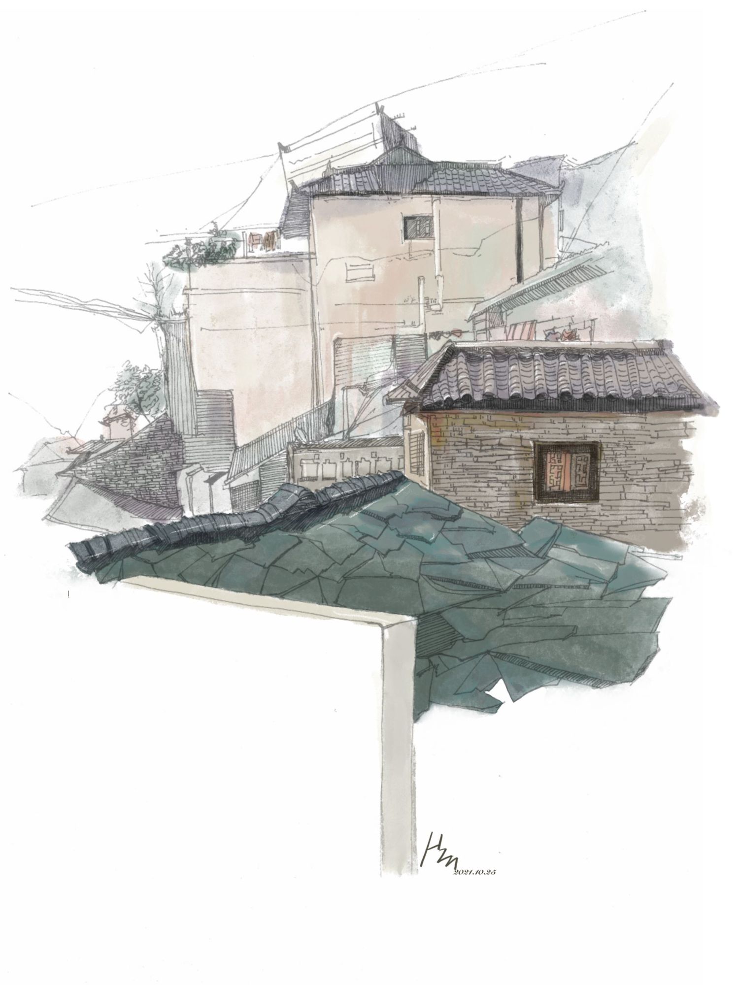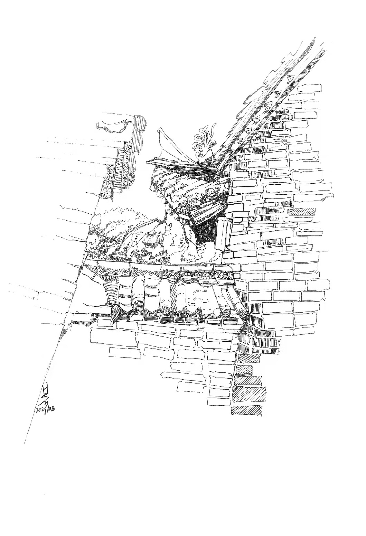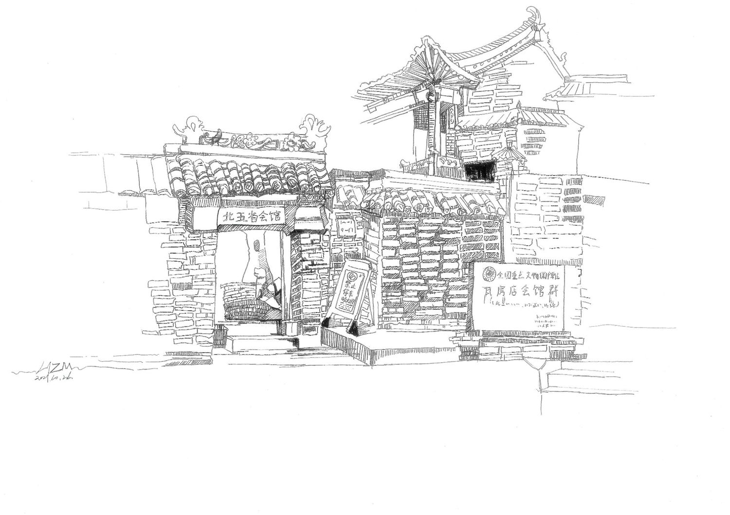 大多数作品都是于北五省会馆绘画,当地的建筑屋檐非常亮眼,殿堂壁画也具有艺术魅力。这里当地居住的小镇屋檐以墨色的石板为主,与群山形成美丽的山水画风格。