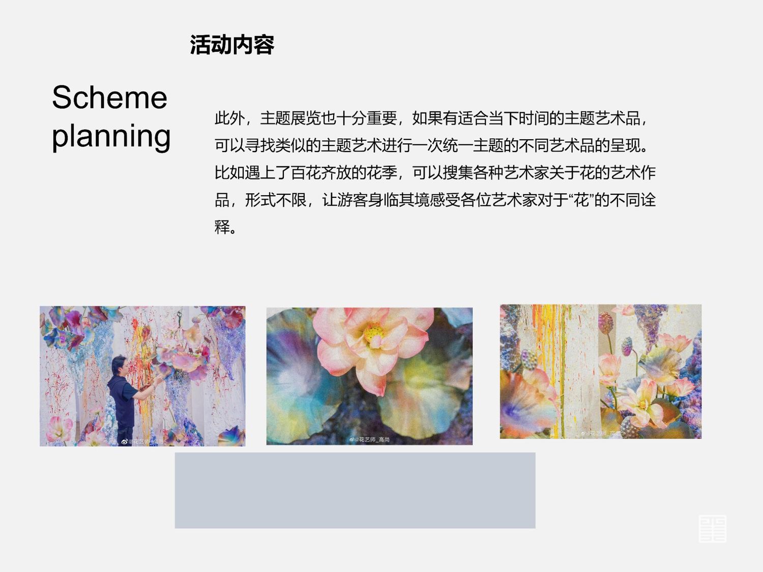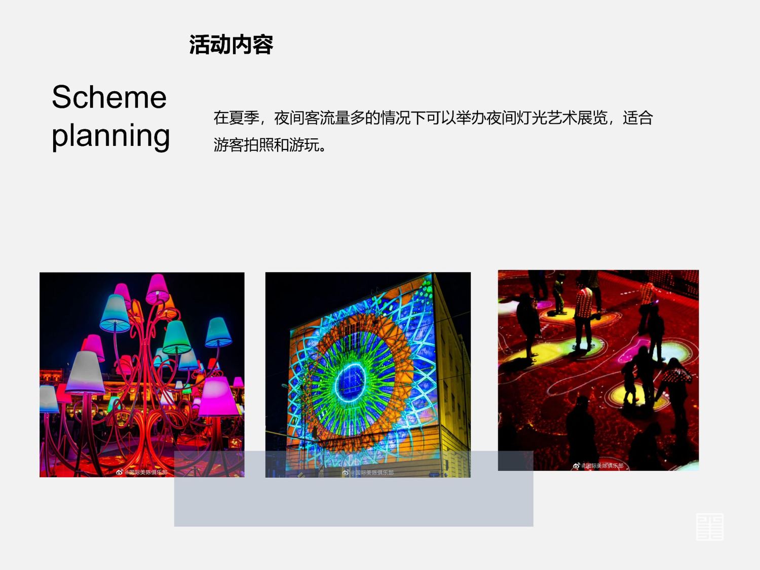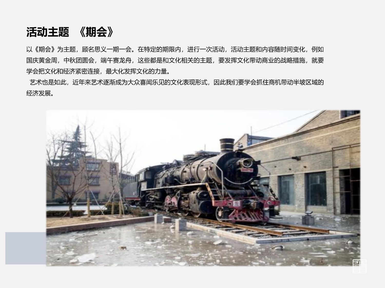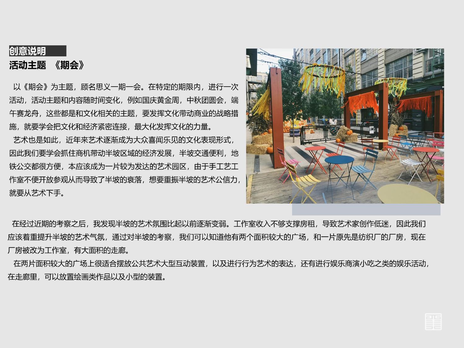 以《期会》为主题,顾名思义一期一会。在特定的期限内,进行一次活动,活动主题和内容随时间变化,例如国庆黄金周,中秋团圆会,端午赛龙舟,这些都是和文化相关的主题,要发挥文化带动商业的战略措施,就要学会把文化和经济紧密连接,最大化发挥文化的力量。