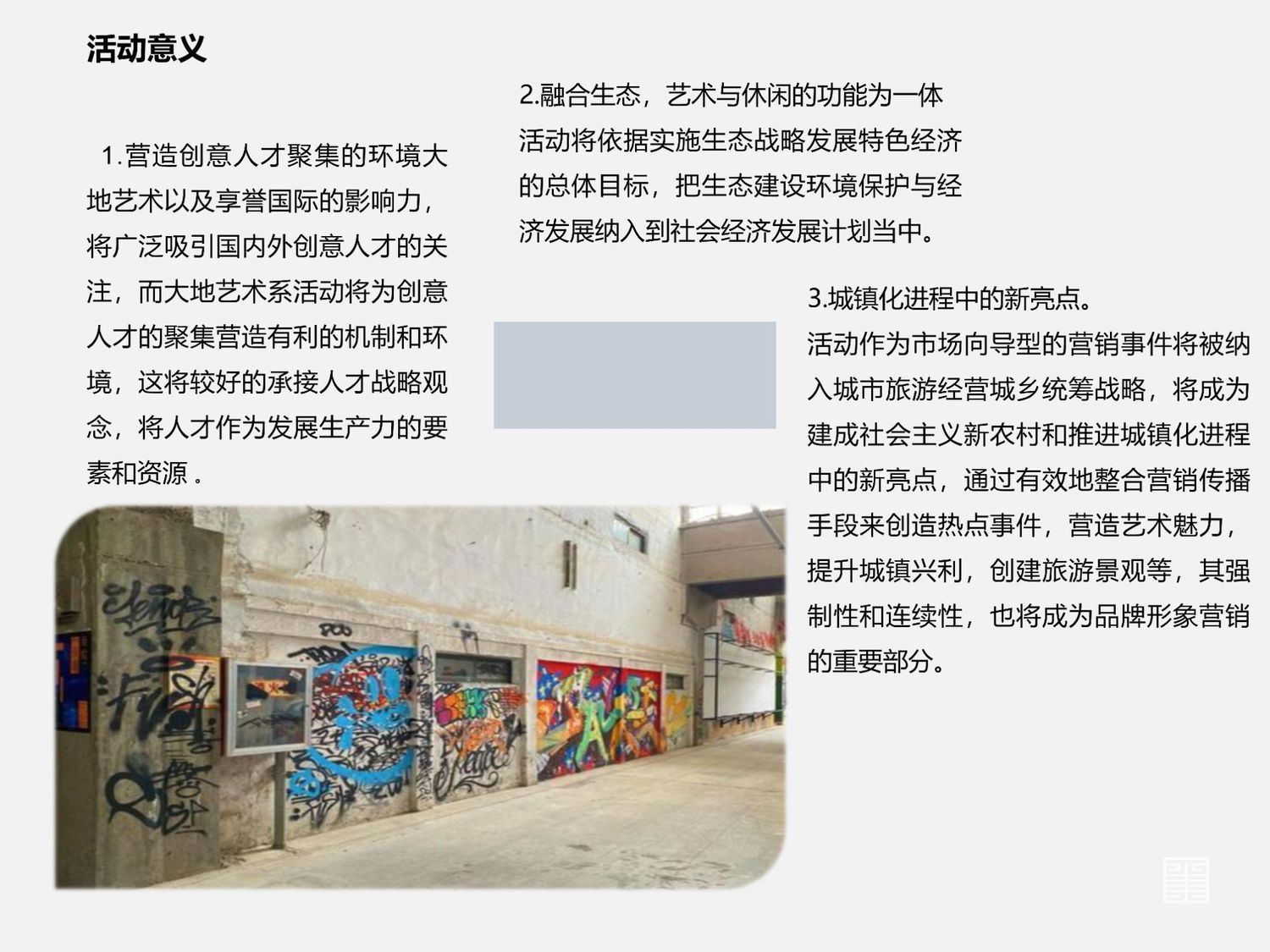 1.营造创意人才聚集的环境大地艺术以及享誉国际的影响力,将广泛吸引国内外创意人才的关注,而大地艺术系活动将为创意人才的聚集营造有利的机制和环境,这将较好的承接人才战略观念,将人才作为发展生产力的要素和资源 。