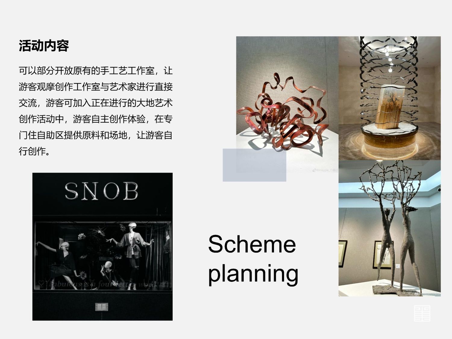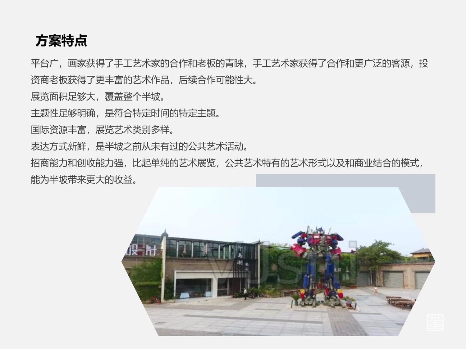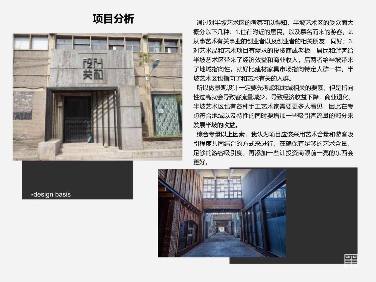 艺术也是如此,近年来艺术逐渐成为大众喜闻乐见的文化表现形式,因此我们要学会抓住商机带动半坡区域的经济发展,半坡交通便利,地铁公交都很方便,本应该成为一片较为发达的艺术园区,由于手工艺工作室不便开放参观从而导致了半坡的衰落,想要重振半坡的艺术公信力,就要从艺术下手。