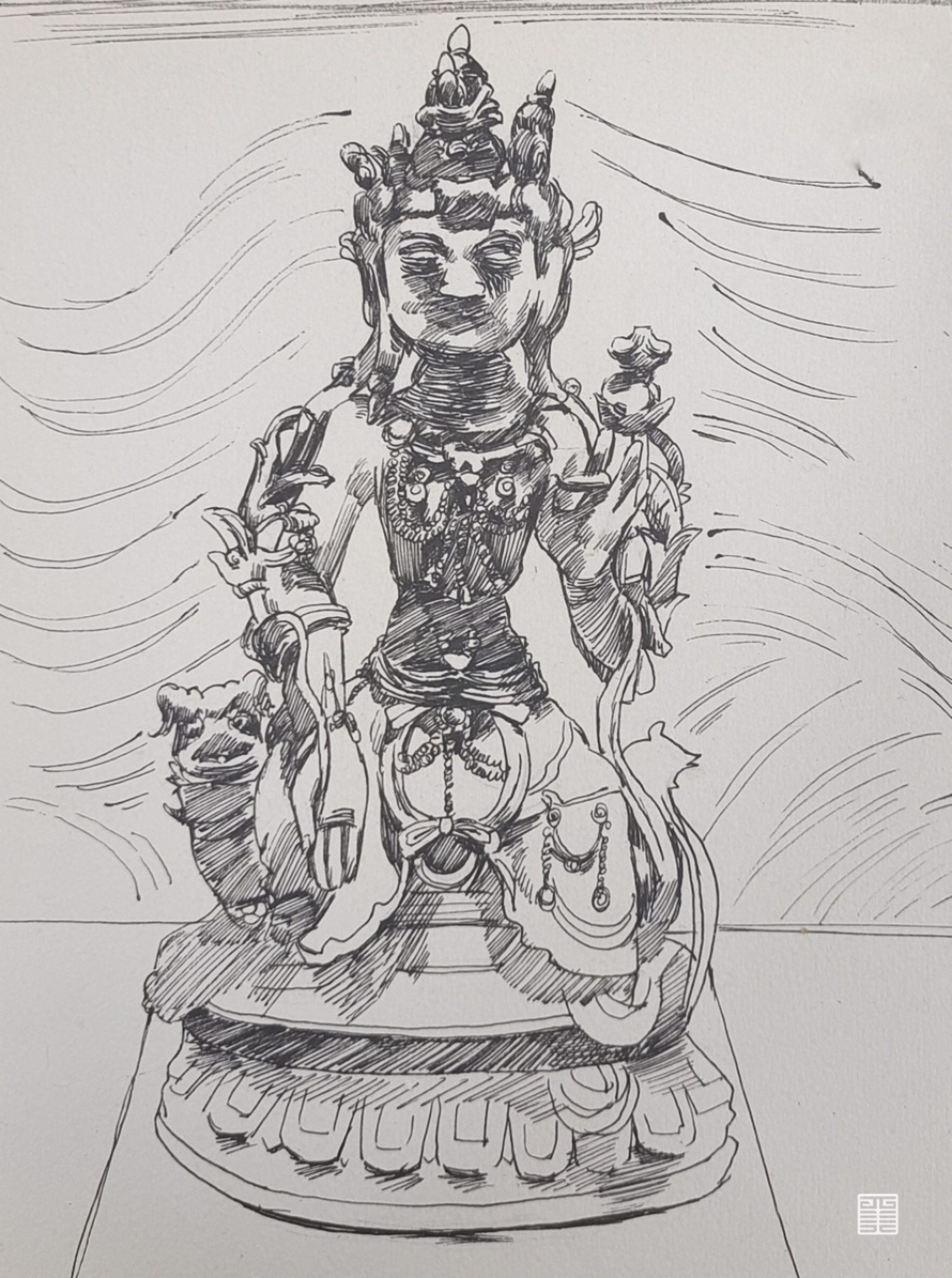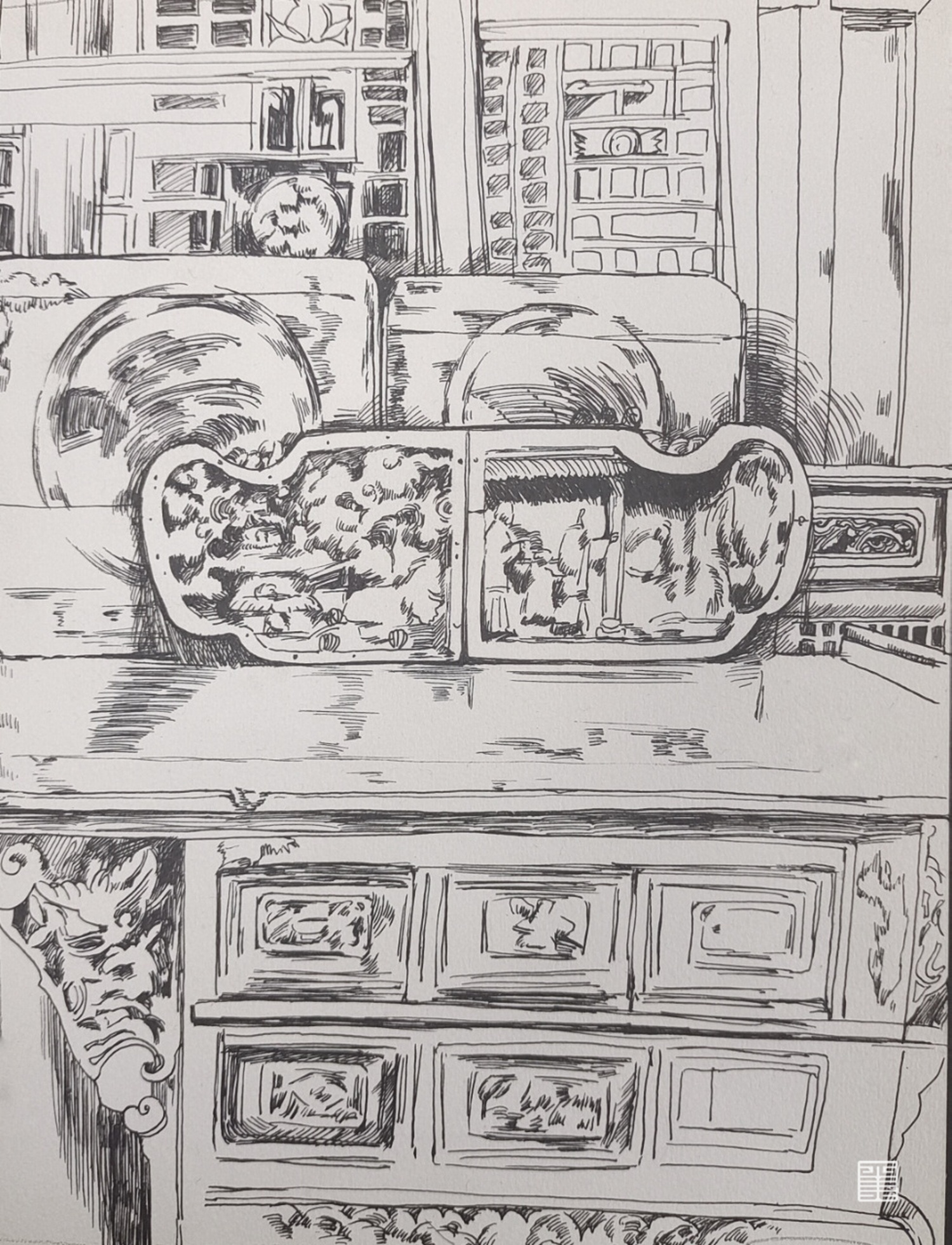 三幅作品分别为:1.张良庙的石狮子,因其神态生动从而进行了写生;2.是青木川瞿家大院内的一个家具,花样繁多:3.是拜将坛内展览的文物。