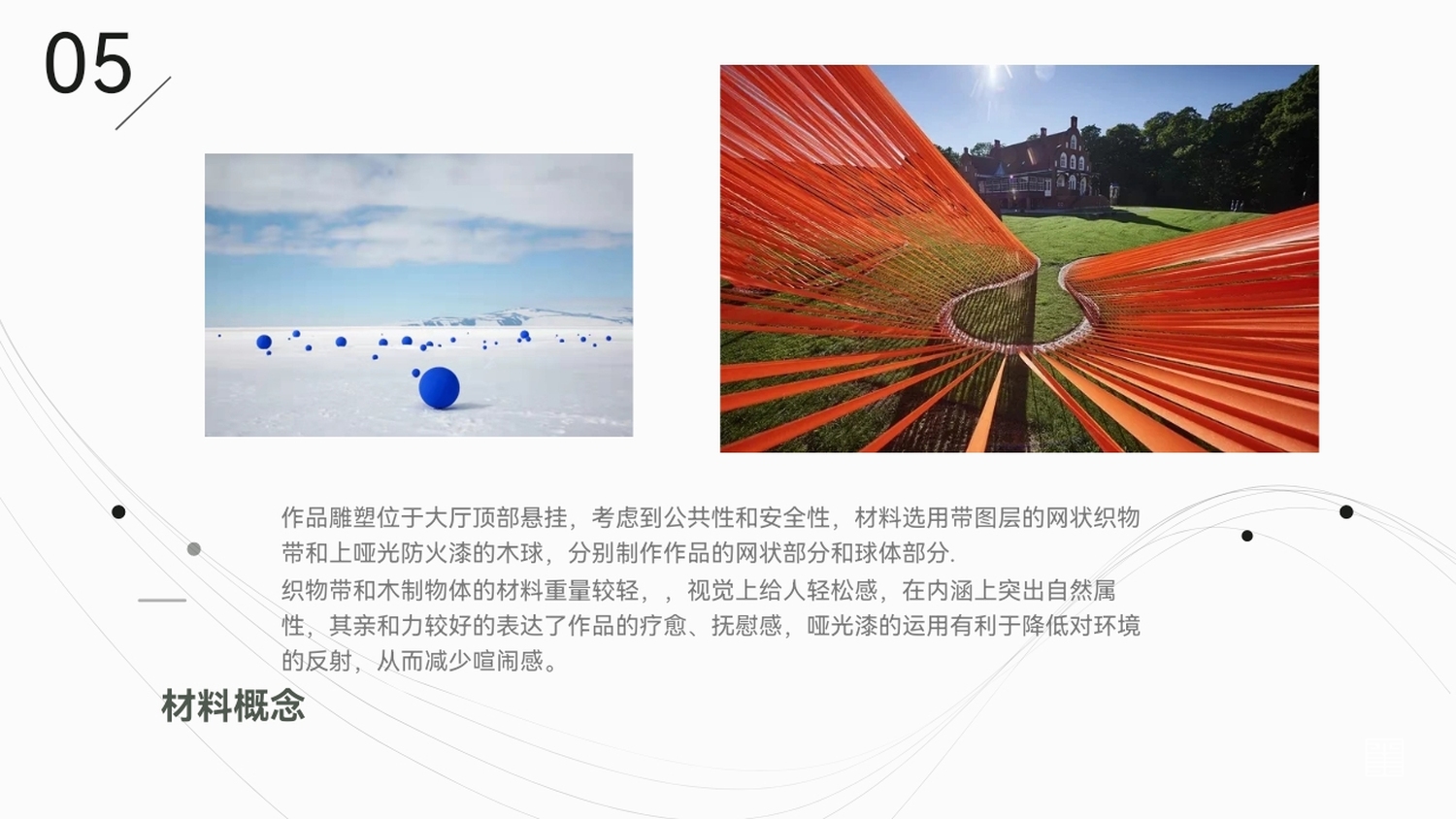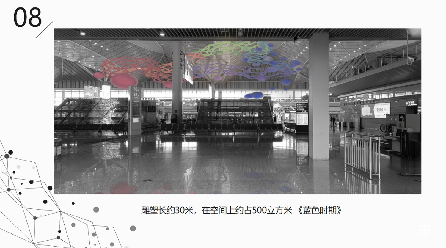 整个作品的动势贴合大厅顶部波浪形状的走势,与空间产生联系。