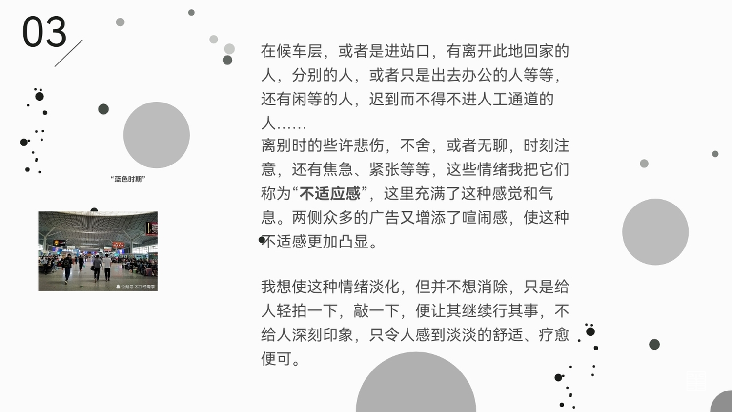 离别时的些许悲伤,不舍,或者无聊,时刻注意,还有焦急、紧张等等,这些情绪我把它们称为“不适应感”,这里充满了这种感觉和气息。两侧众多的广告又增添了喧闹感,使这种不适感更加凸显。