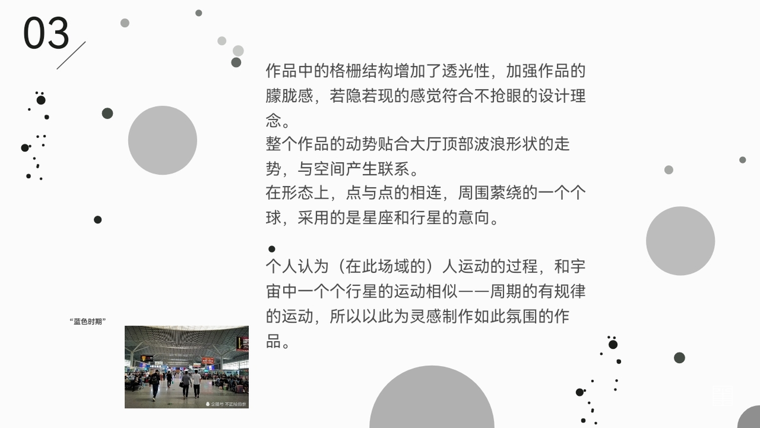 个人认为(在此场域的)人运动的过程,和宇宙中一个个行星的运动相似——周期的有规律的运动,所以以此为灵感制作如此氛围的作品。